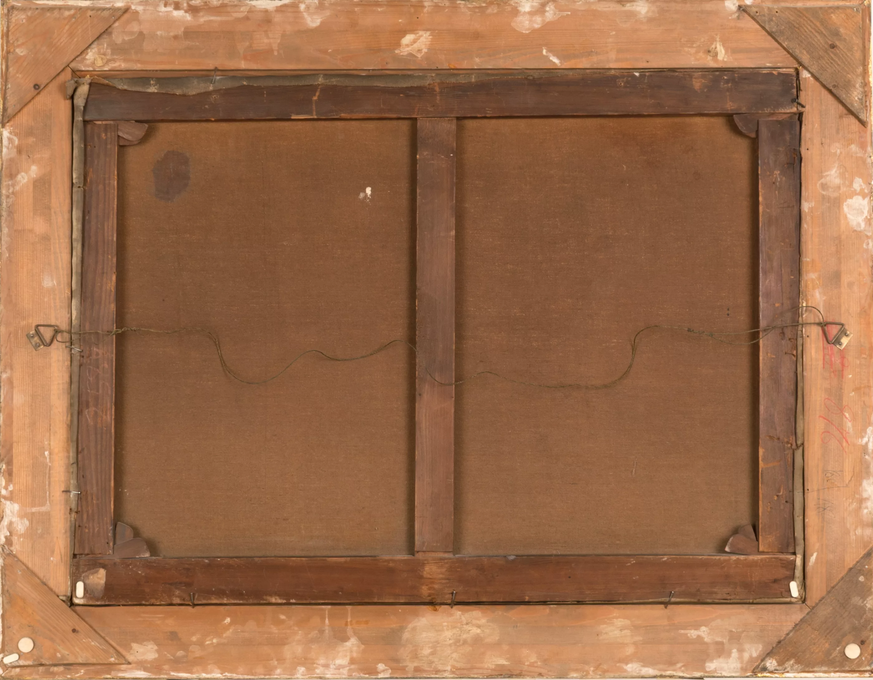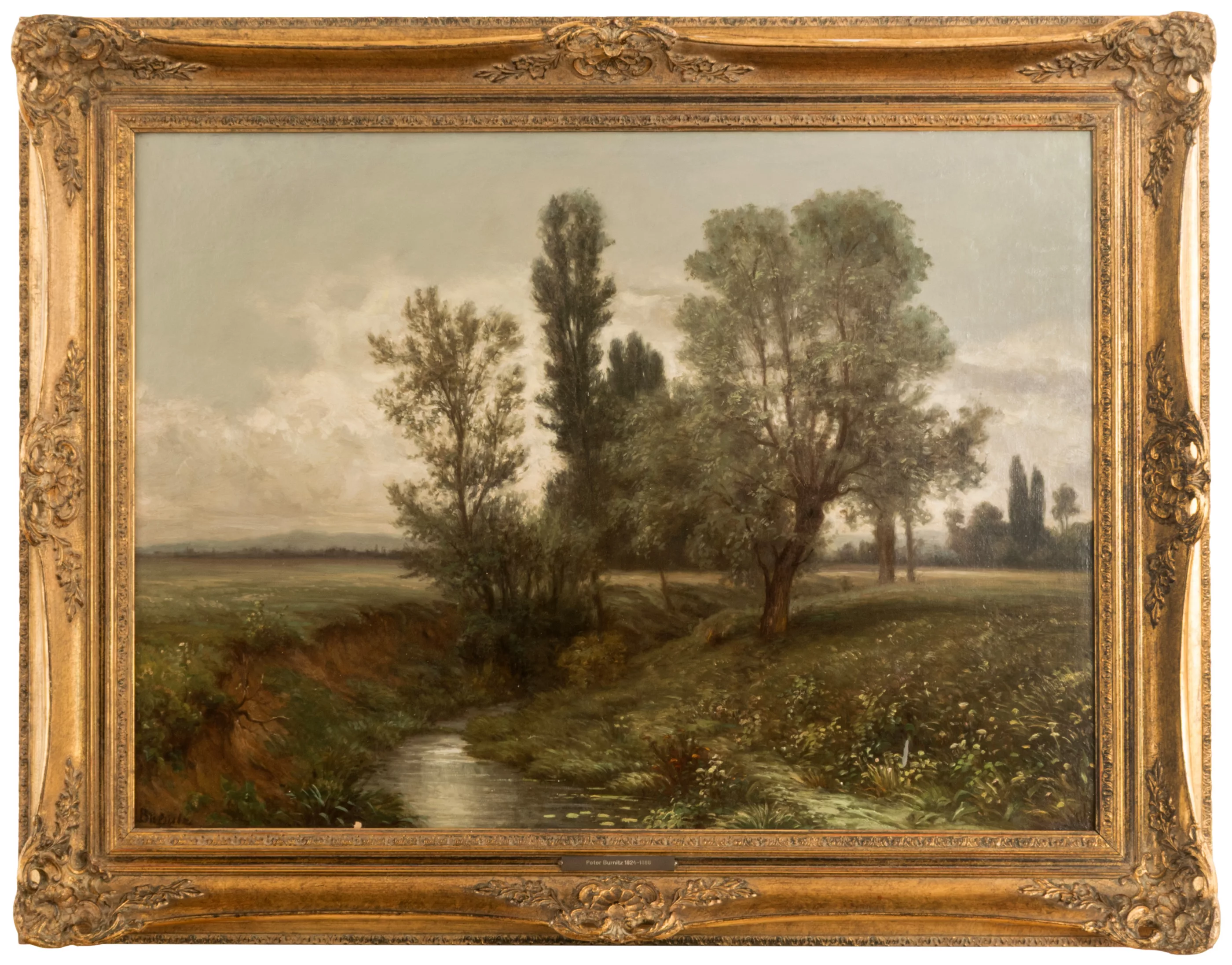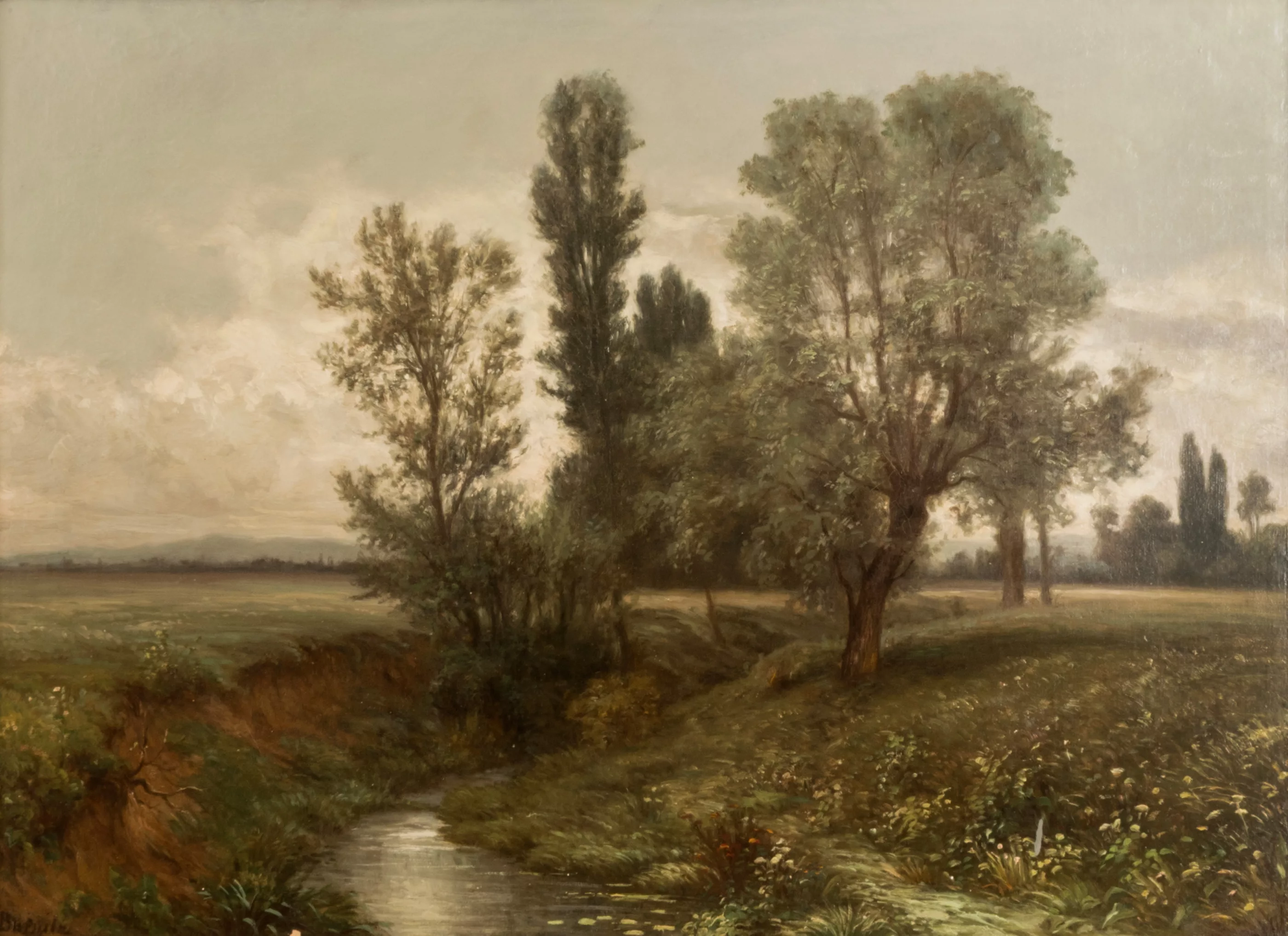 Flusslandschaft, Öl auf Leinwand, 60 cm x 81 cm Leinwandmaß, signiert, craqueliert mit Rissen und Farbabplatzern