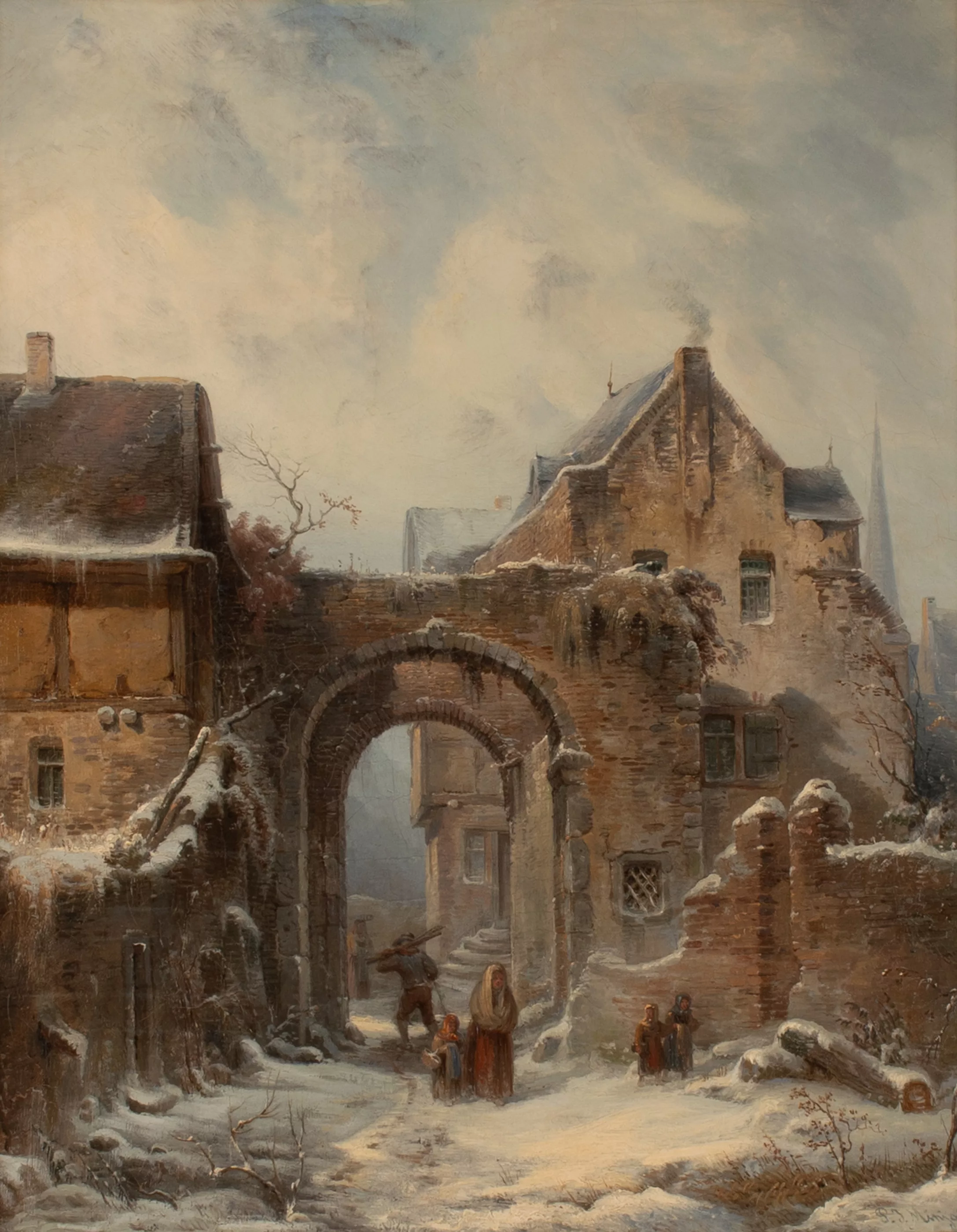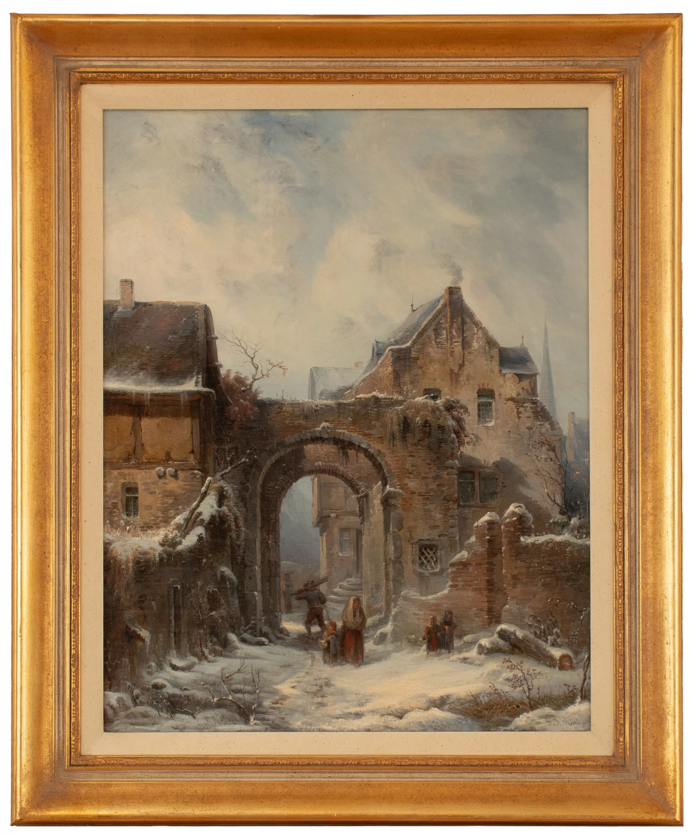 Winterliche Stadtansicht, Öl auf Leinwand, 57 cm x 46 cm Leinwandmaß, signiert, craqueliert