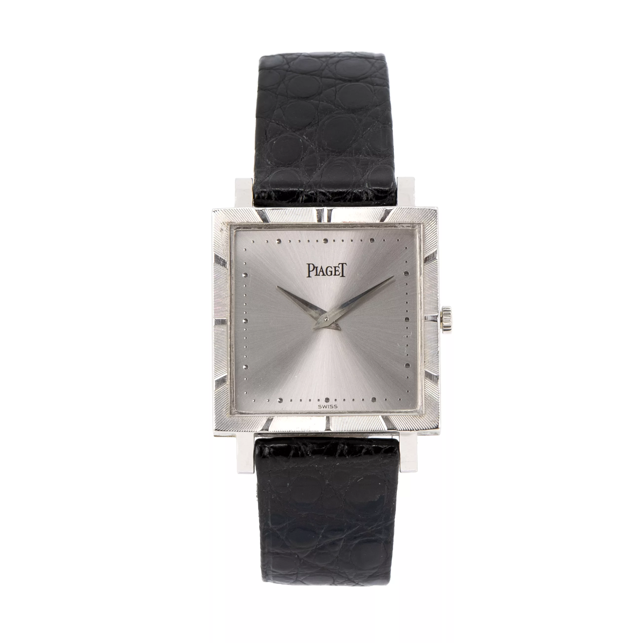 Handaufzug, Individual-Nr. 93306 | Ref.-Nr. 927, Gehäuse Weißgold, Maße 25 mm x 25 mm, Original-Armband, Leder, Original-Schließe, 750 Weißgold punziert, Länge 17,5 cm, verstellbar, Gesamtgewicht ca. 28,5 g, Funktion gangbar, geprüft, Zustand gut, Zustand und Funktionalität durch unseren Uhrmachermeister geprüft, ohne Original-Box oder -Papiere,