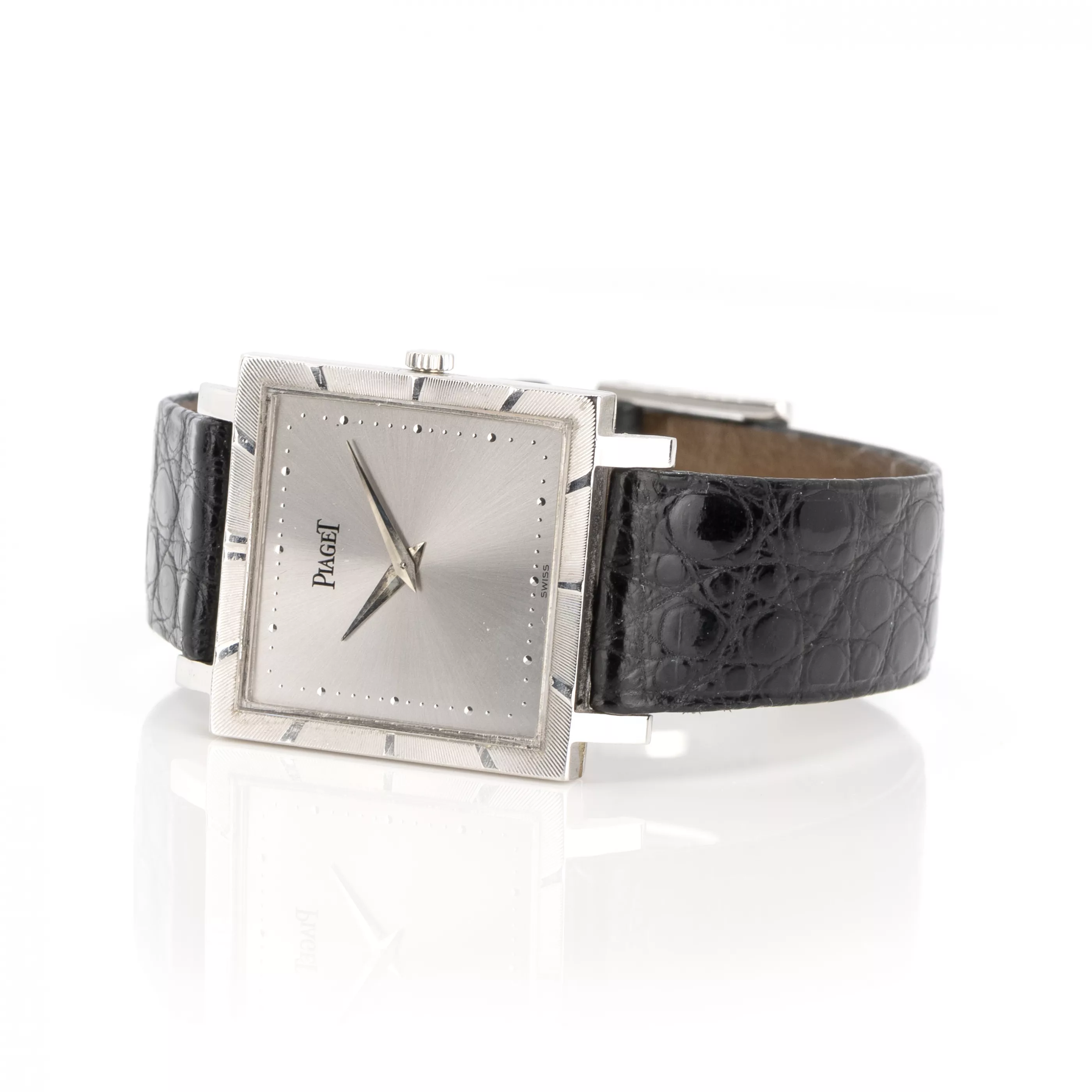 Manual winding, individual no. 93306 | ref. no. 927, white gold case, dimensions 25 mm x 25 mm, original bracelet, leather, original clasp, 750 white gold hallmarked, length 17.5 cm, adjustable, total weight approx. 28.5 g, functional, tested, condition good, condition and functionality tested by our master watchmaker, without original box or papers, note: The buyer's premium is 25% incl. VAT. For the use of the online bidding consoles there is an additional fee of 3% plus VAT (3.57%).