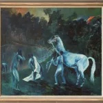 'An der Tränke', oil on canvas, 71 cm x 80 cm canvas dimensions, signed, signed on the verso, dated 70, titled, slightly craquelured, small paint chips, partially retouched, glued on the verso in two places