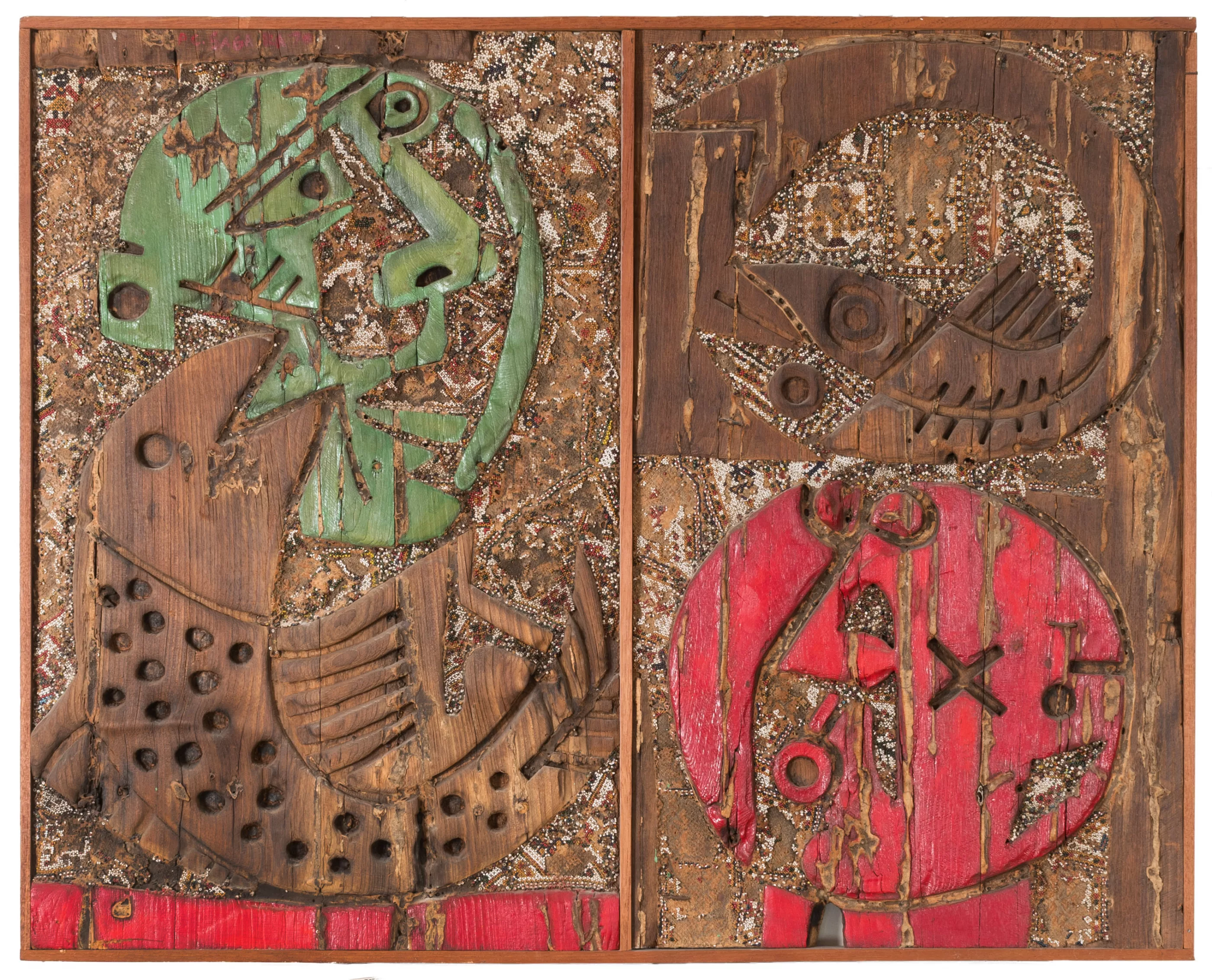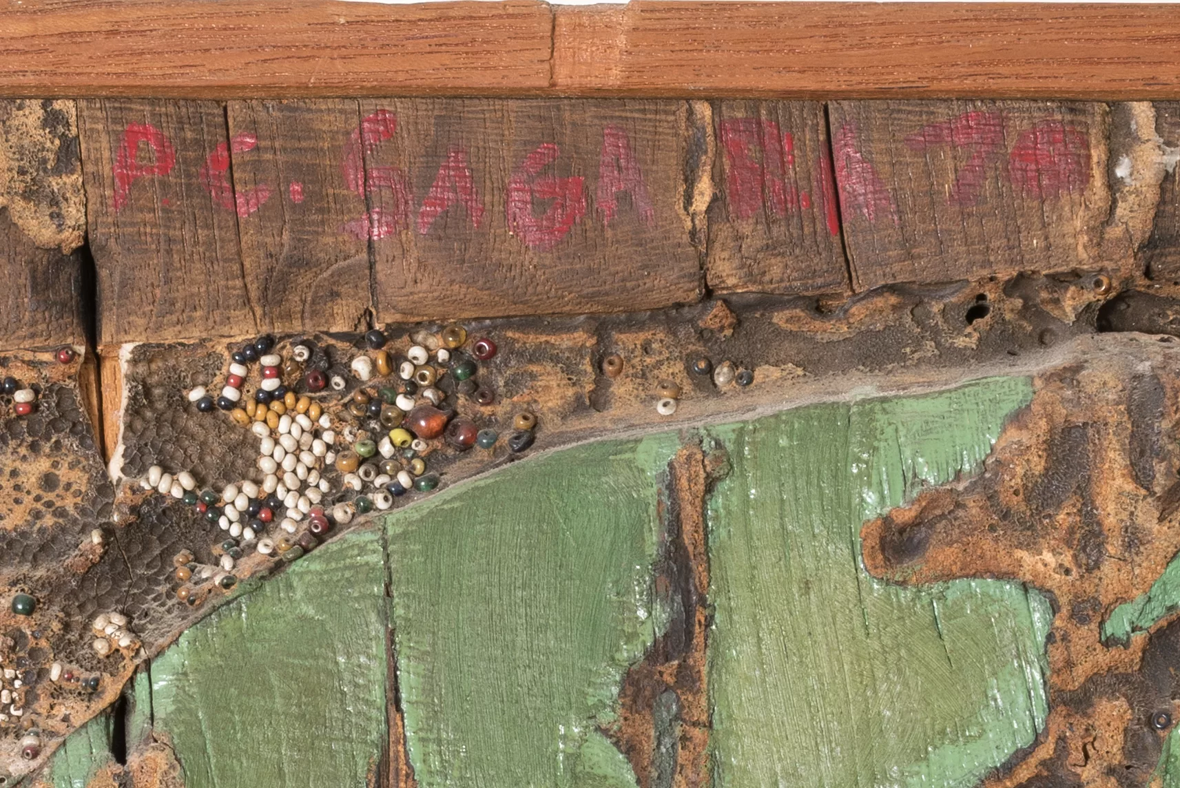 'Witness of Beginning', mixed media with wood, 82 cm x 102 cm object dimensions, signed, dated 78, partial flaking, frame broken off at the edge, provenance: Gallery Chemould, Bombay (verso gallery label)