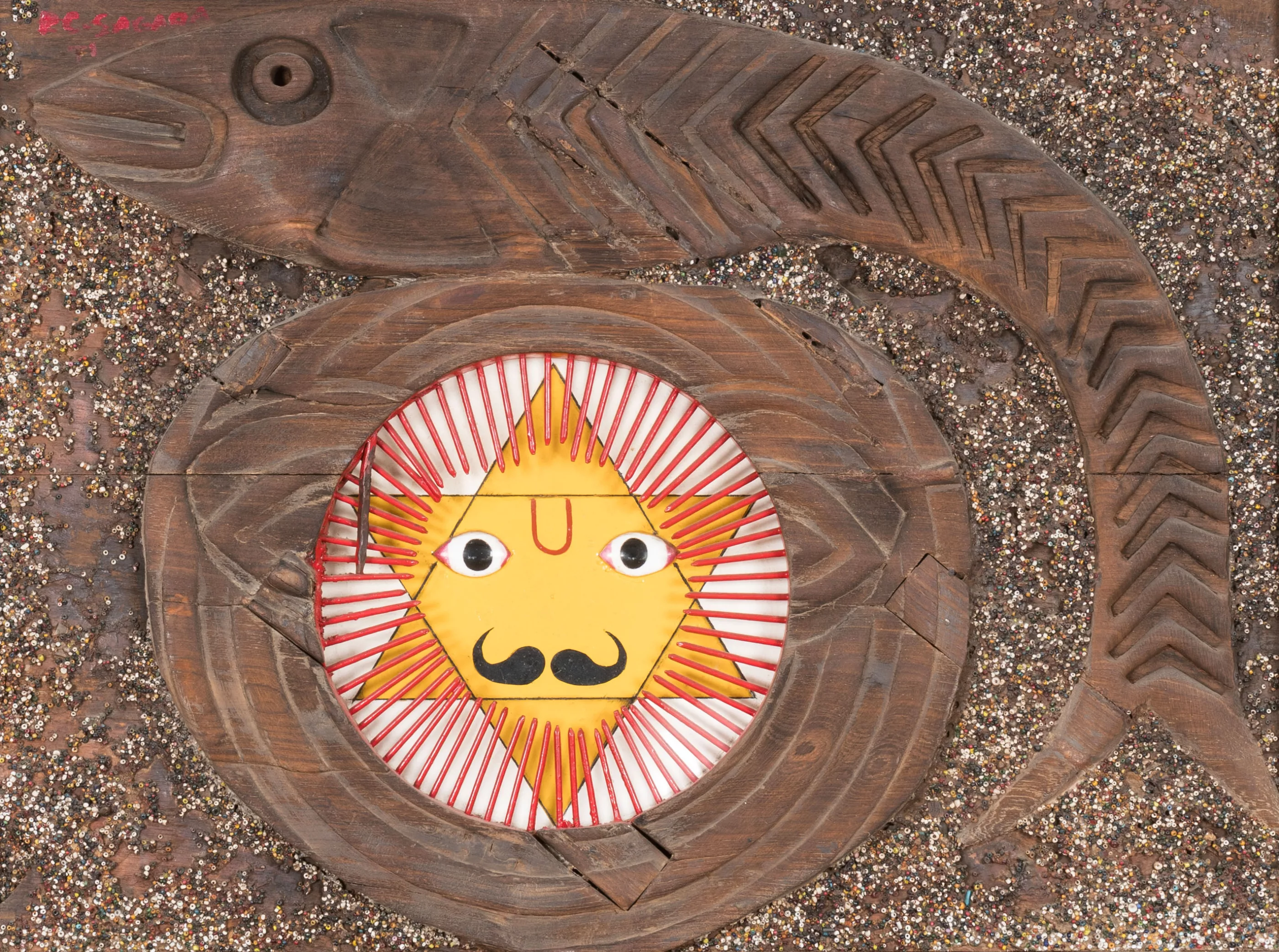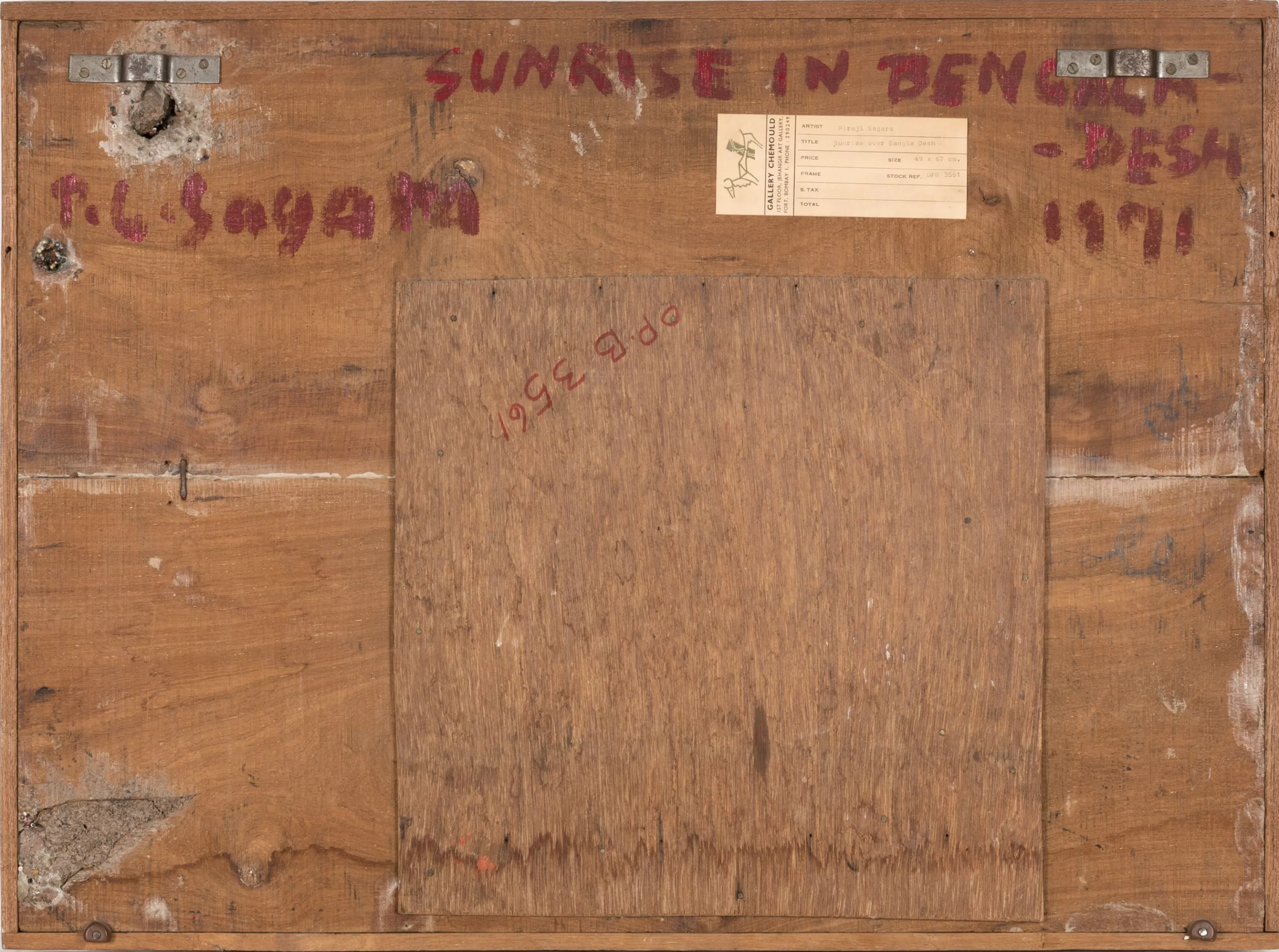 'Sunrise over Bangla Desh', mixed media on wood, 49 cm x 67 cm object dimensions, signed, signed and titled on verso, some flaking, frame broken off at the edge, provenance: Gallery Chemould, Bombay (gallery label on the reverse)