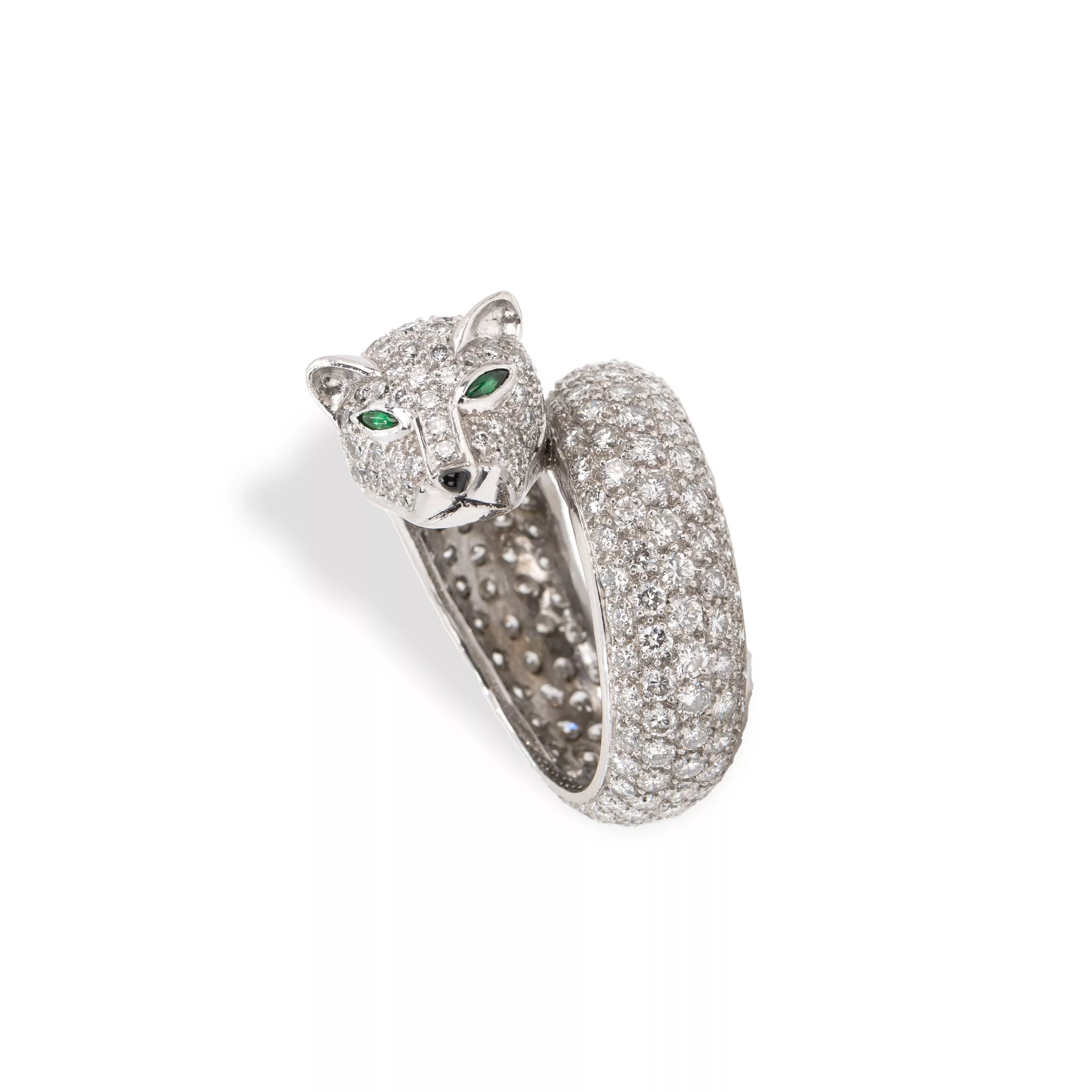Raubkatzenring mit Brillantbesatz750 Weißgold, geprüft, ca. 250 Diamanten im Brillantschliff, gesamt ca. 5,00 ct, G-H, vvs-si, 2 Smaragde...