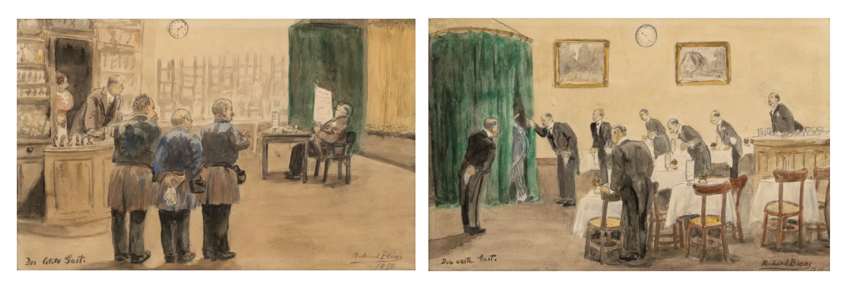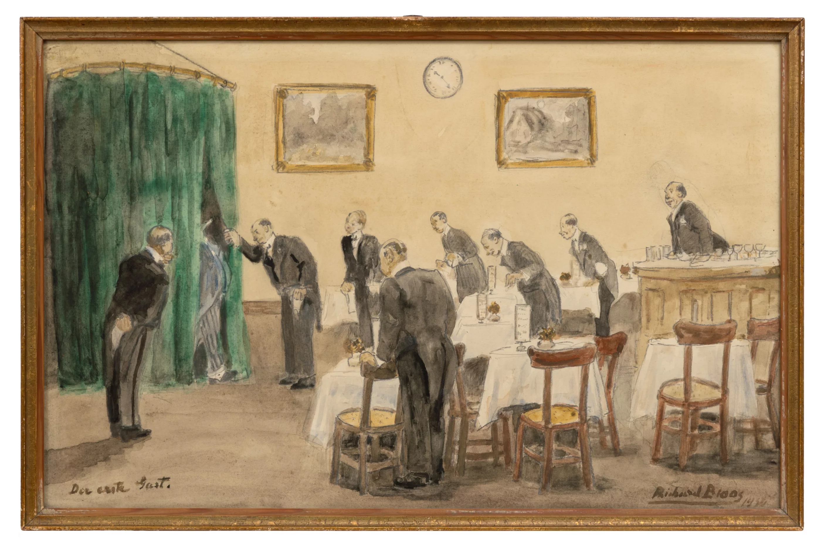 'Der erste Gast' und 'Der letzte Gast', 2-tlg., jeweils Mischtechnik mit Aquarell auf Papier, 31 cm x 49 cm Sichtmaß, signiert, 1950 datiert, betitelt, leicht gewellt