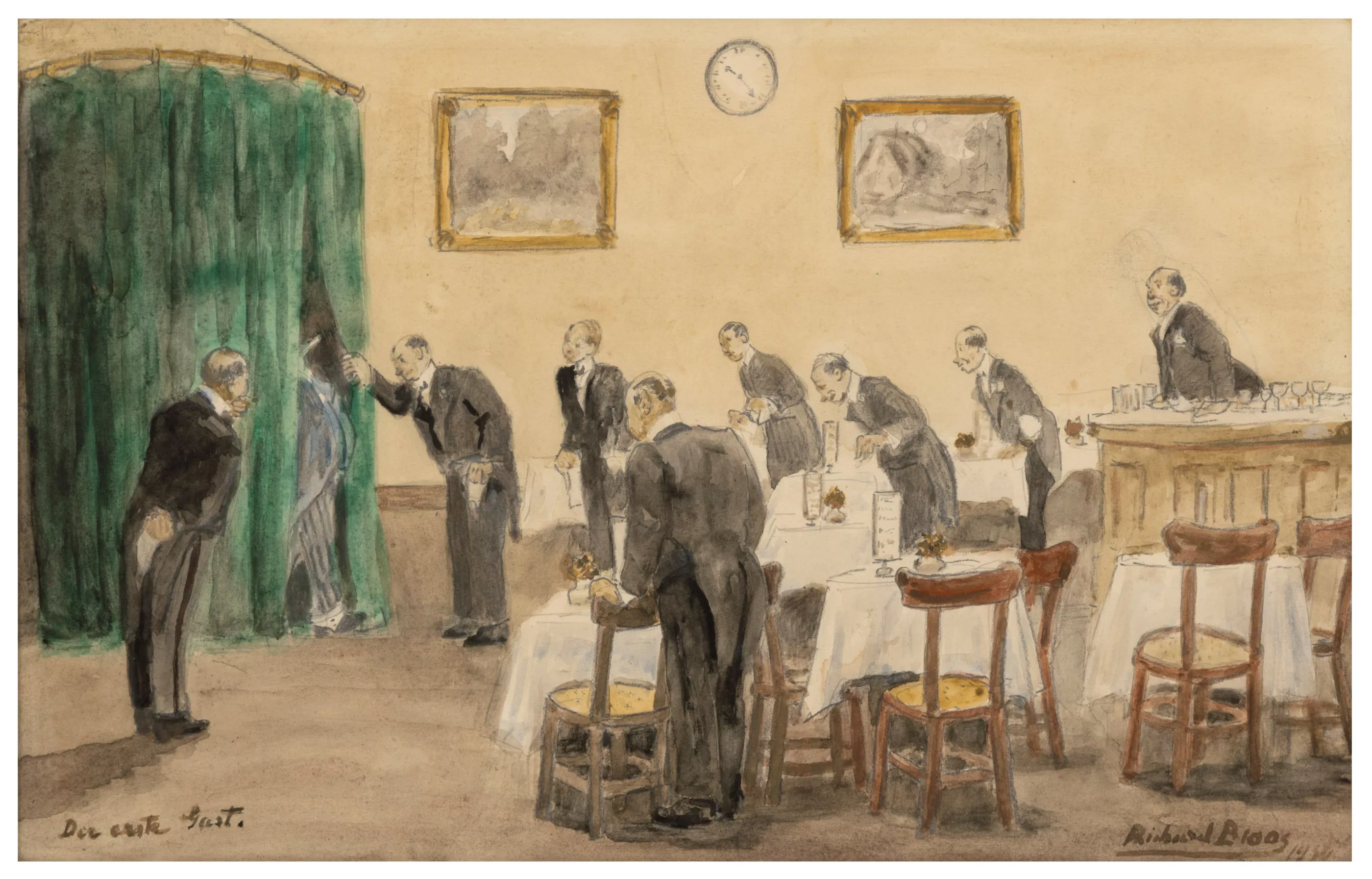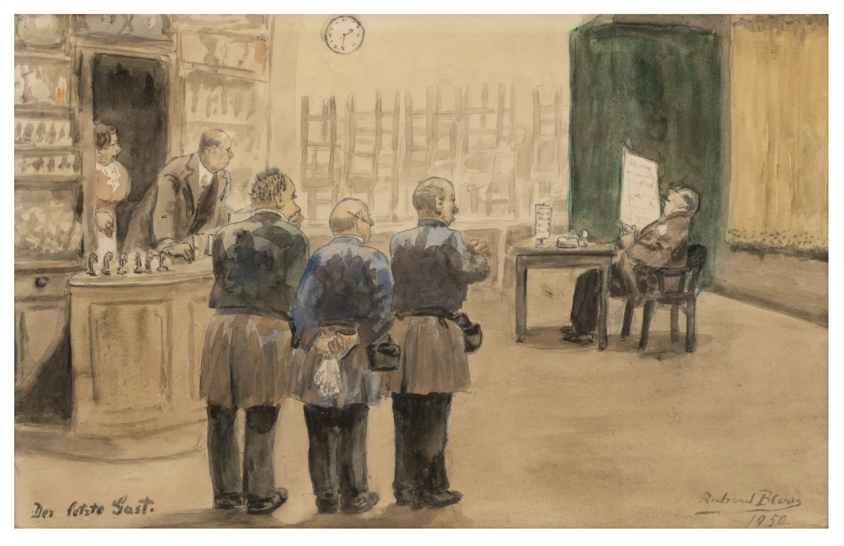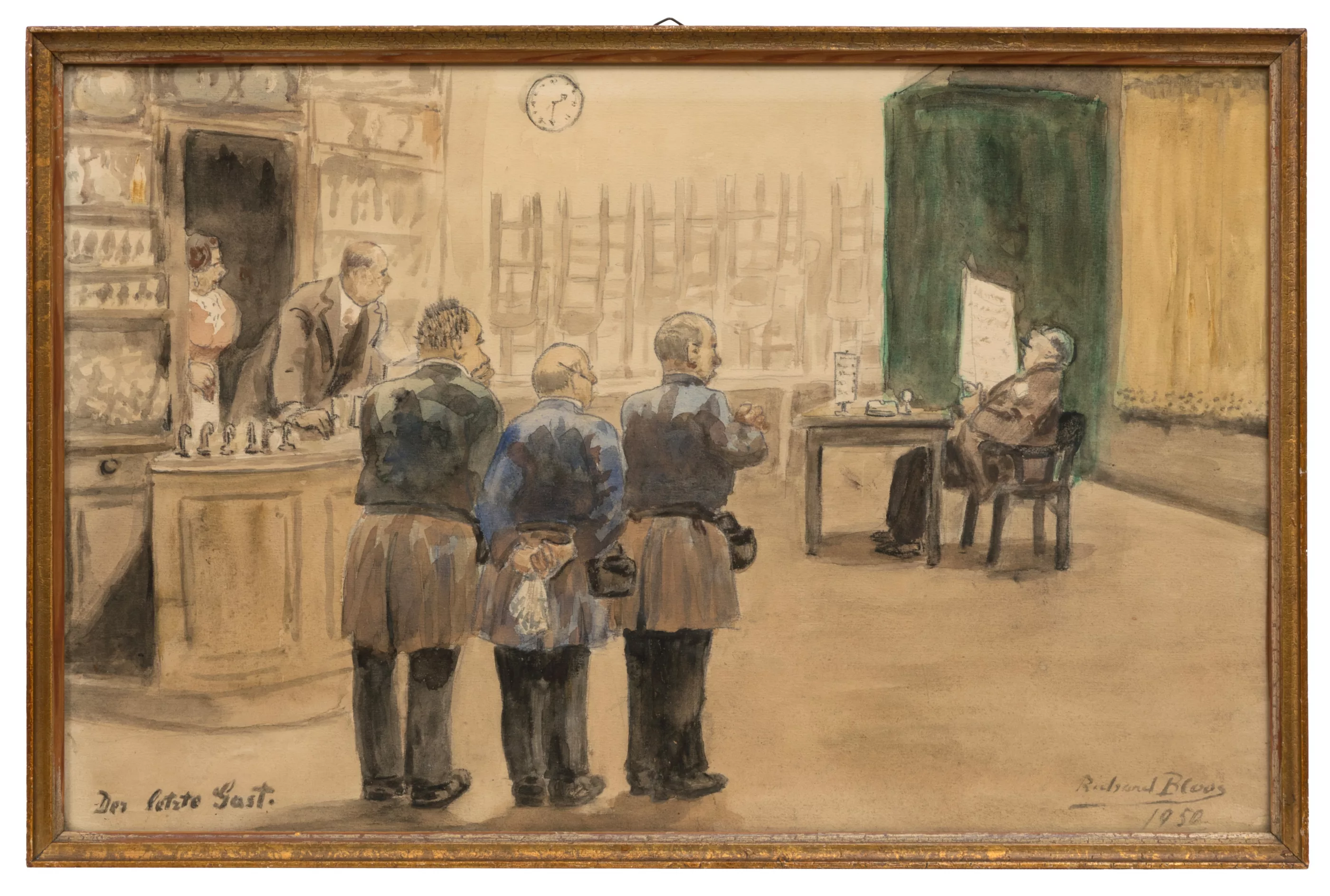 'Der erste Gast' und 'Der letzte Gast', 2-tlg., jeweils Mischtechnik mit Aquarell auf Papier, 31 cm x 49 cm Sichtmaß, signiert, 1950...