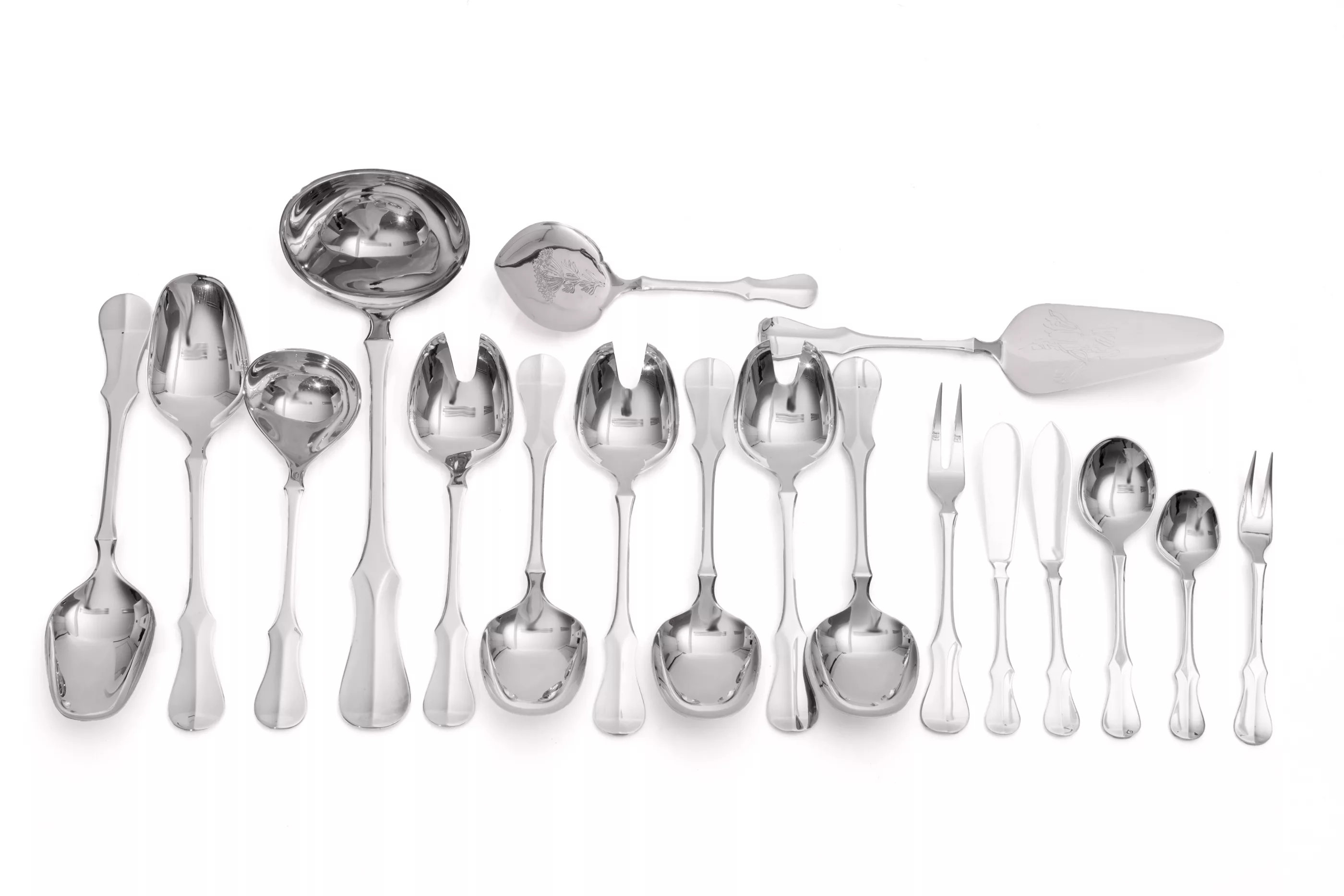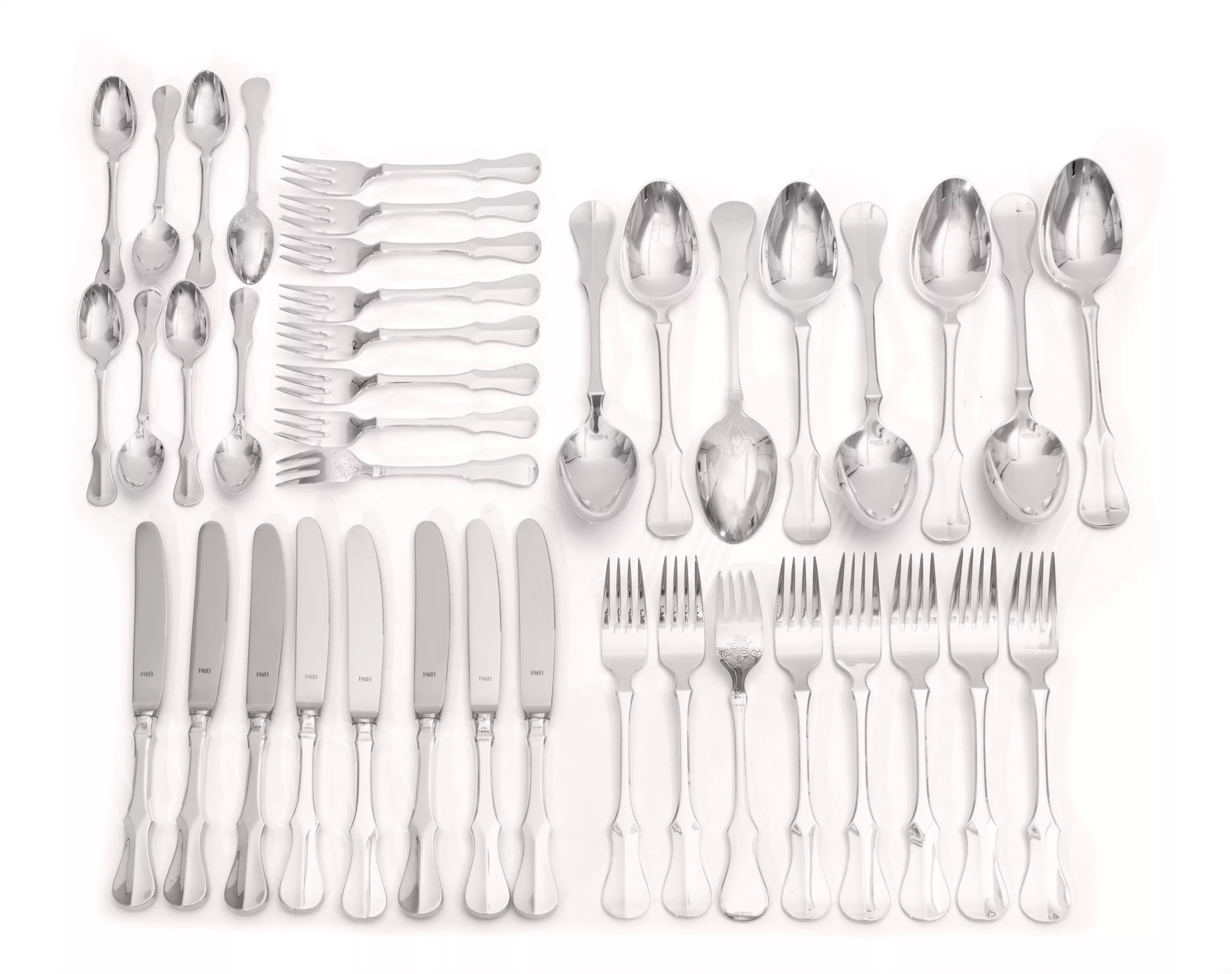 57-tlg., Robbe & Berking, Deutschland, 20. Jh., 800 Silber, punziert, Manufakturmarke, Feingehalt, Halbmond und Krone, 8 Menülöffel, 8 Menügabeln, 8 Menümesser, 8 Kaffeelöffel, 8 Kuchengabeln, 2 Gemüselöffel, 3 Salatlöffel groß, 3 Salatgabeln groß, 1 Suppenschöpfer, 1 Fleischgabel groß, 1 Fleischgabel klein, 1 Tortenheber, 1 Gebäckheber, 1 Tassenlöffel, 1 Zuckerlöffel, 1 Butter- und Käsemesser, dazu 1 Saucenlöffel Dekor 'Alt Kopenhagen', versilbert, Gesamtgewicht (ohne Messer) ca. 2.585 g, mit leichten Polier- und Gebrauchsspuren, Besteckkasten mit Gebrauchsspuren, ohne Einlagen