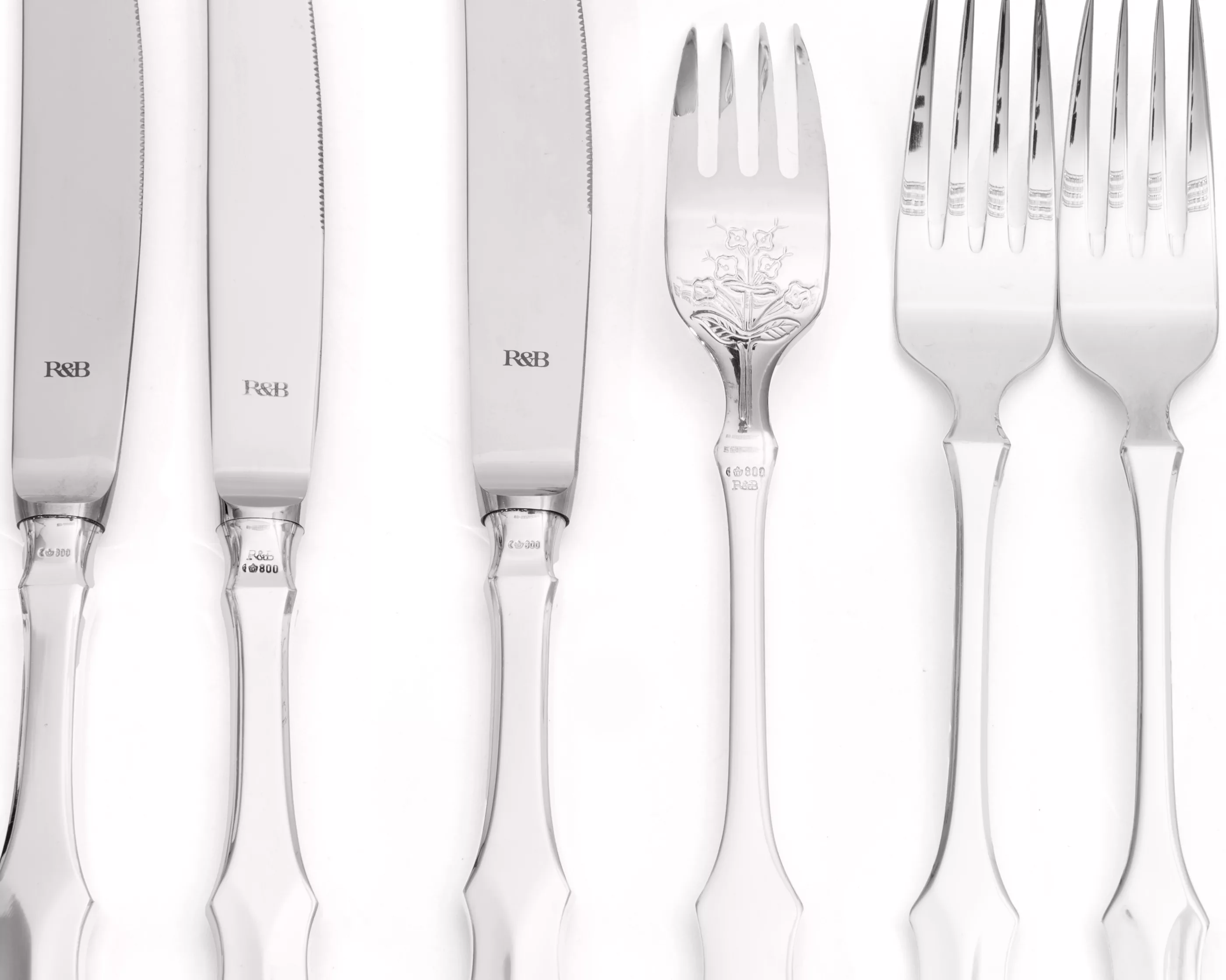57-piece set, Robbe & Berking, Germany, 20th century, 800 silver, hallmarked, maker's mark, hallmark, crescent and crown, 8 dinner spoons, 8 dinner forks, 8 dinner knives, 8 coffee spoons, 8 cake forks, 2 vegetable spoons, 3 large salad spoons, 3 large salad forks, 1 soup ladle, 1 meat fork large, 1 meat fork small, 1 cake server, 1 pastry server, 1 cup spoon, 1 sugar spoon, 1 butter and cheese knife, plus 1 sauce spoon 'Old Copenhagen' decor, silver-plated, total weight (without knives) approx. 2,585 g, with slight signs of polishing and wear, cutlery tray with signs of wear, without inlays
