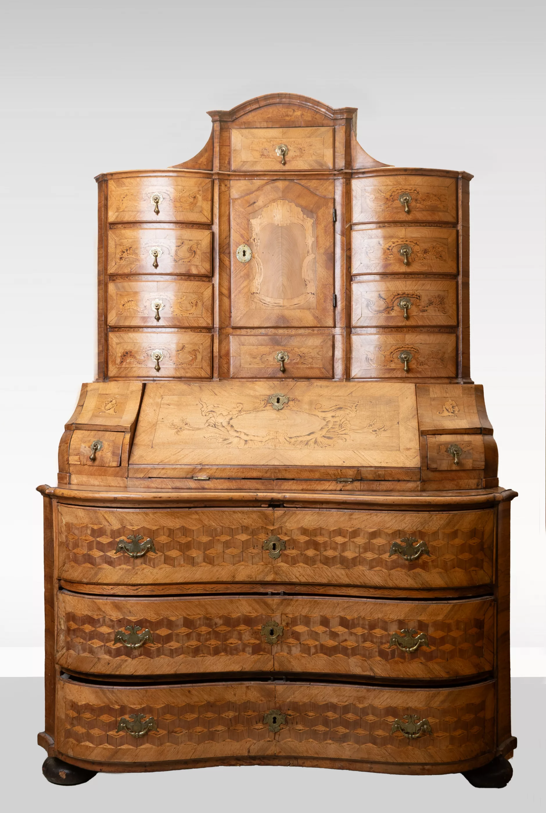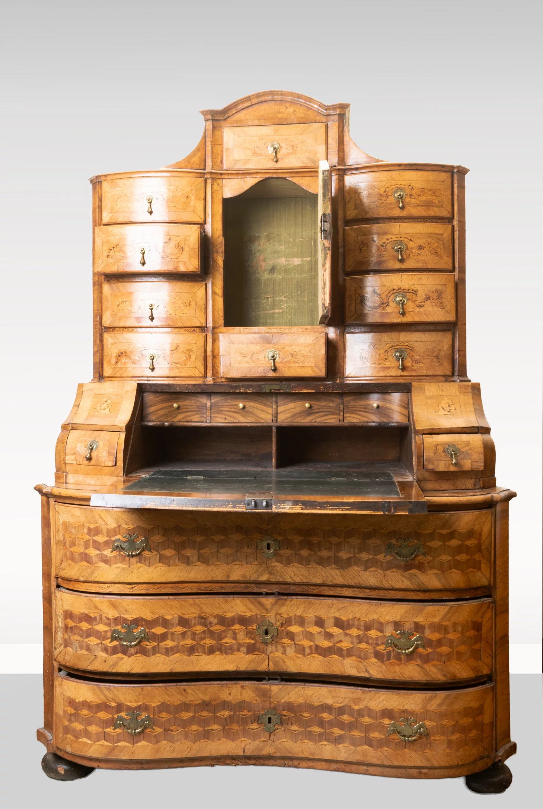 Deutschland, 1. Hälfte 18. Jh., Nussbaum furniert, geschwungenes Kommodenunterteil auf Kugelfüßen mit drei Schüben, Aufsatz oberhalb der mit Leder bezogenen Schreibfläche mit zehn weiteren Schüben und einem eintürigen Fach, dass mit grünlicher, leinwandbindiger Seide ausgeschlagen ist, Würfelmarquetterien auf dem Unterbau, Rocaillen, sowie Muscheln aus mit Tusche behandeltem Ahorn, Alters- und Gebrauchsspuren, partiell Furnier- und Holzschäden sowie -abplatzer, Front stärker ausgeblichen, Seide partiell nicht mehr existent, Zustand B