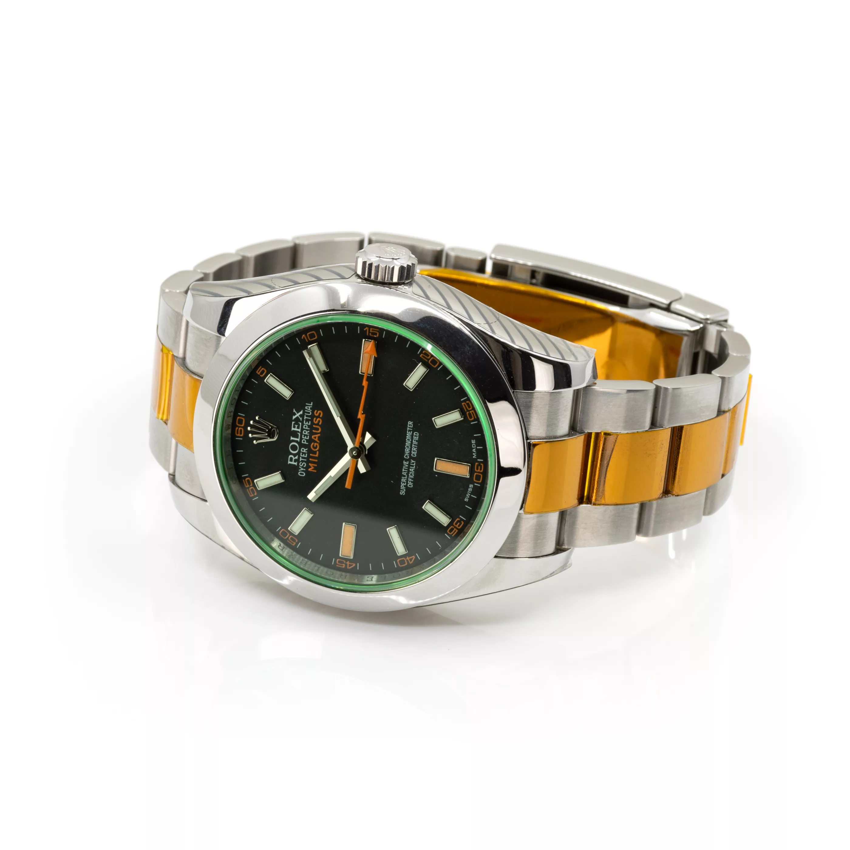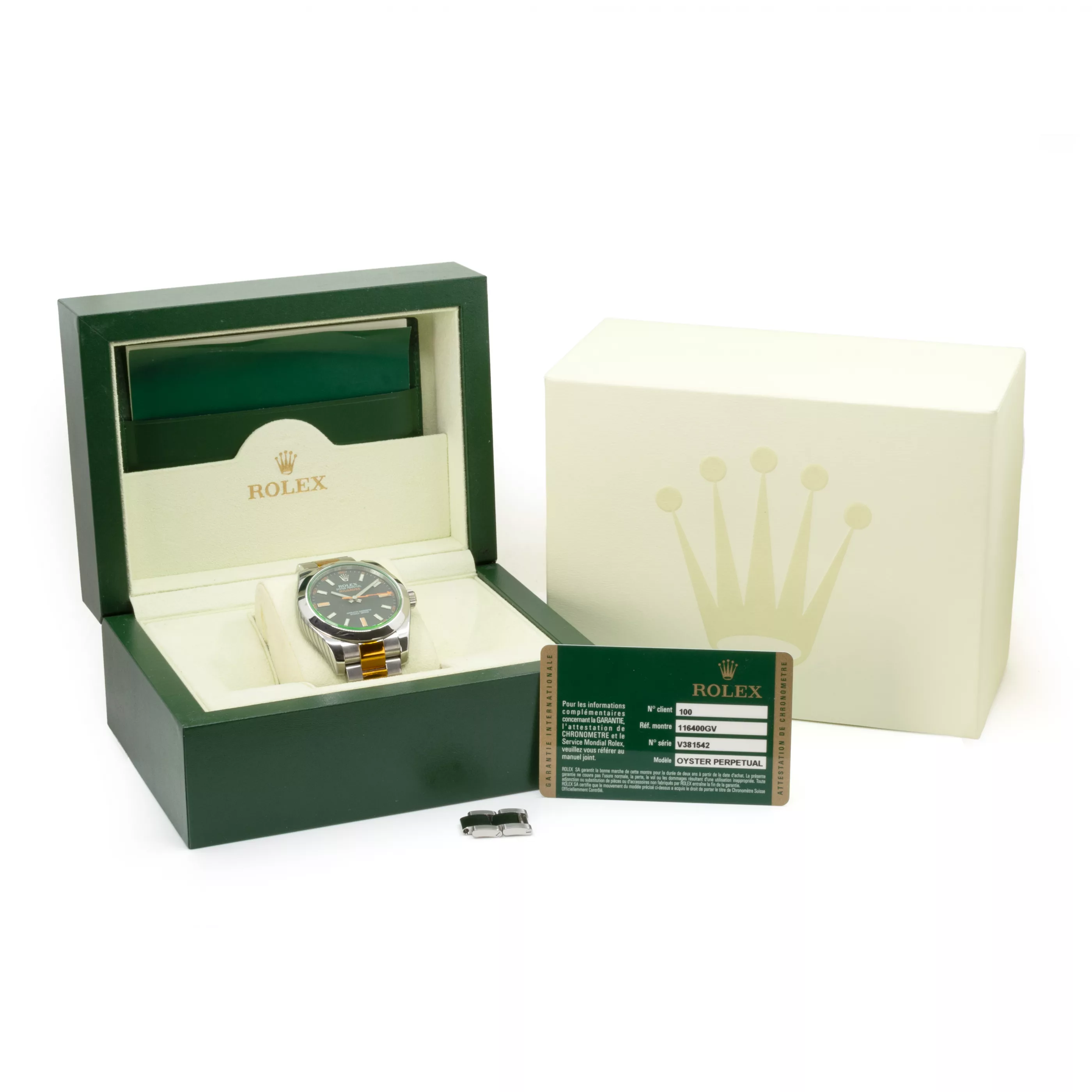 Full-Set, Jahr 2009, Automatik, grünes Saphirglas, blitzförmiger Sekundenzeiger, Leuchtzeiger, Leuchtindizes, Serien-Nr. V381542 | Ref.-Nr 116400GV, Gehäuse Stahl, Durchmesser 40 mm, Original-Armband, Stahl, mit Tauchverlängerung, Original-Faltschließe, Stahl, Länge 17 cm, Gesamtgewicht ca. 150 g, Funktion gangbar, geprüft, revisioniert (2016), Gehäuse, Armband und Schließe nach Revision original verklebt, Zustand gut, Zustand und Funktionalität durch unseren Uhrmachermeister geprüft, mit Original-Box, -Umverpackung und -Papieren, Umverpackung gut, Box gut, Original-Etui mit Garantiekarte, Bedienungsanleitung, Garantieheft, 2 Ersatzglieder anbei, Länge 2 cm, Anmerkung: Das Aufgeld beträgt für dieses Los 14,28% inkl. MwSt. Für die Nutzung der Online-Bietkonsolen fällt eine zusätzliche Gebühr in Höhe von 3% zzgl. MwSt. (3,57%) an.