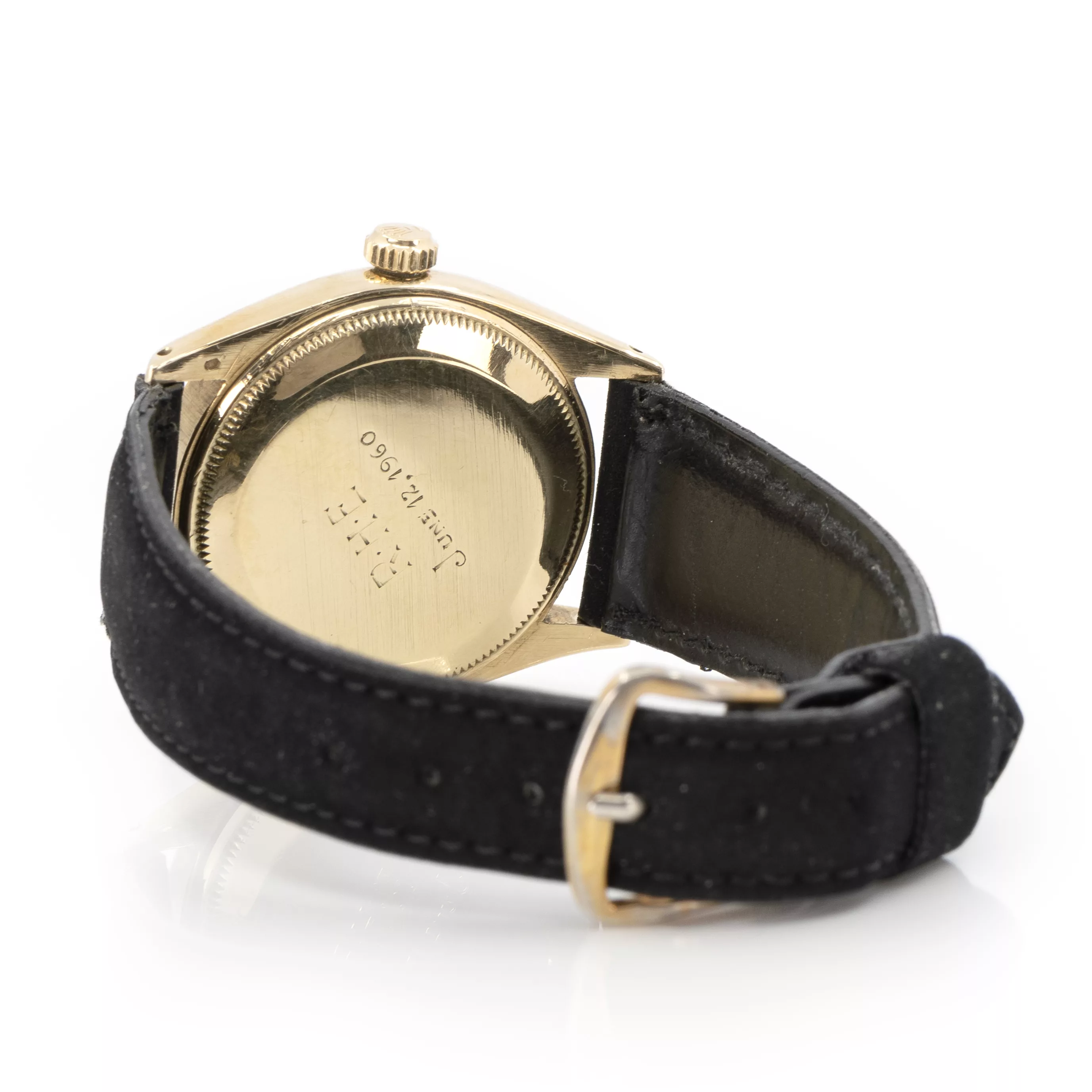 vintage, automatic, case 14k yellow gold, hallmarked, diameter 34 mm, bracelet replaced, leather, clasp replaced, steel gold-plated, length 19,5 cm, adjustable, total weight approx. 43,4 g, functional, tested, needs a service, condition good, dial refurbished, RHE June 12, 1960 engraved, condition and functionality tested by our master watchmaker, without original box or papers, note: The buyer's premium is 25% incl. VAT. For the use of the online bidding consoles there is an additional fee of 3% plus VAT (3.57%).