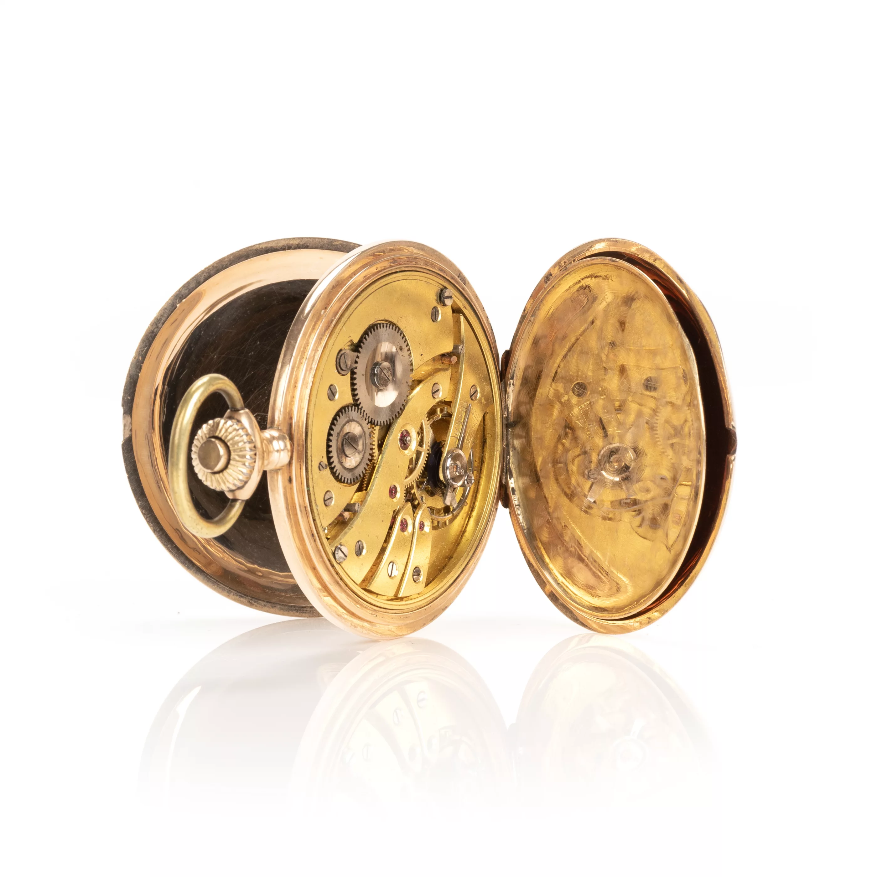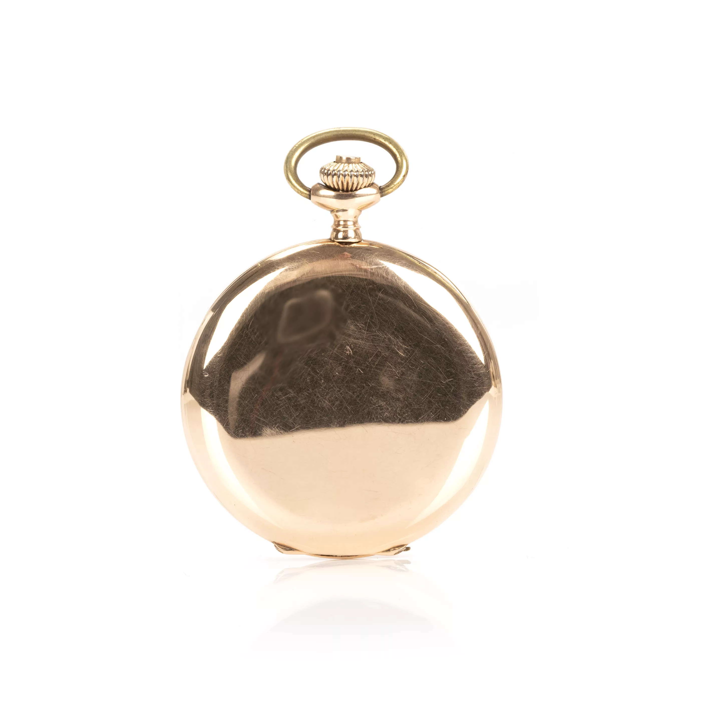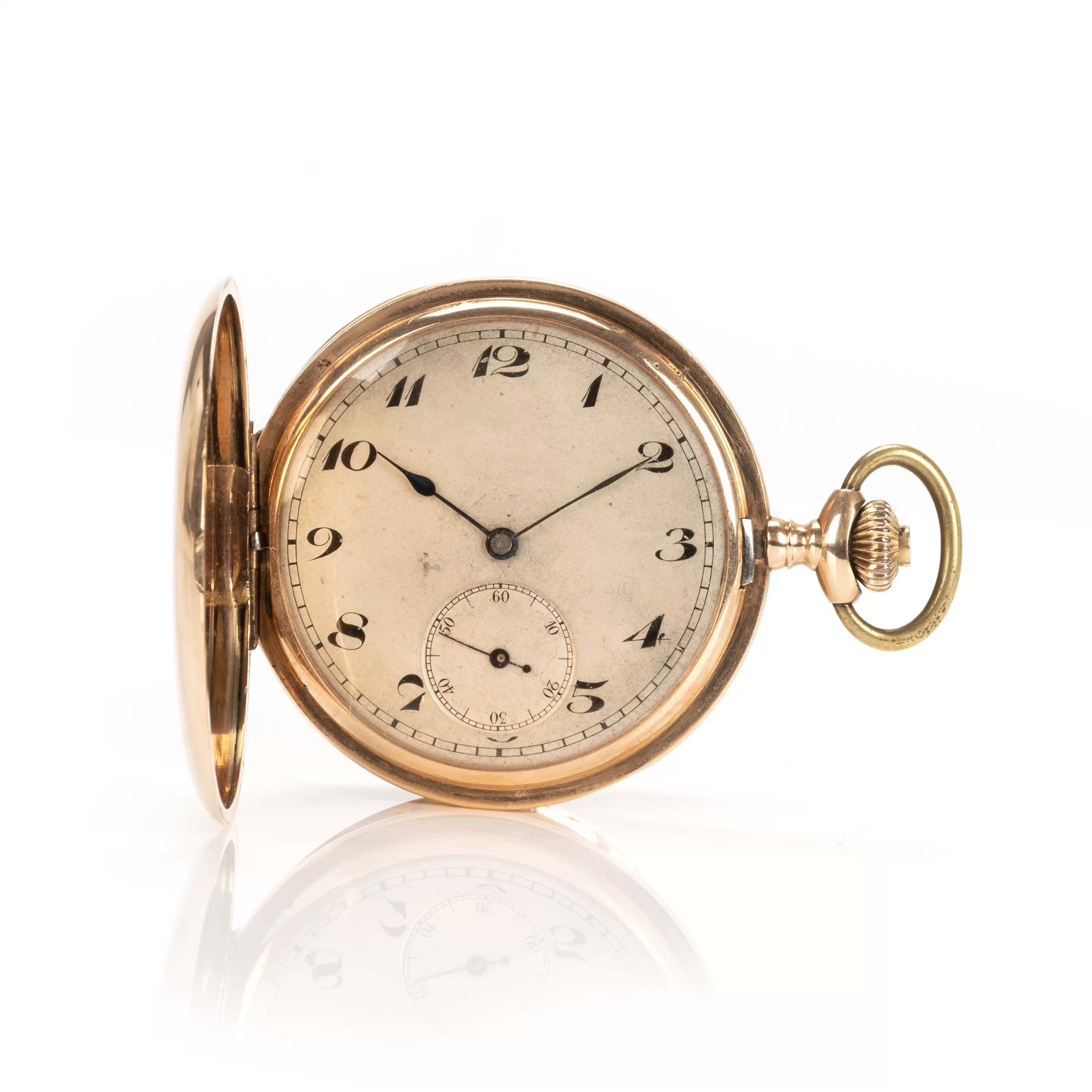 Circa 1900, crown-wound, metal dial with Arabic numerals, small seconds, case no. 114, case 585 red gold, hallmarked, intermediate cover 585 red gold, tested, diameter 50 mm, total weight approx. 72.8 g, functional, tested, condition good, minute hand replaced, condition and functionality tested by our master watchmaker, note: The buyer's premium is 25% incl. VAT. For the use of the online bidding consoles there is an additional fee of 3% plus VAT (3.57%).