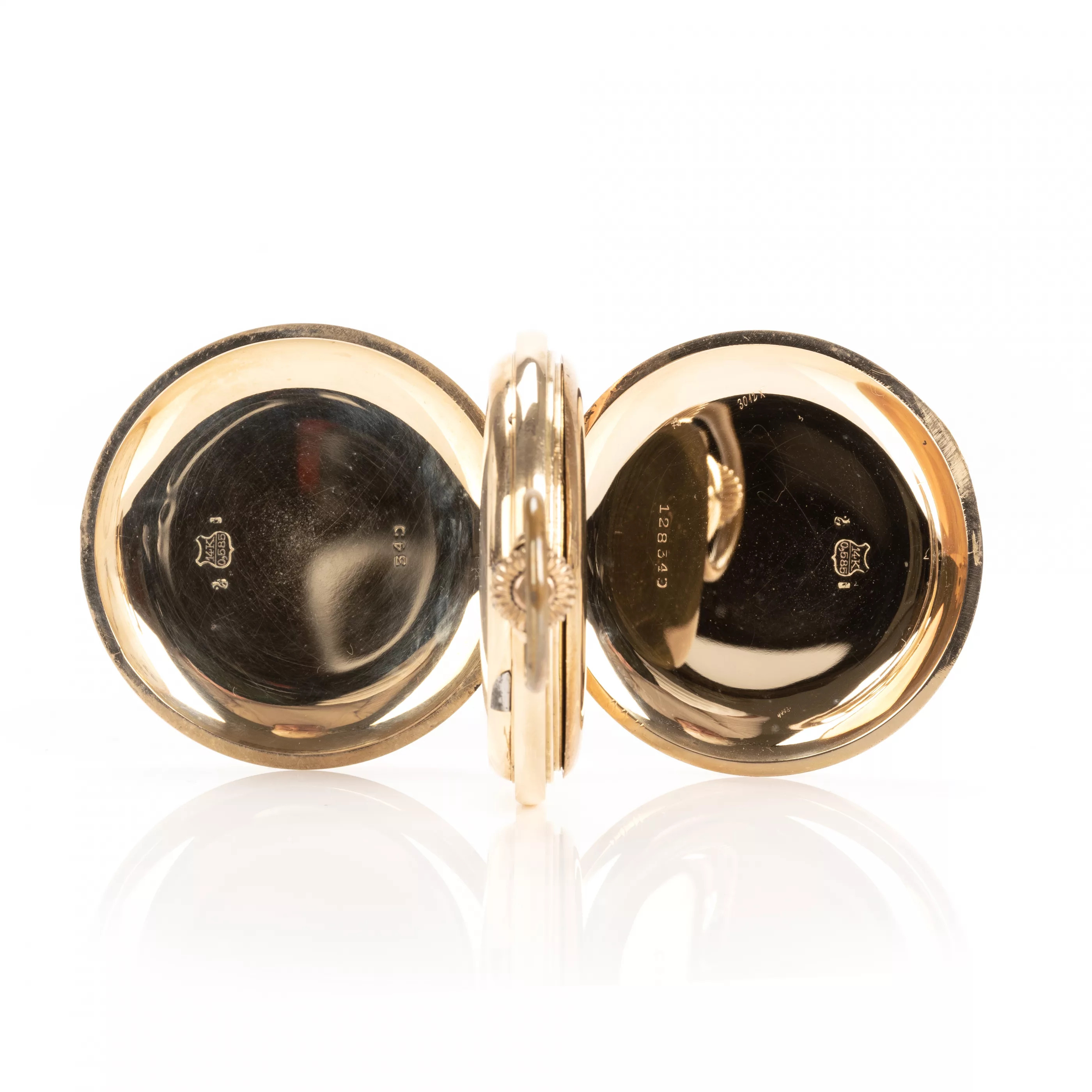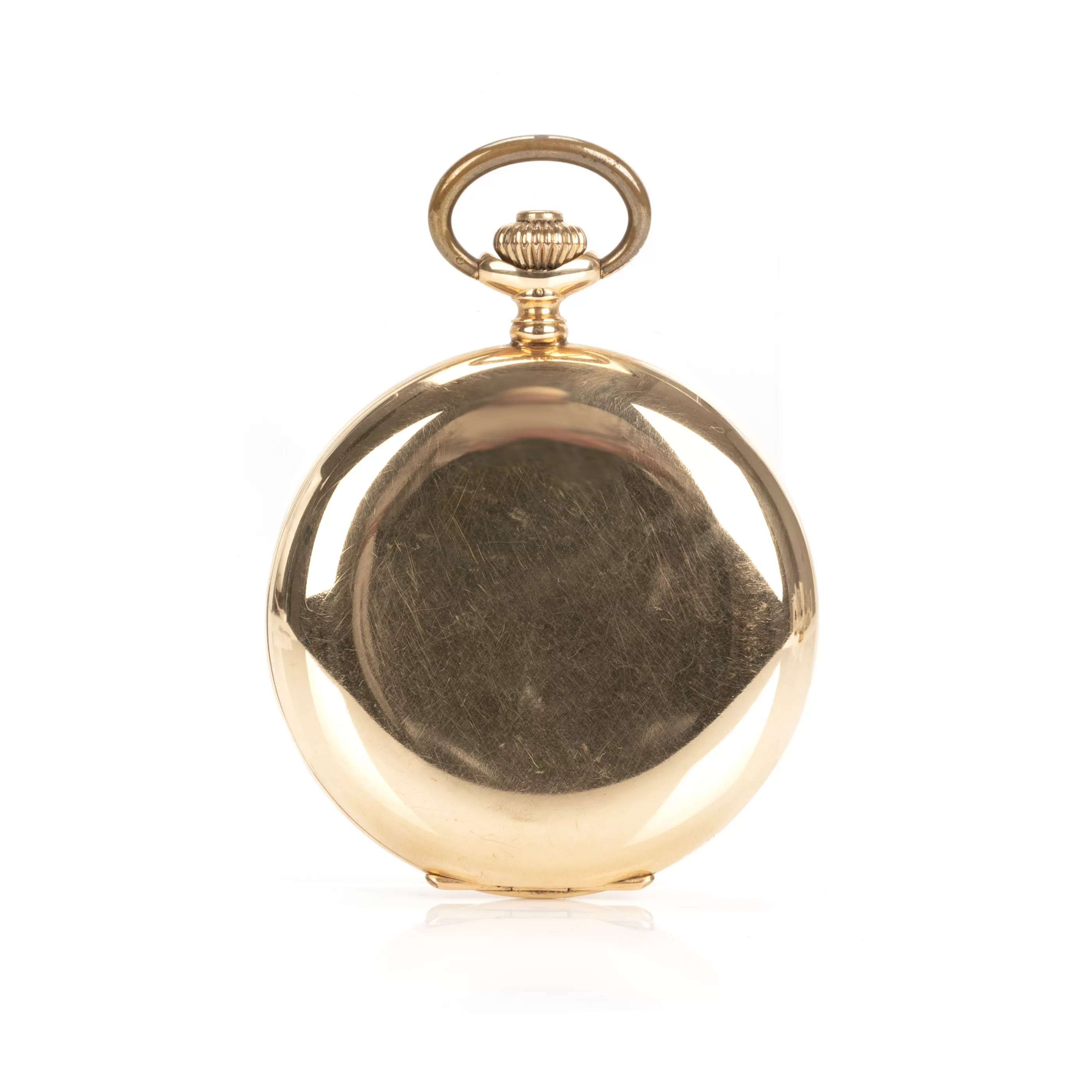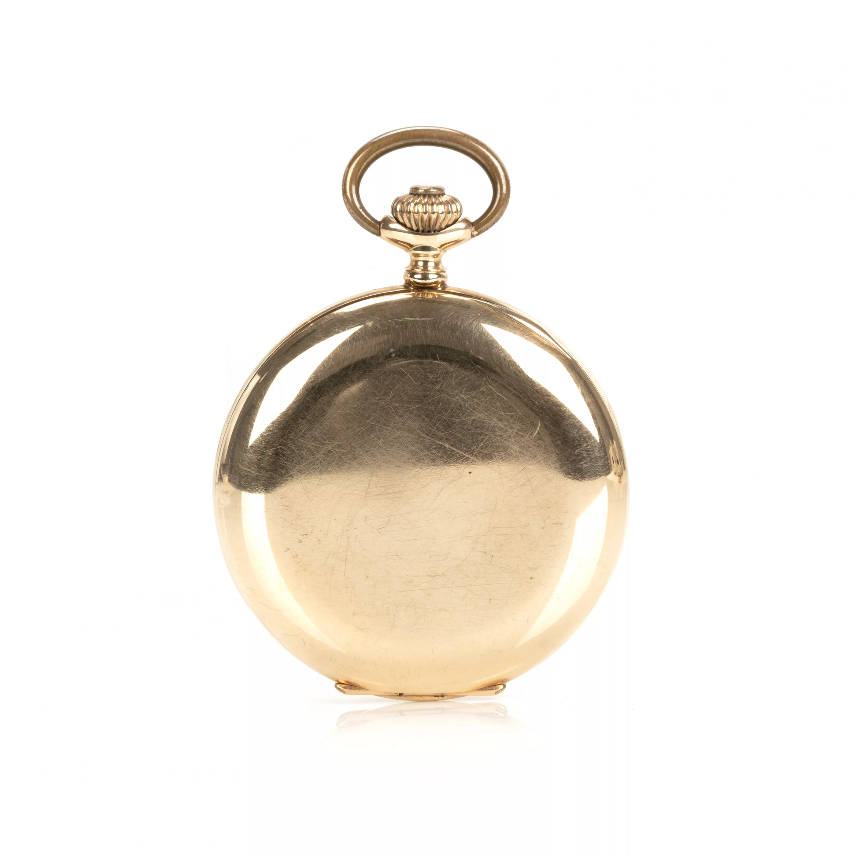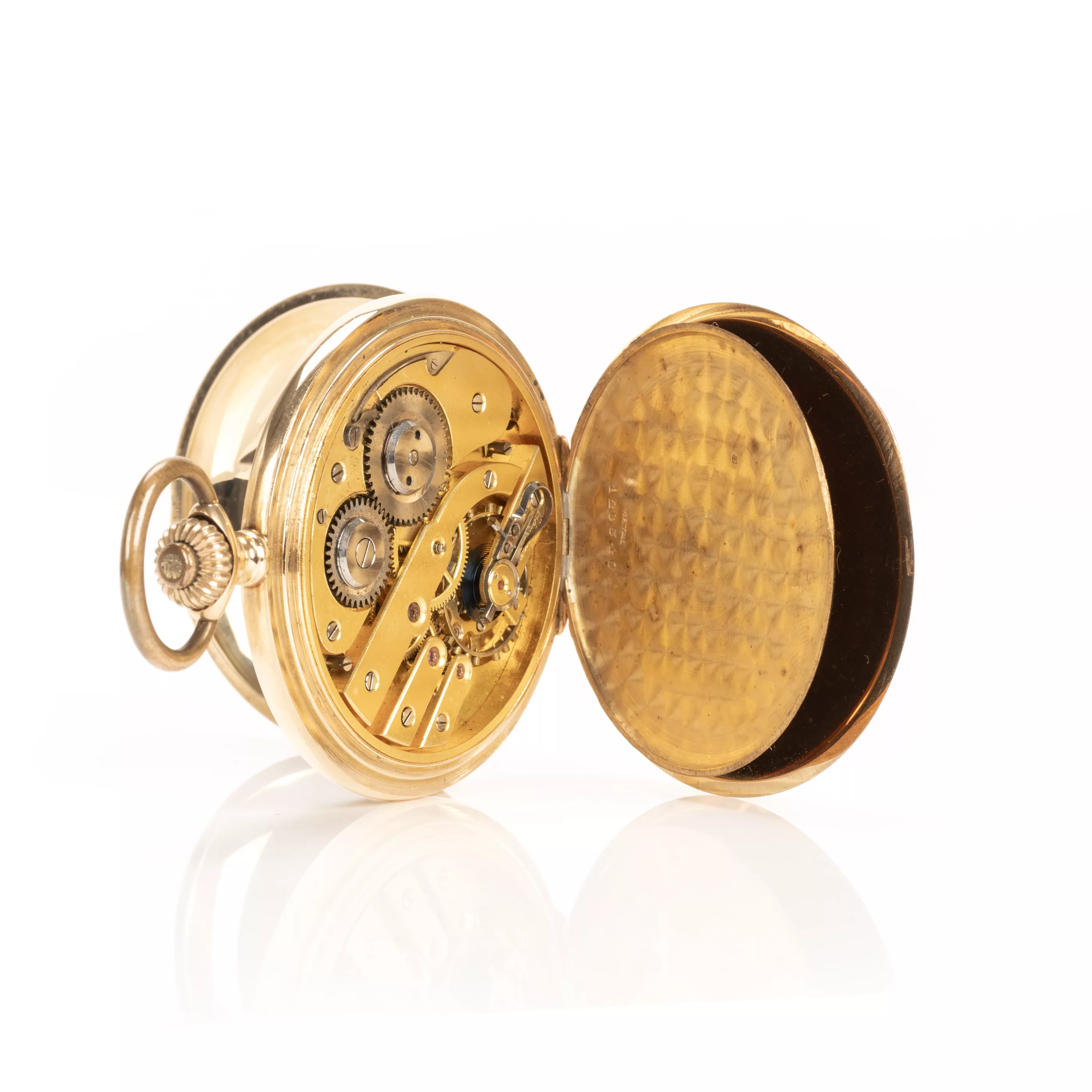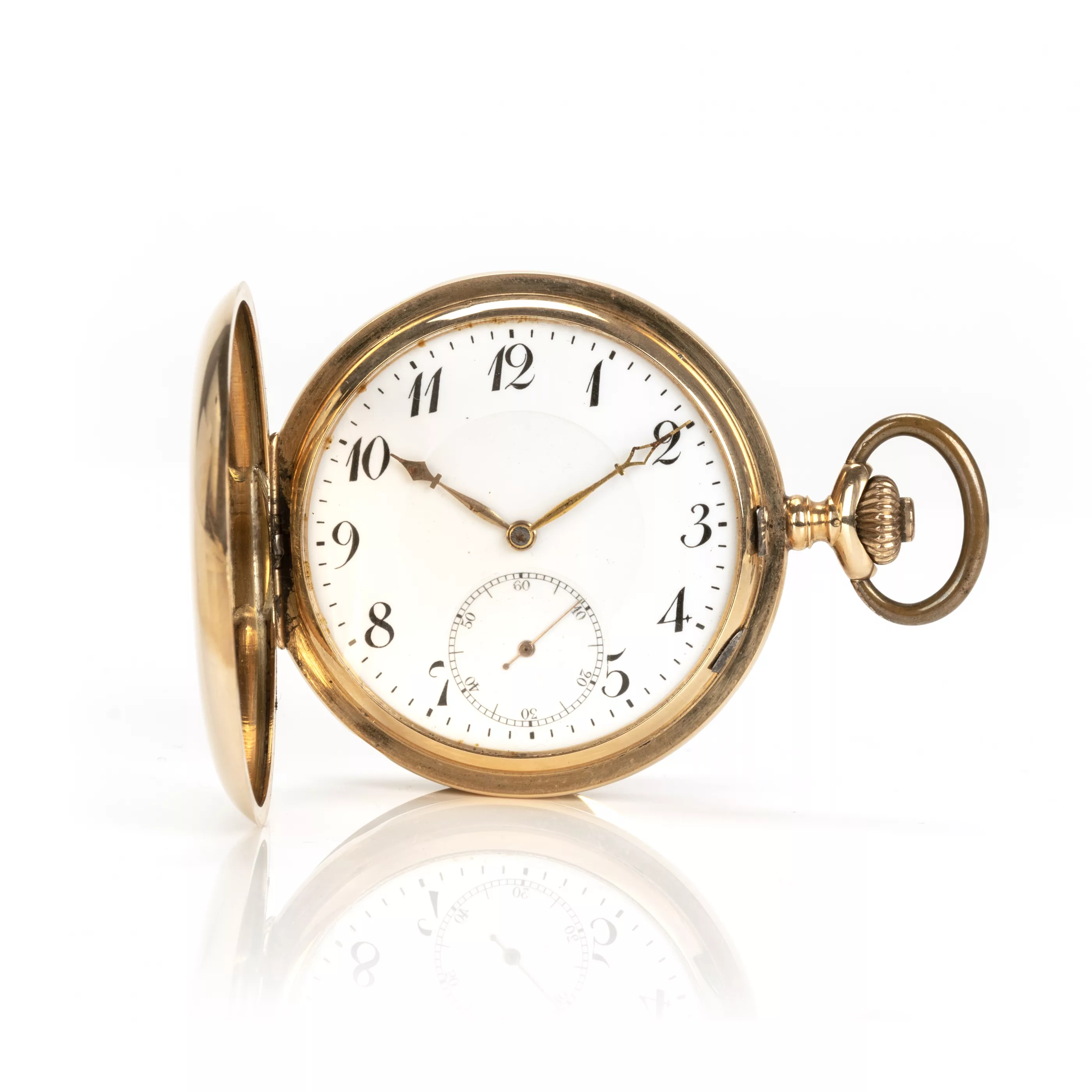 Crown winding, hand setting via slider, enamel dial with Arabic numerals, small second, case no. 128340, case 585 red gold, hallmarked, inner cover metal, diameter 52 mm, total weight approx. 94.8 g, functional, tested, needs a service, condition good, condition and functionality tested by our master watchmaker, note: The buyer's premium is 25% incl. VAT. For the use of the online bidding consoles there is an additional fee of 3% plus VAT (3.57%).