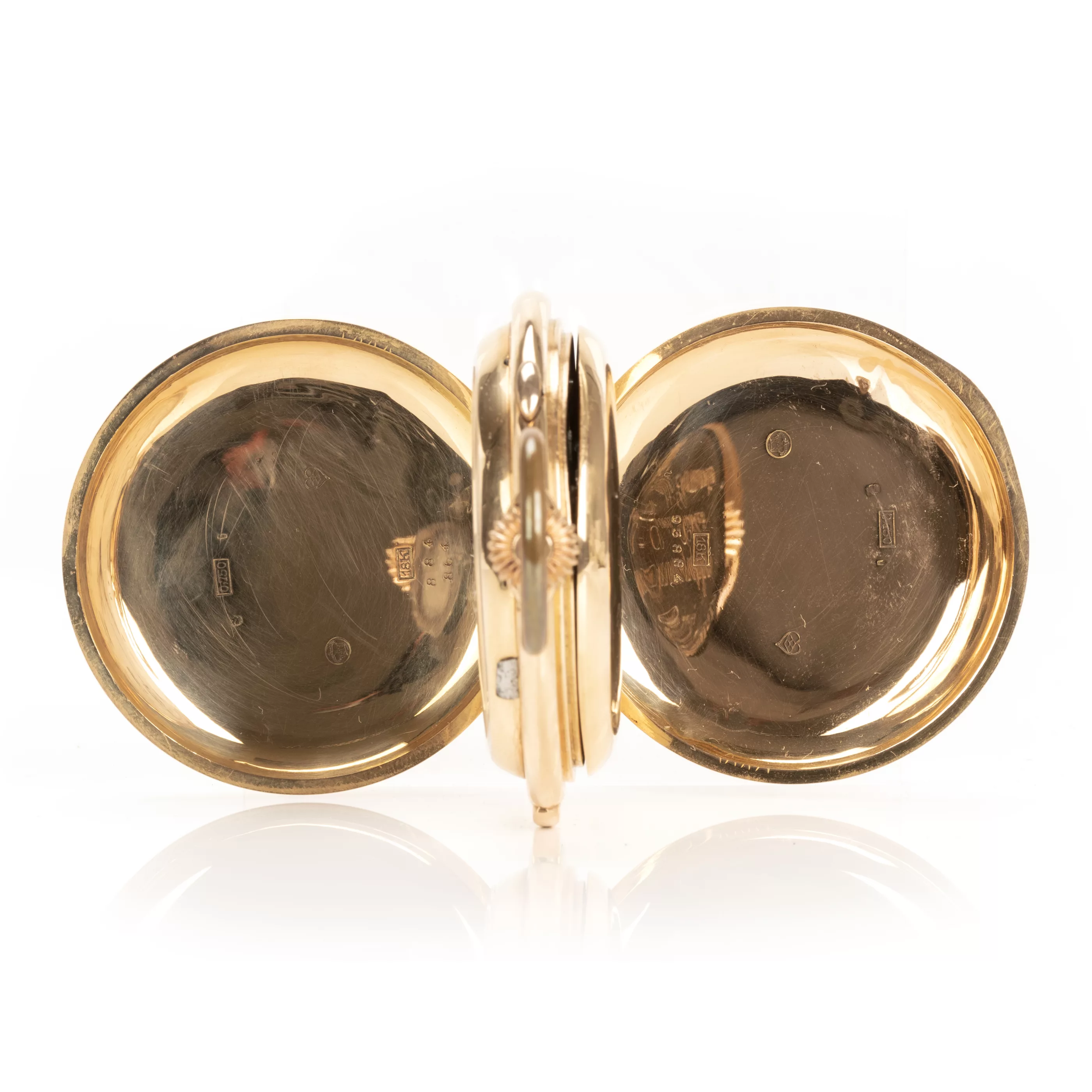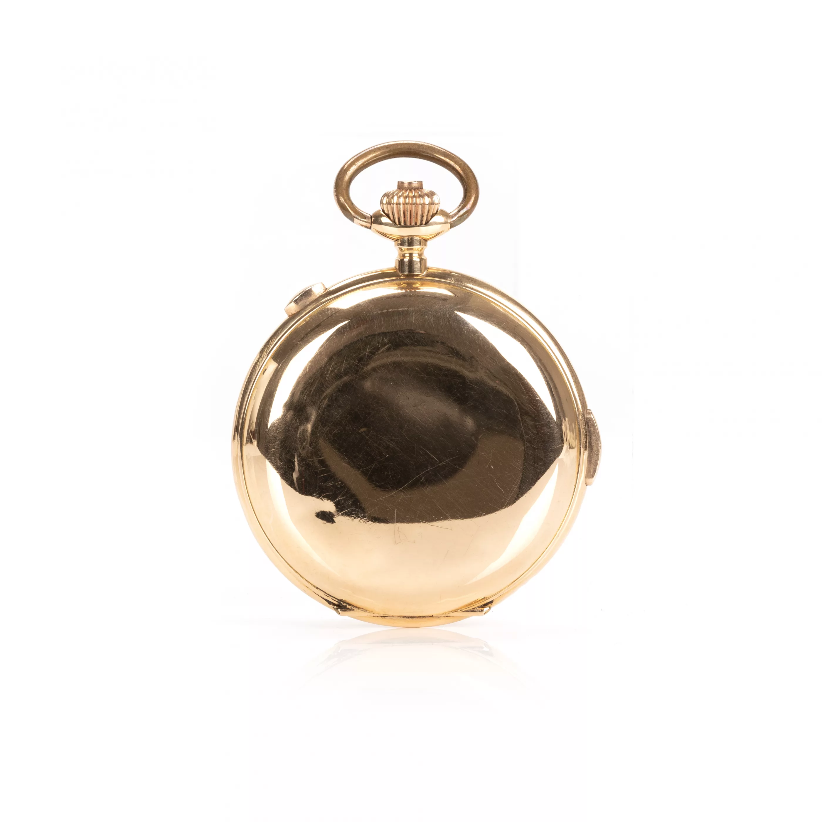 crown winding, hand setting via lever, enamel dial with arabic numerals, small second, quarter repeater, minute chronograph, case no. 93884, case 750 red gold, hallmarked, inner cover 750 red gold, hallmarked, diameter 60 mm, total weight approx. 116.8 g, functional, tested, condition good, case slightly warped, rust scars in movement, watch glass replaced, plastic, partial dents and scratches in case, condition and functionality tested by our master watchmaker, note: The buyer's premium is 25% incl. VAT. For the use of the online bidding consoles there is an additional fee of 3% plus VAT (3.57%).