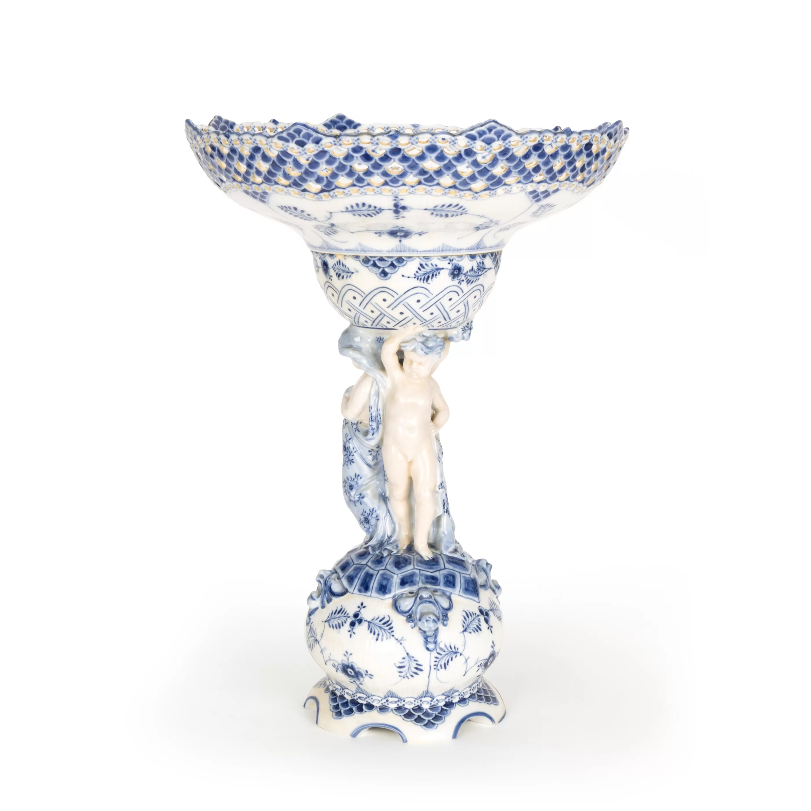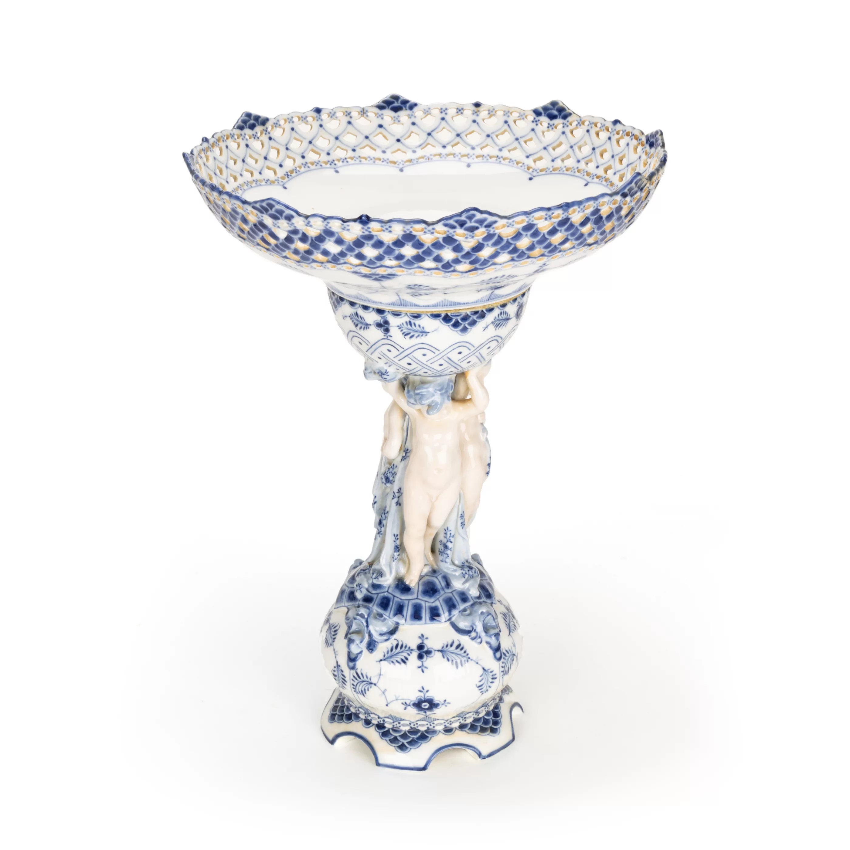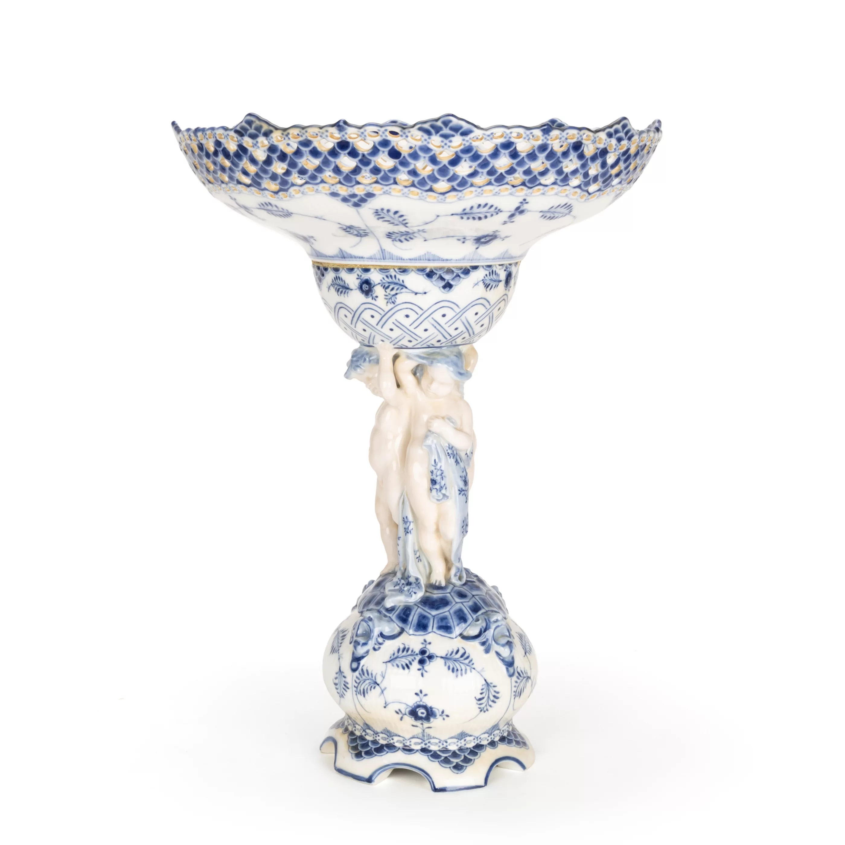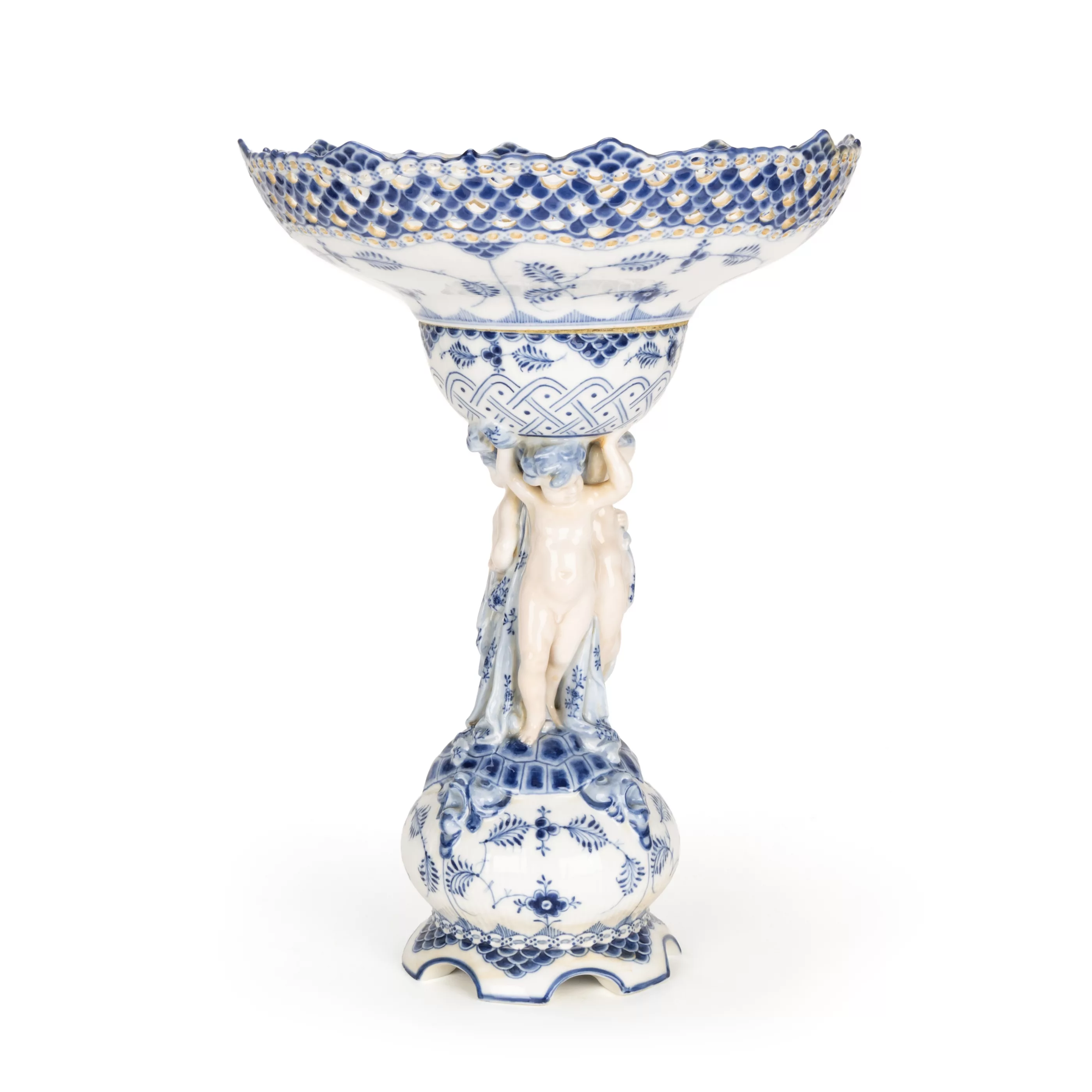 Royal Copenhagen, Dänemark, Entwurf von Arnold Krog (1856-1931), Ausführung 1889-1922, Porzellan, weiß, monochrom blau bemalt, großer Tafelaufsatz mit Vollspitze-Aufsatzschale, auf dem kugeligen Fuß drei plastische Puttifiguren, die Schale tragend, Höhe 38,5 cm, Manufakturmarke, Modellnummer 1/1012 und Malermarke, Zustand A/B