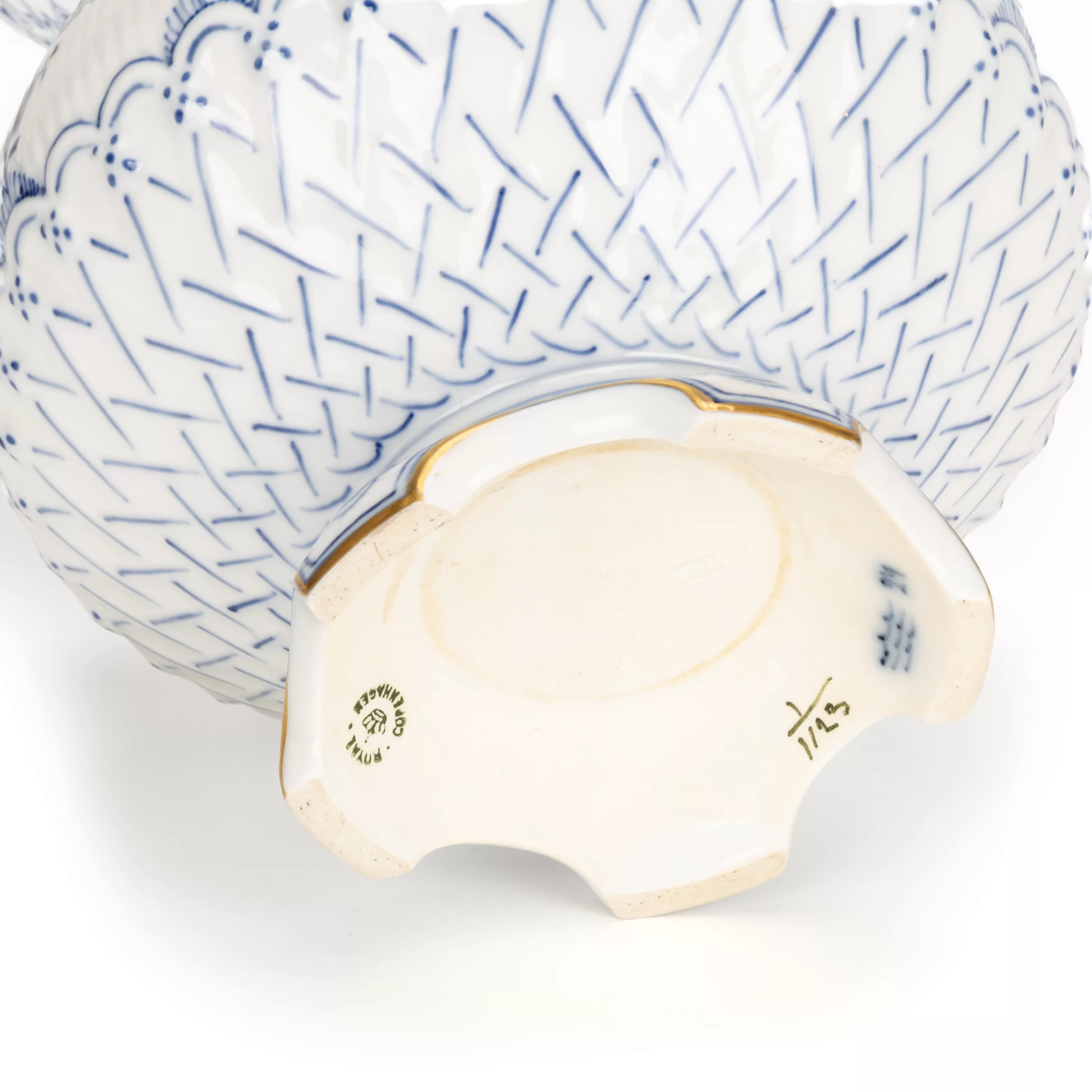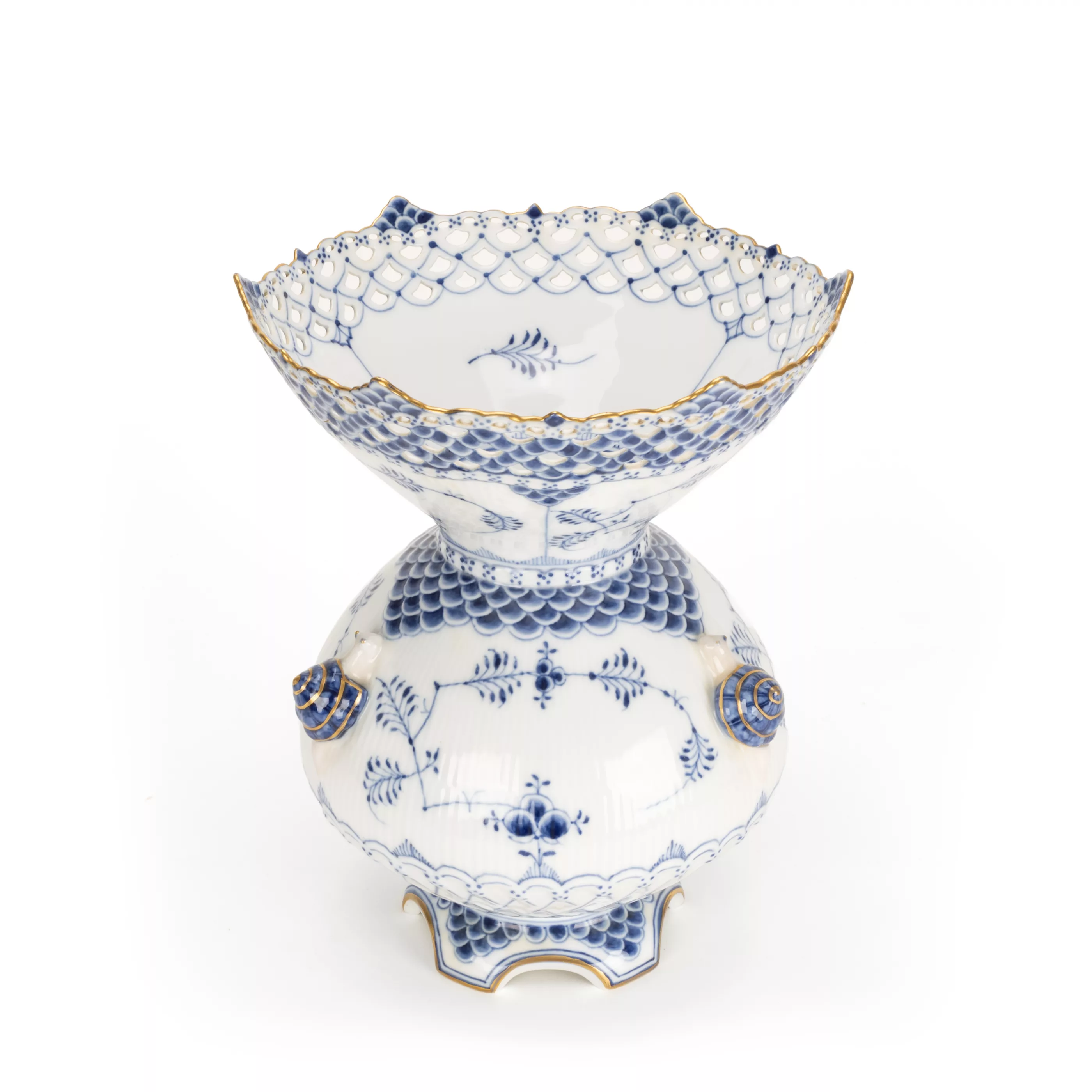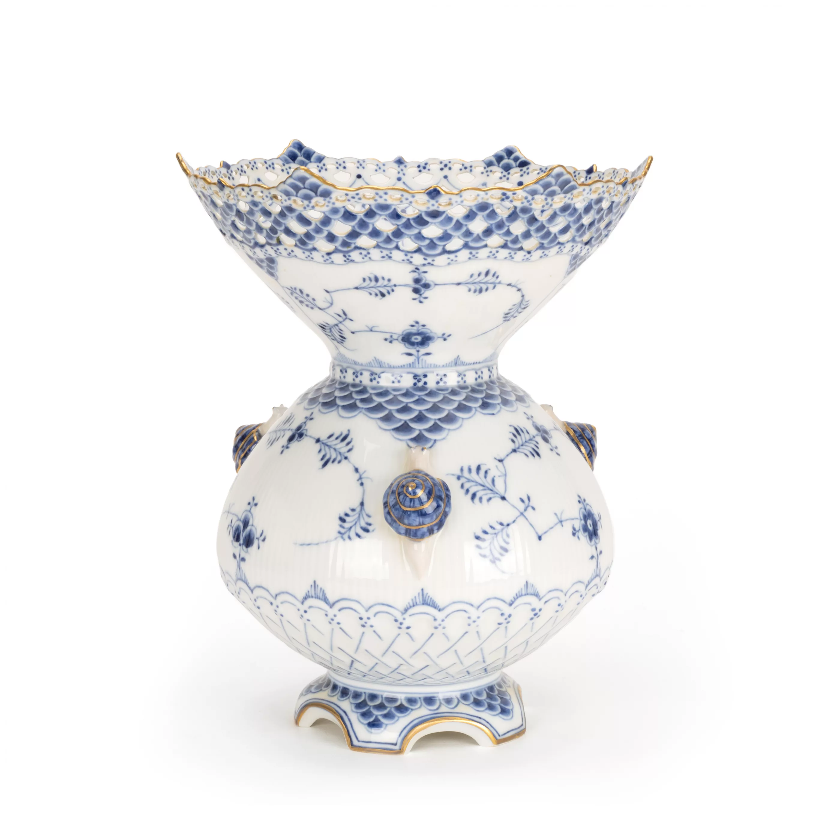 Royal Copenhagen, Denmark, designed by A. Krog and S.B. Jacobsen in 1885, executed 1889-1922, porcelain, white, painted monochrome blue and partially painted gold, the bulbous body with three scrolls in relief, wide neck with full lace piercing, height 31 cm, maker's mark, model number 1/1123 and painter's mark, condition A, in need of cleaning