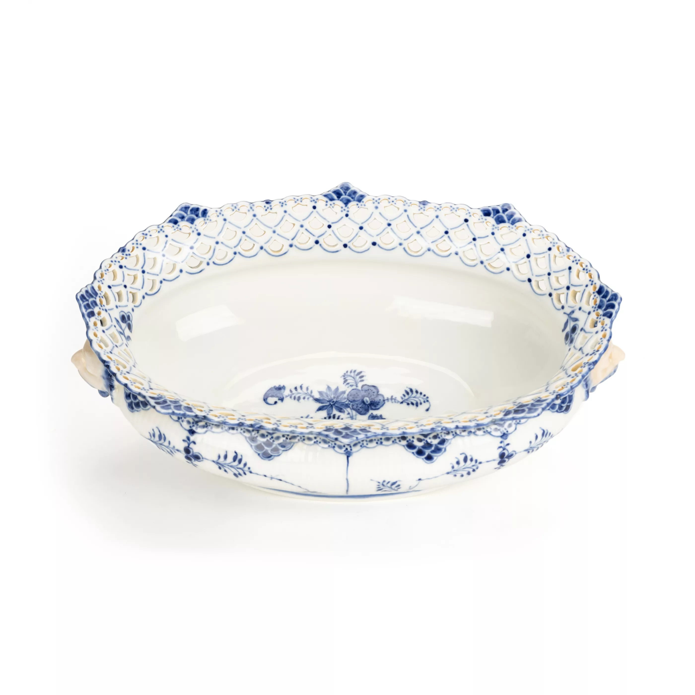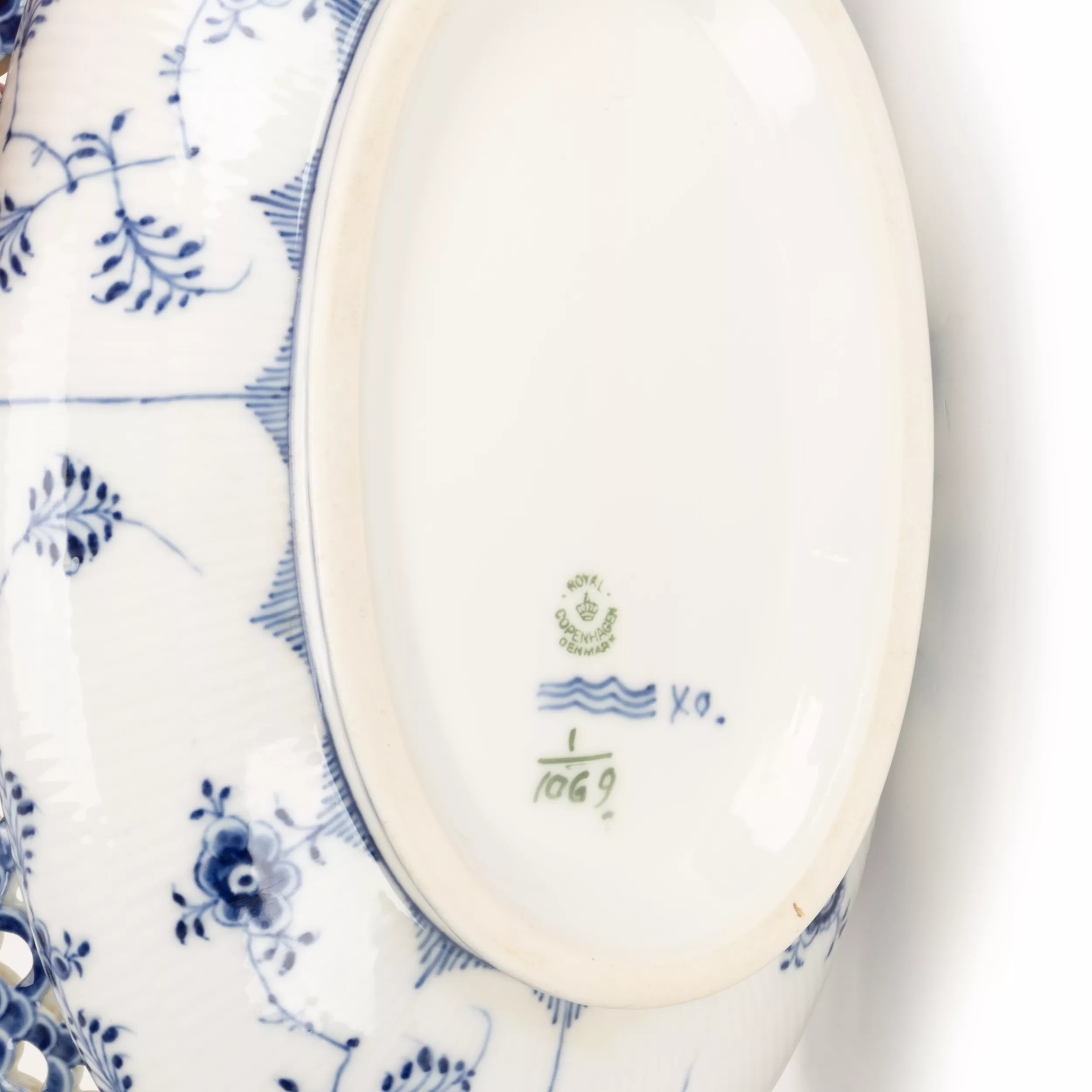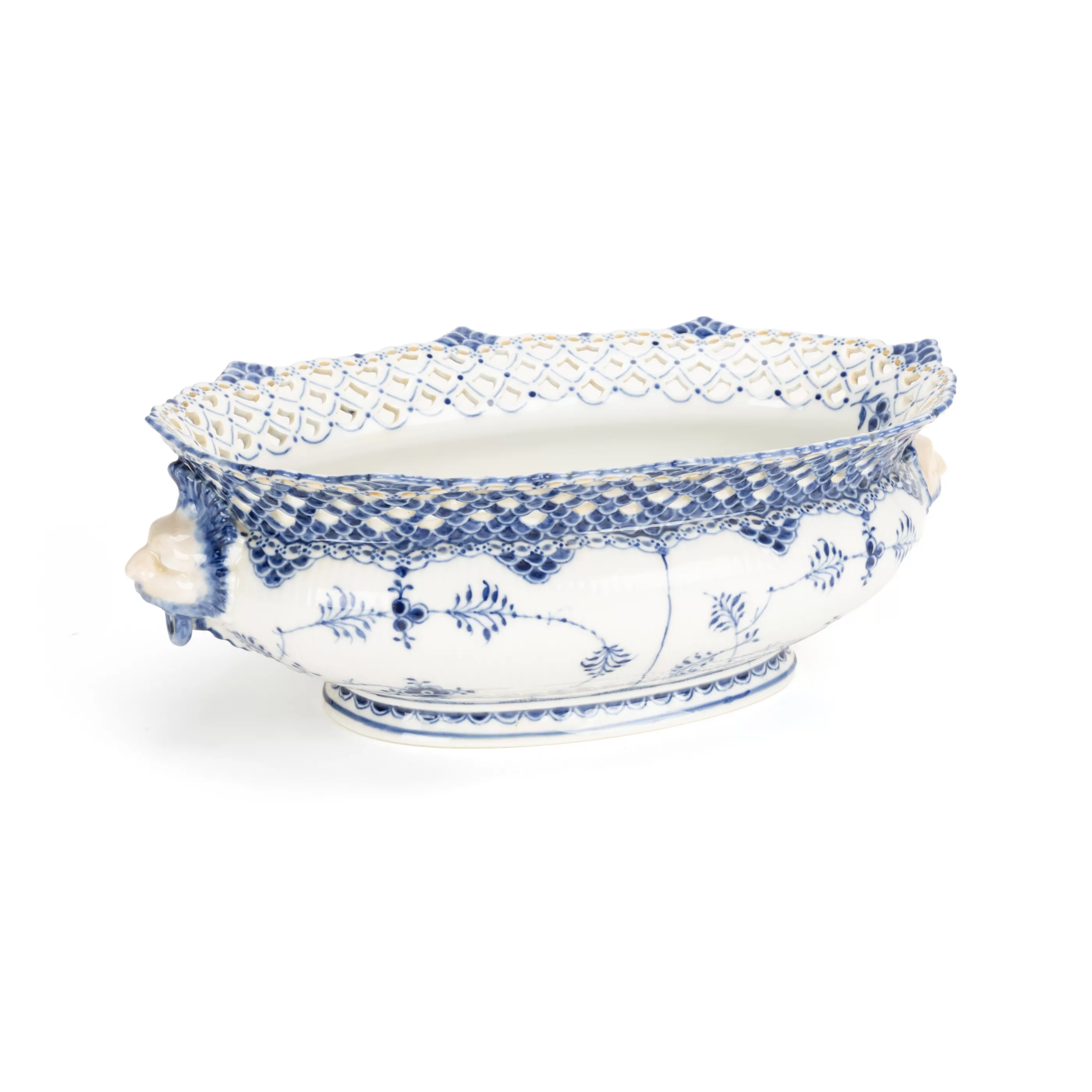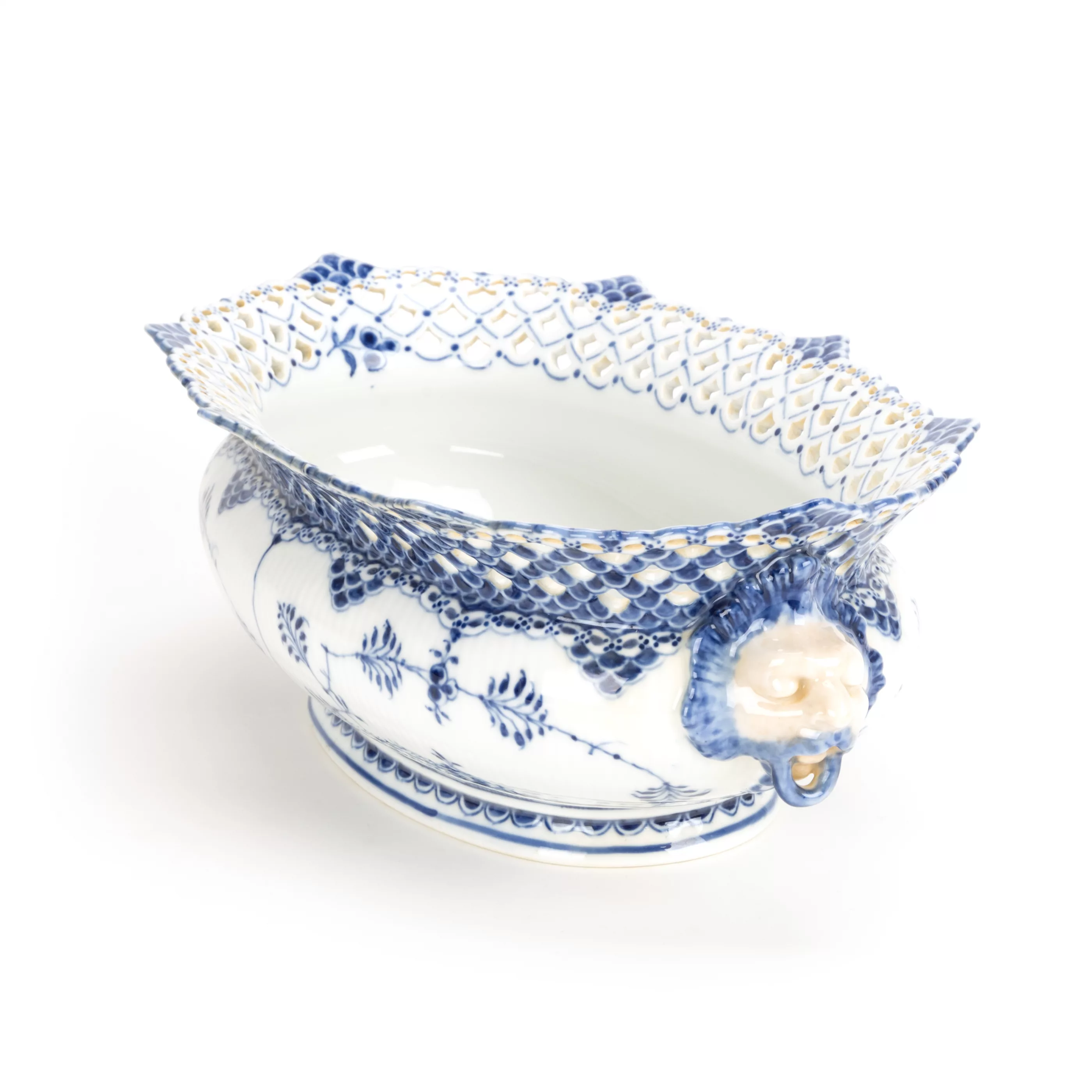 Royal Copenhagen, Dänemark, Entwurf von Arnold Krog (1856-1931), Ausführung 1923-1935, Porzellan, weiß, monochrom blau bemalt, länglich bauchiger Korpus mit seitlichen Maskarons und Vollspitze-Durchbruchrand, Höhe 13,5 cm, Länge 37 cm, Manufakturmarke, Modellnummer 1/1069, Malermarke, Zustand A
