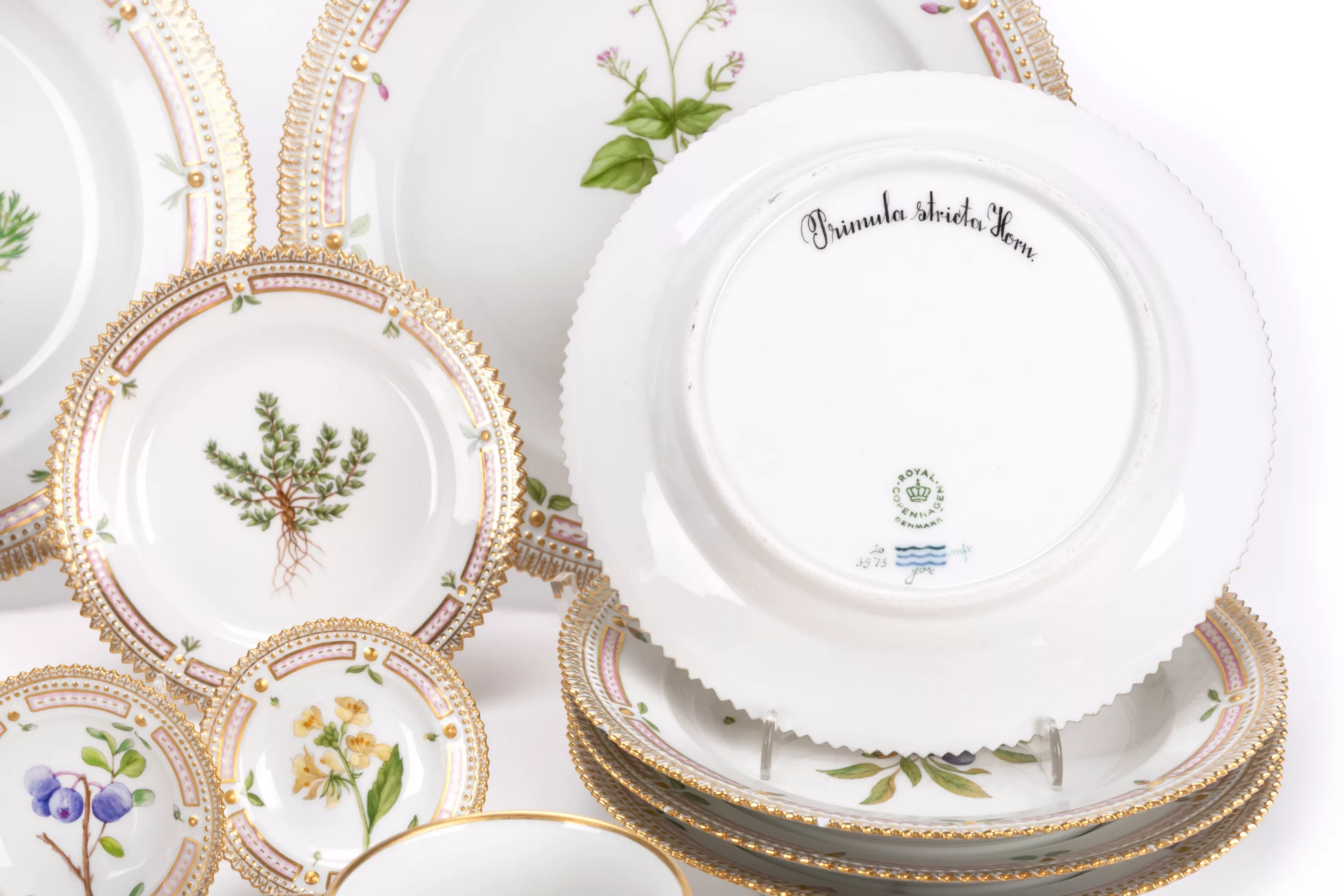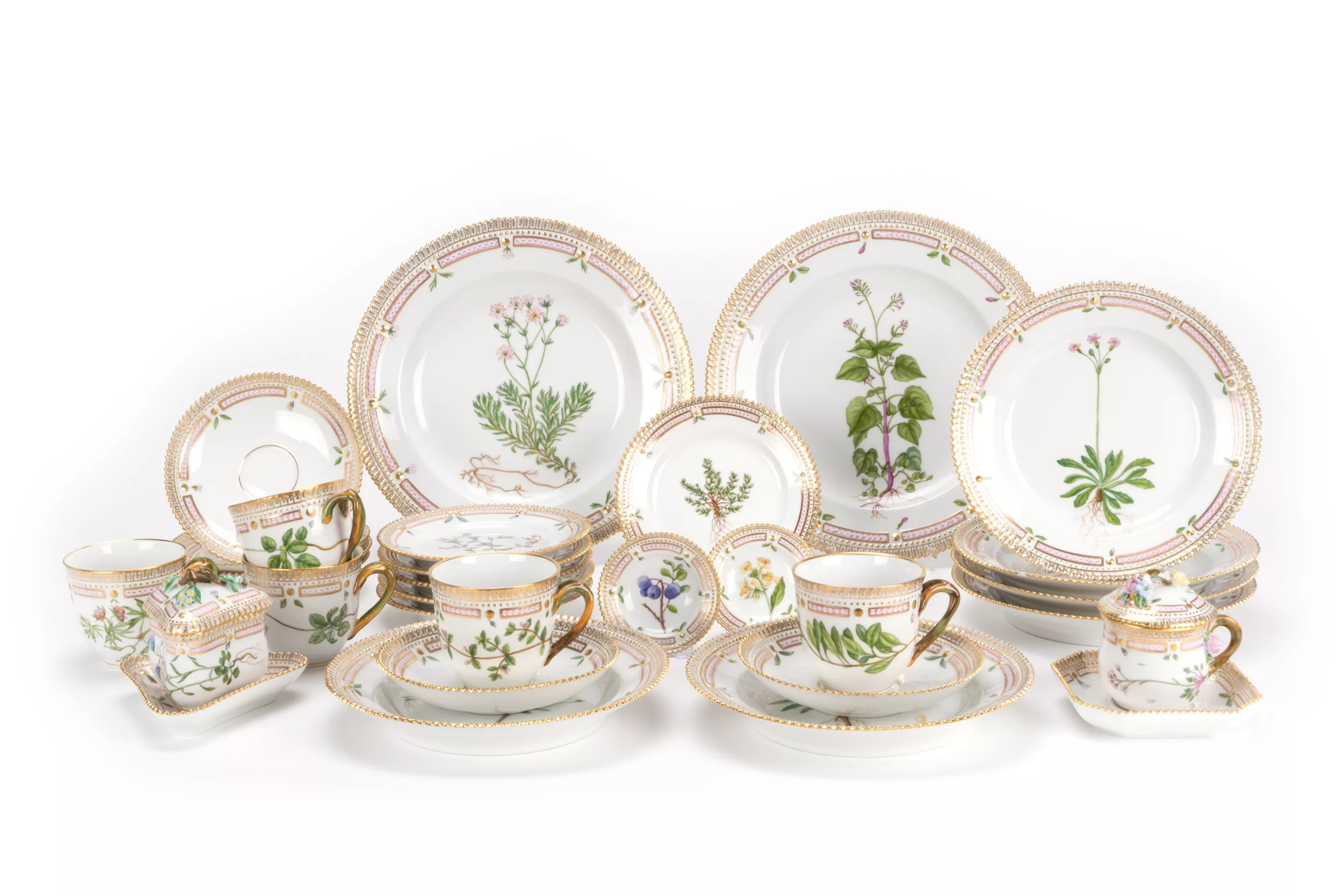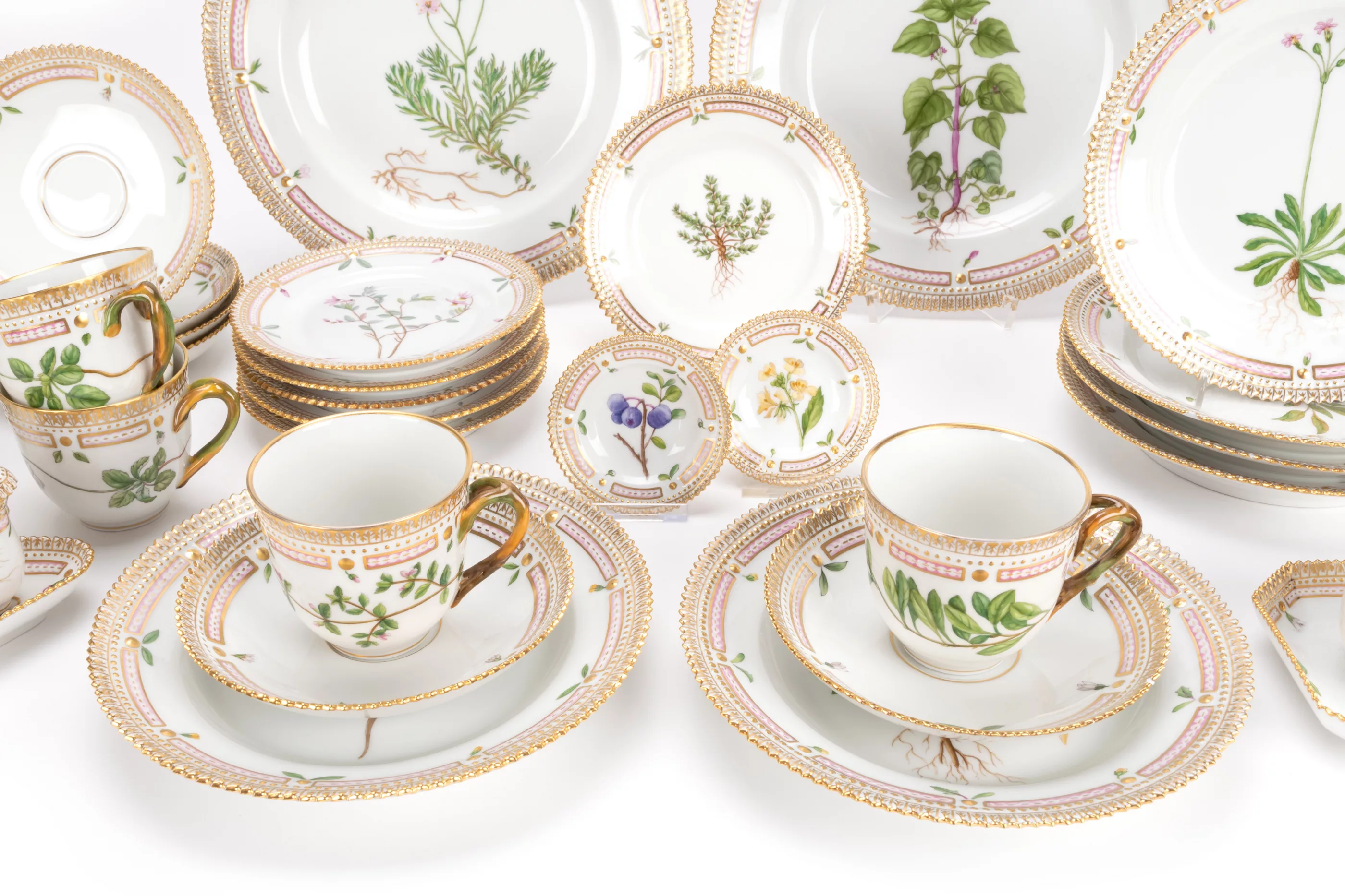 31-tlg., Royal Copenhagen, Dänemark, hauptsächlich 1960er-1970er Jahre, Entwurf von J.C. Bayer um 1770, Porzellan, weiß, polychrom bemalt und gold staffiert, 2 große Teller, Ø 25,5 cm, 6 Kuchenteller, Ø 19,5 cm, 6 Gebäckteller, Ø 14,5 cm, 5 Kaffeetassen und 6 Untertassen, 1 Zuckerdose mit 1 Untertasse, Höhe 8 cm, 1 dreieckige Deckeldose mit UT, Höhe 8,5 cm und 2 kleine Tellerchen, Ø 7,5 cm, Manufakturmarke, div. Jahreszeichen und Modellnummern, teilweise lateinische Pflanzenbezeichnungen, Zustand C, 5 UT, 3 Kuchenteller und Zuckerdose bestoßen