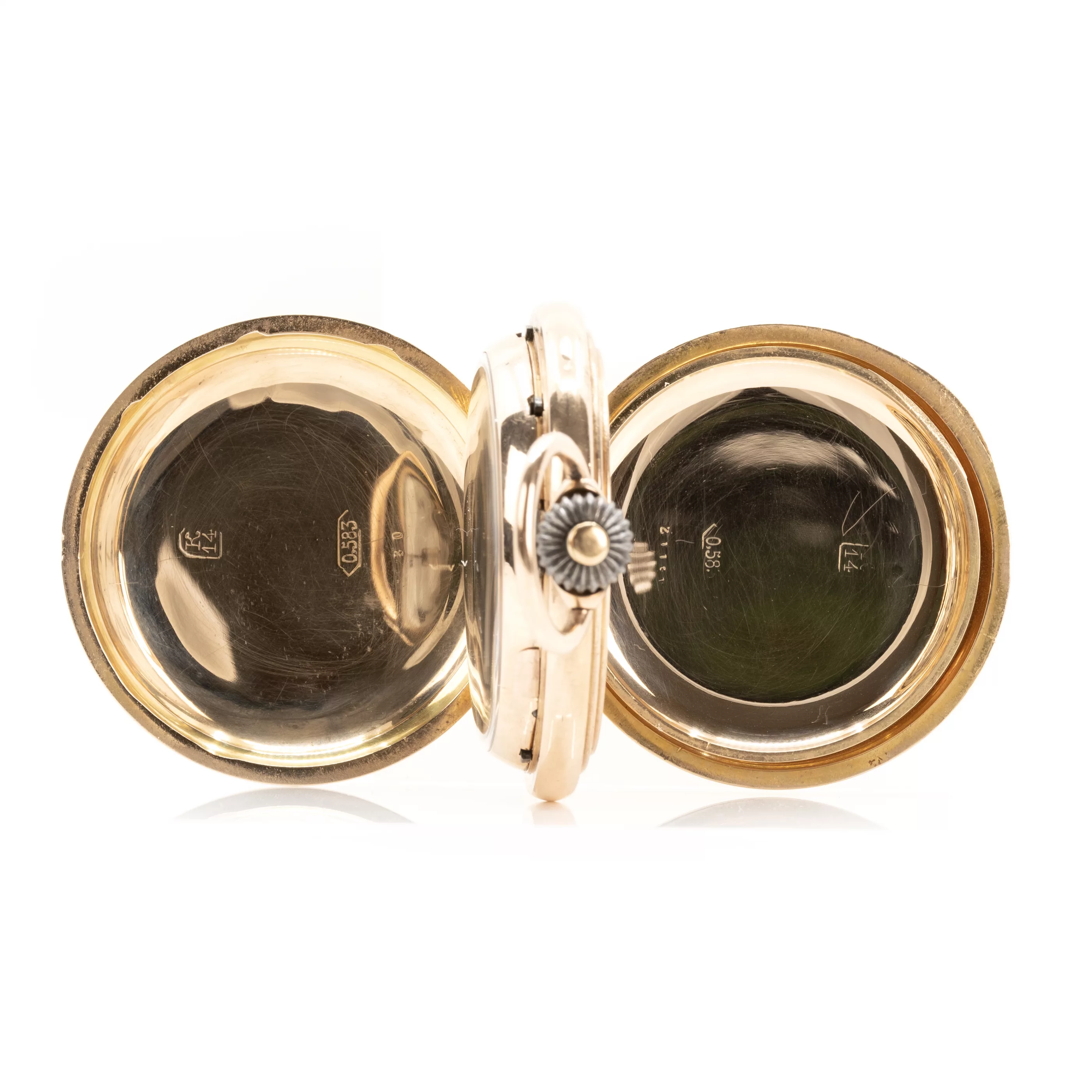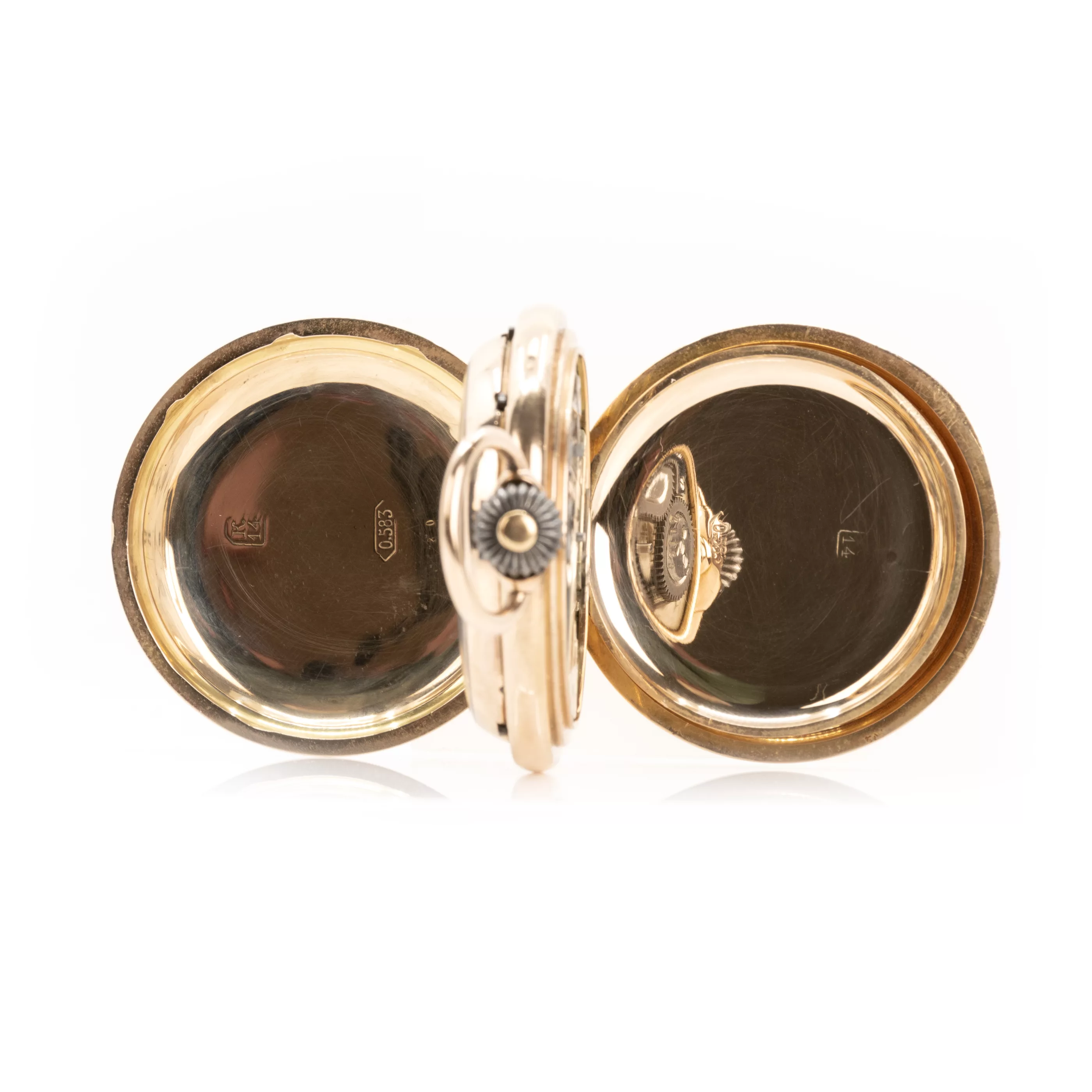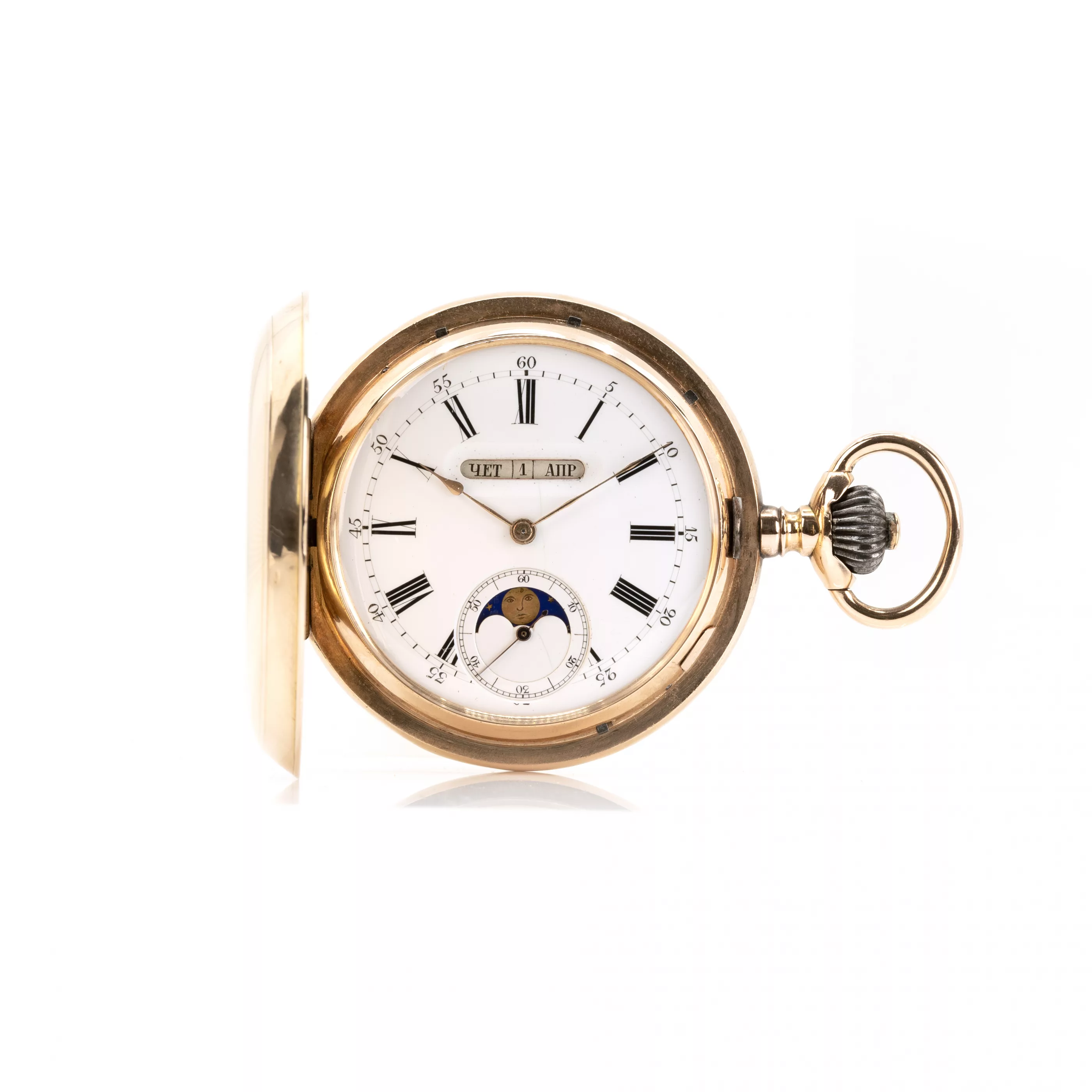 Circa 1900, manually wound, nickel-plated movement, piston-tooth lever escapement, correcting pusher, case 583 yellow gold, hallmarked, intermediate cover 583 yellow gold, hallmarked, white enamelled dial with black Roman numerals and Arabic minute scale, moon phase, lacquered, day, date and month indication, cover and intermediate cover numbered 21180, intermediate cover inscribed in Cyrillic, diameter 50 mm, weight approx. 120.7 g, function tested, working, satisfactory condition, in need of repair, dial with fine hairline cracks, glass replaced, plastic