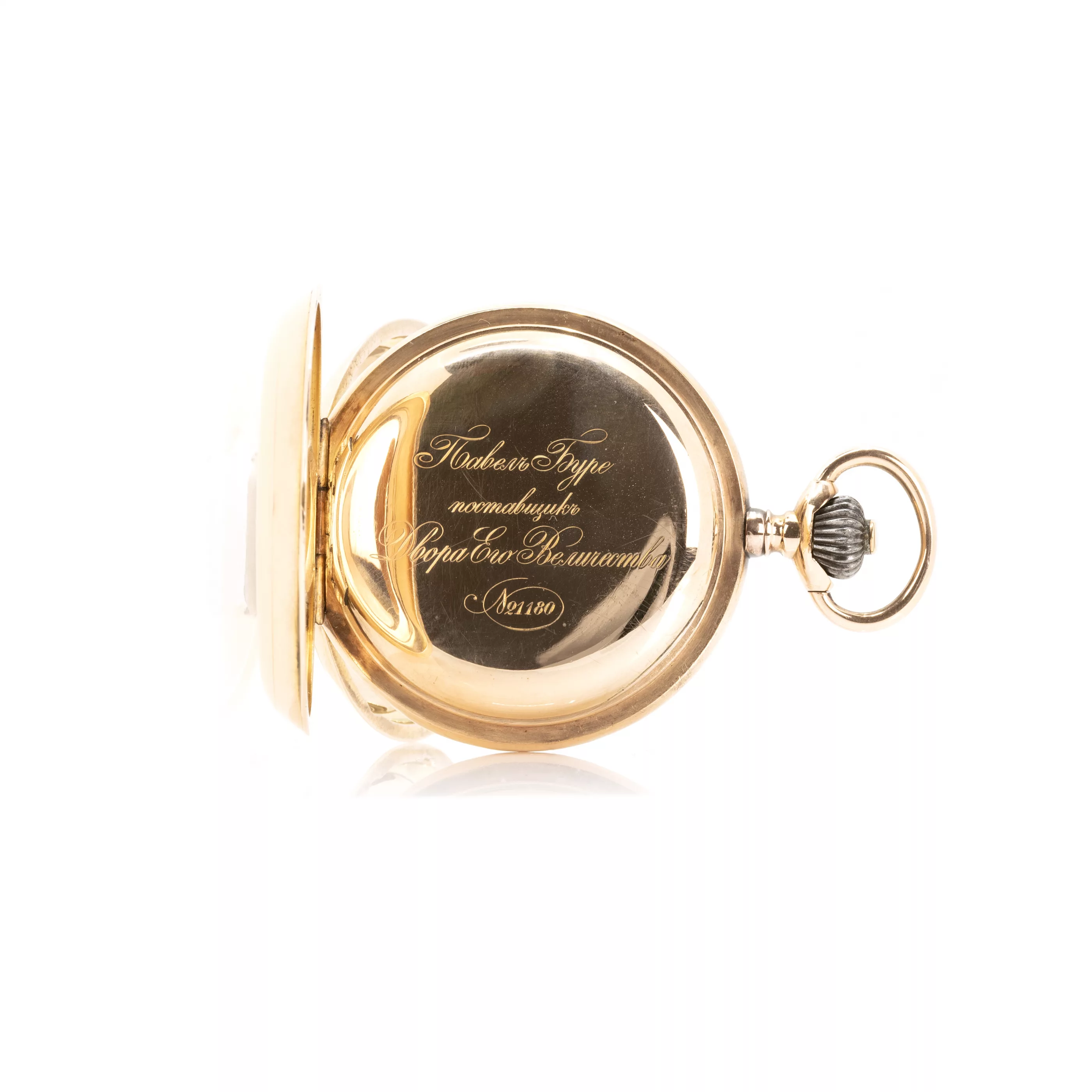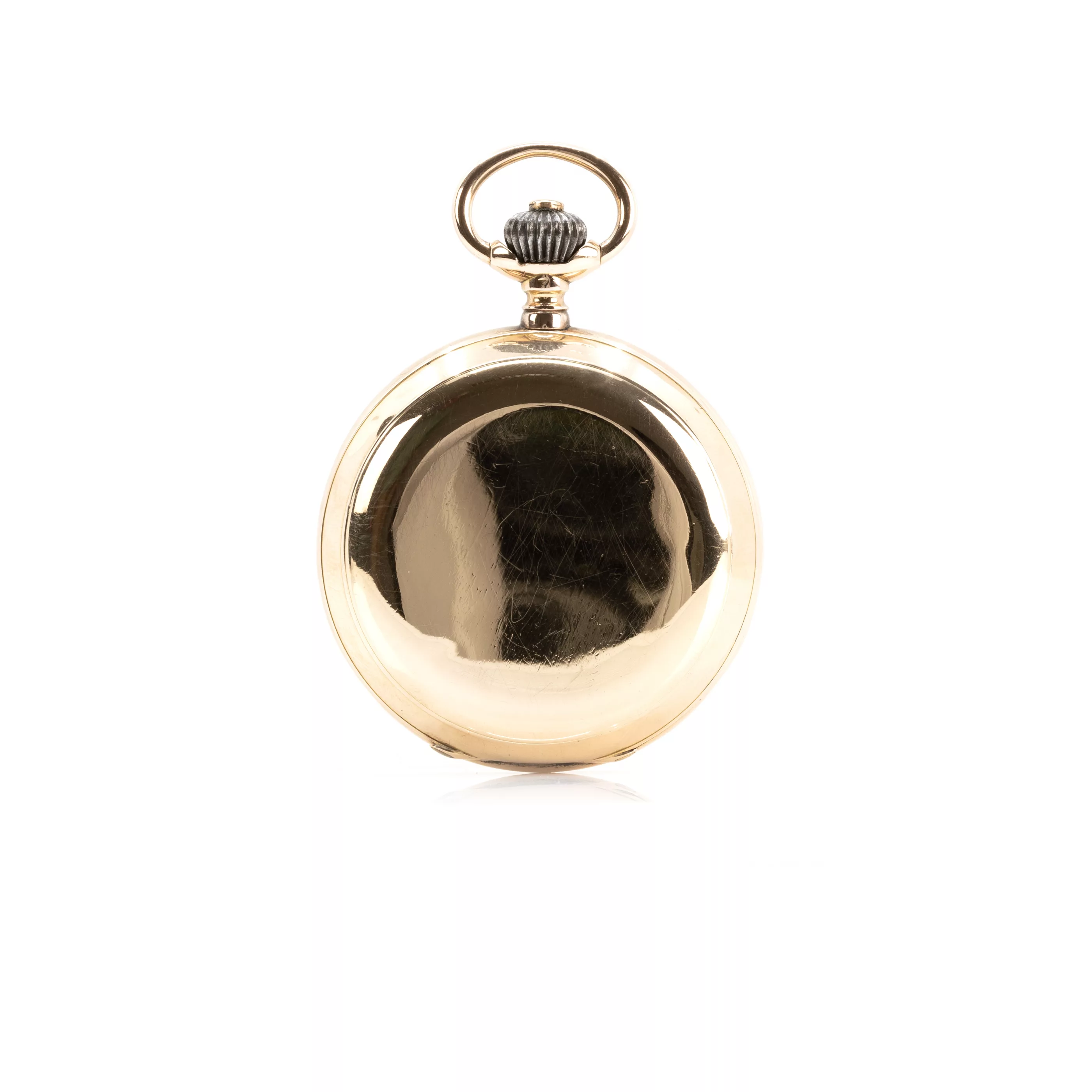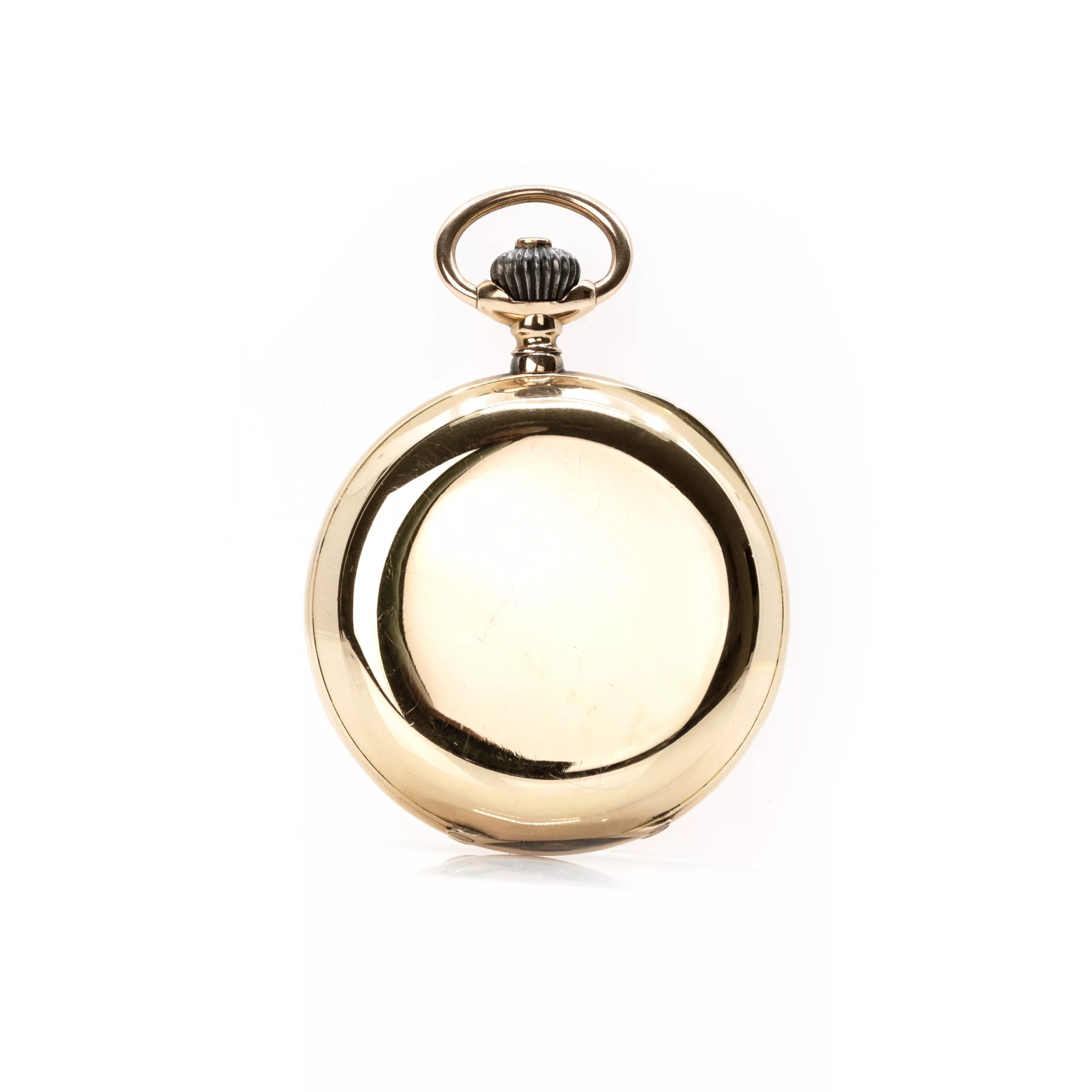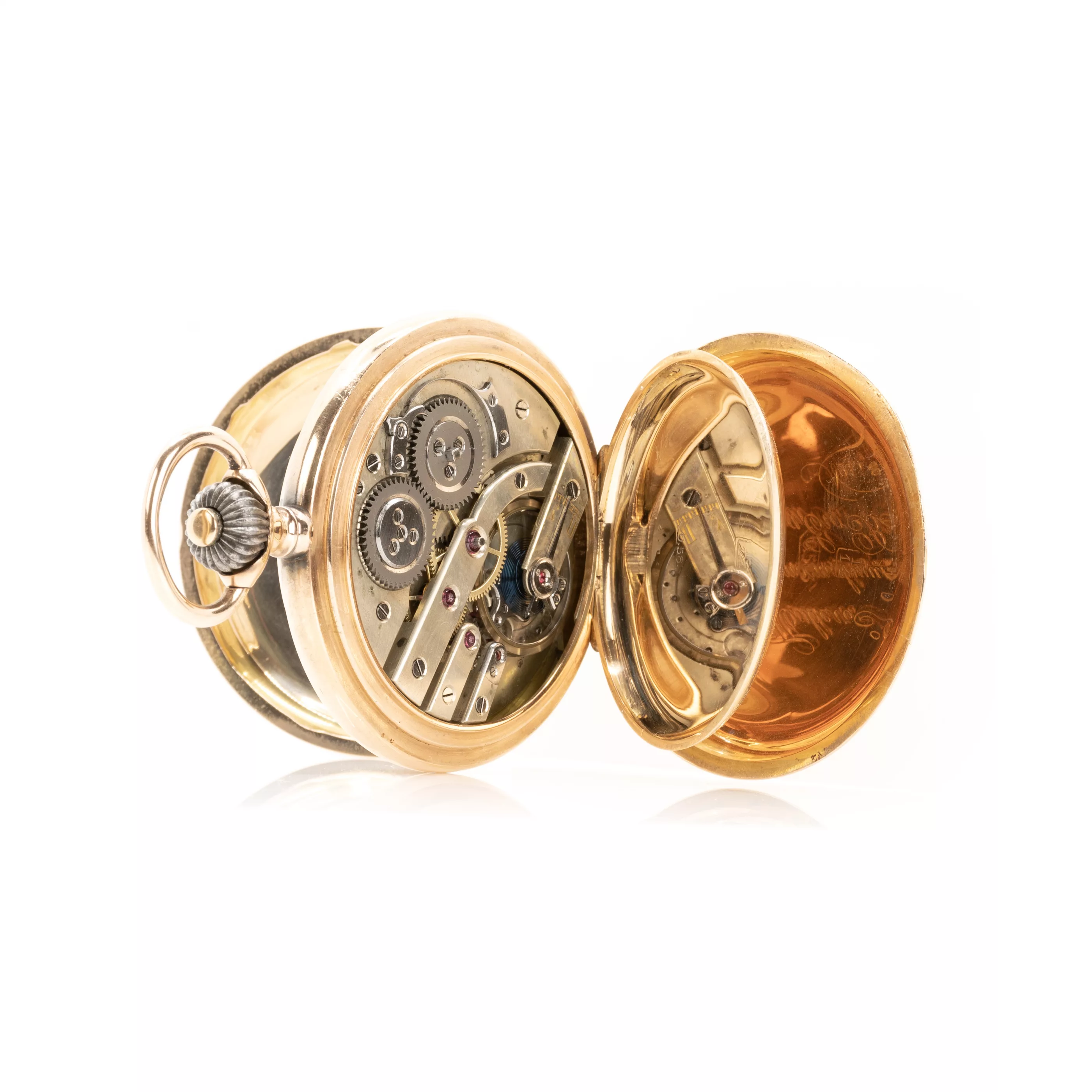 Circa 1900, manually wound, nickel-plated movement, piston-tooth lever escapement, correcting pusher, case 583 yellow gold, hallmarked, intermediate cover 583 yellow gold, hallmarked, white enamelled dial with black Roman numerals and Arabic minute scale, moon phase, lacquered, day, date and month indication, cover and intermediate cover numbered 21180, intermediate cover inscribed in Cyrillic, diameter 50 mm, weight approx. 120.7 g, function tested, working, satisfactory condition, in need of repair, dial with fine hairline cracks, glass replaced, plastic