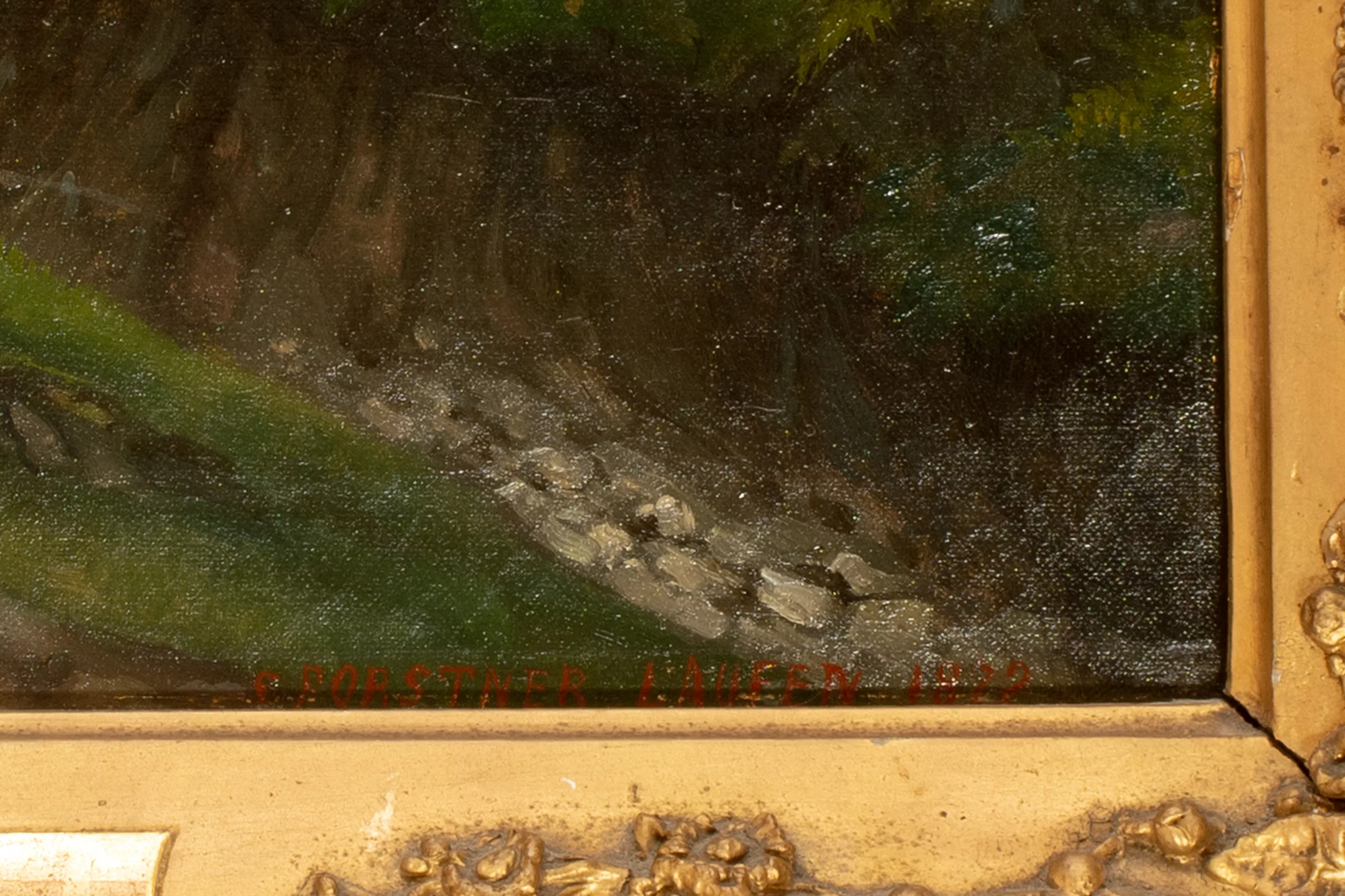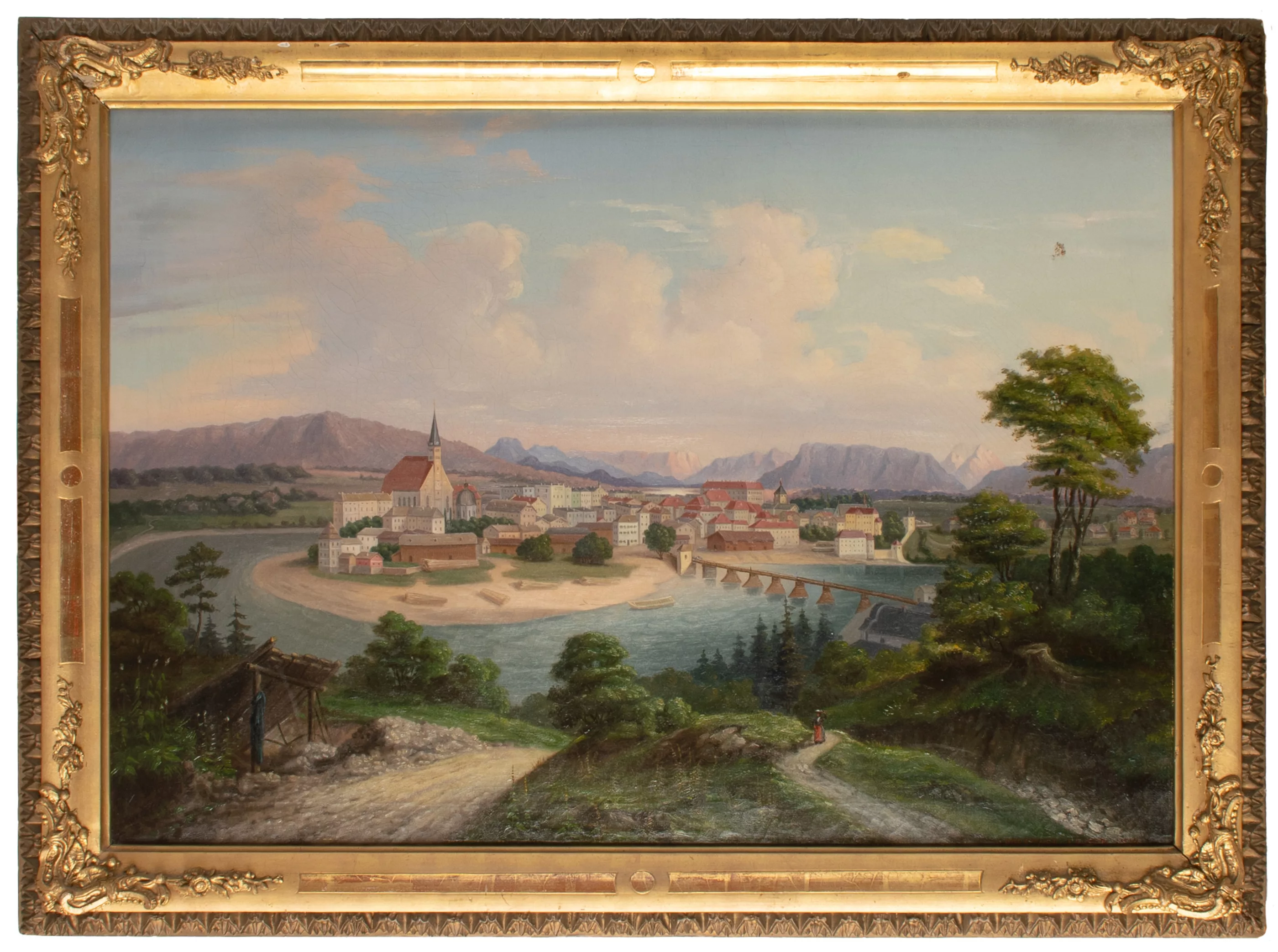 Laufen an der Salzach, oil on canvas, 60 cm x 84 cm canvas dimensions, signed, dated 1872, craquelure, minimal cracks and color flaking, canvas partially damaged