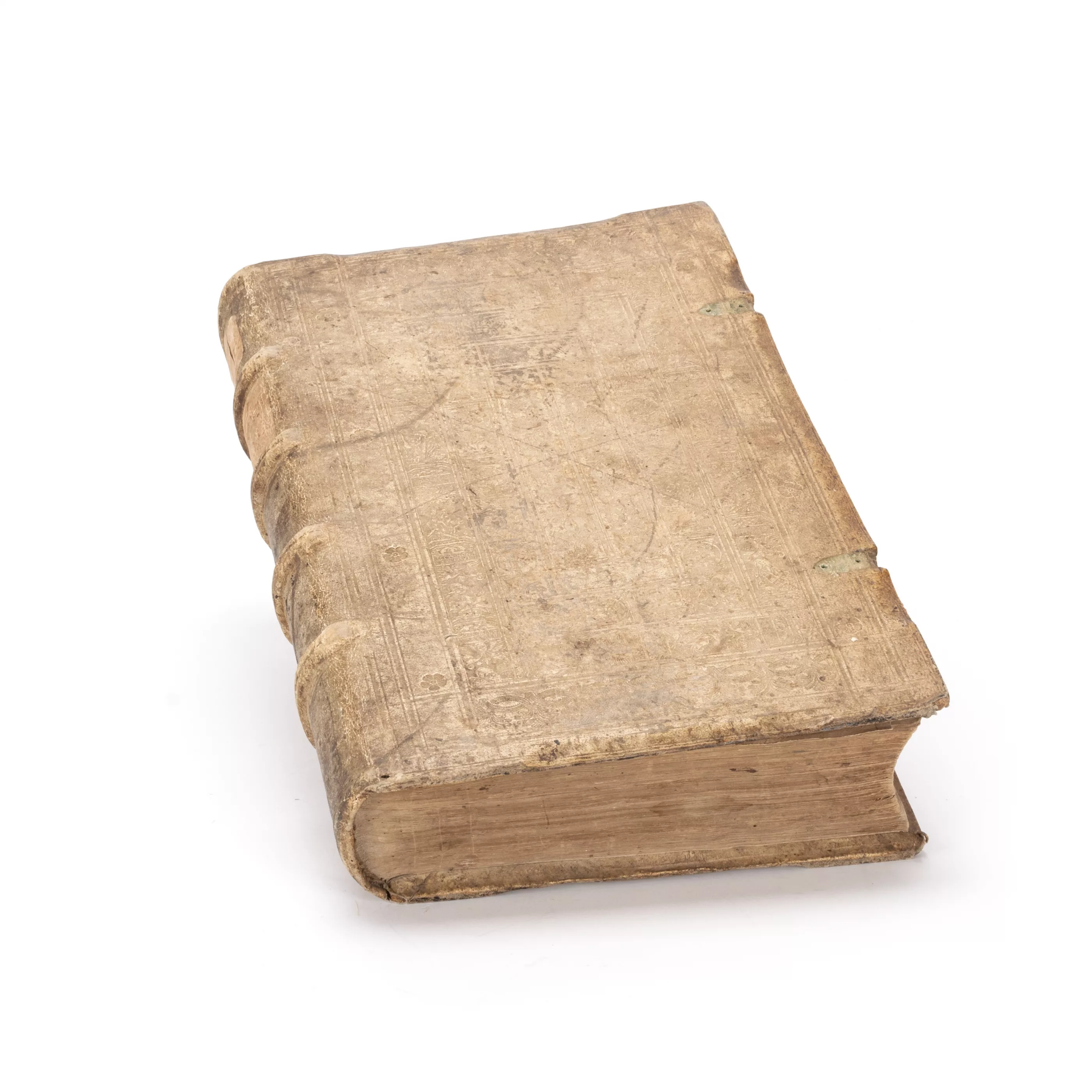 Vollständiger Titel 'Sachsenspiegel Auffs new fleissig corrigirt / an Texten : Stoffen : Allegaten : Auch mit Vermehrung des emendirten Repertorii / und vieler neuen nützlichen Additionen.', 1555 (M. D. LV.), gedruckt zu Dresden, durch Nicolaum Wolrab, 23 x 34 x 8 cm Buchmaß, mit Alters- und Gebrauchsspuren, leichter Wasserschaden, Schnallen absent