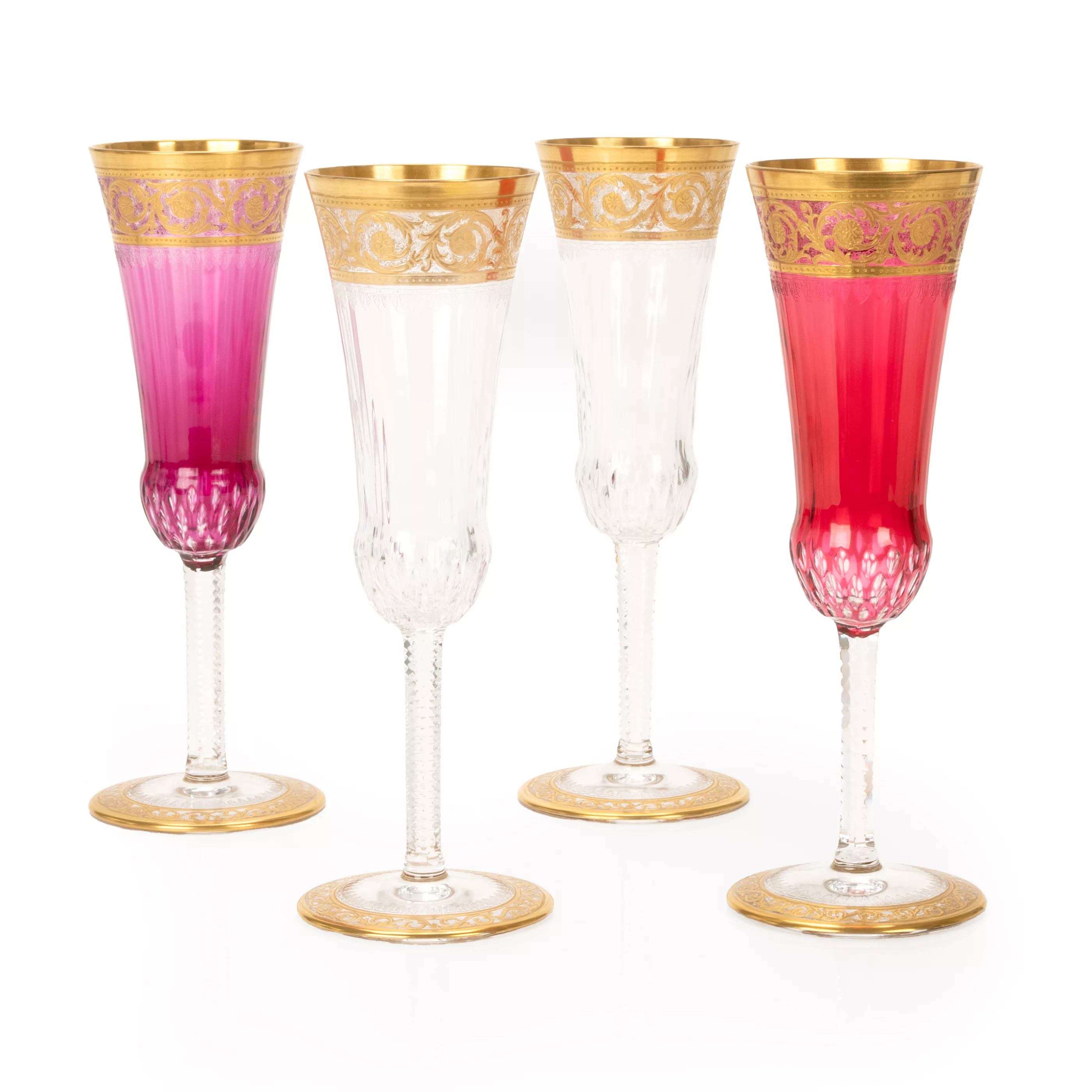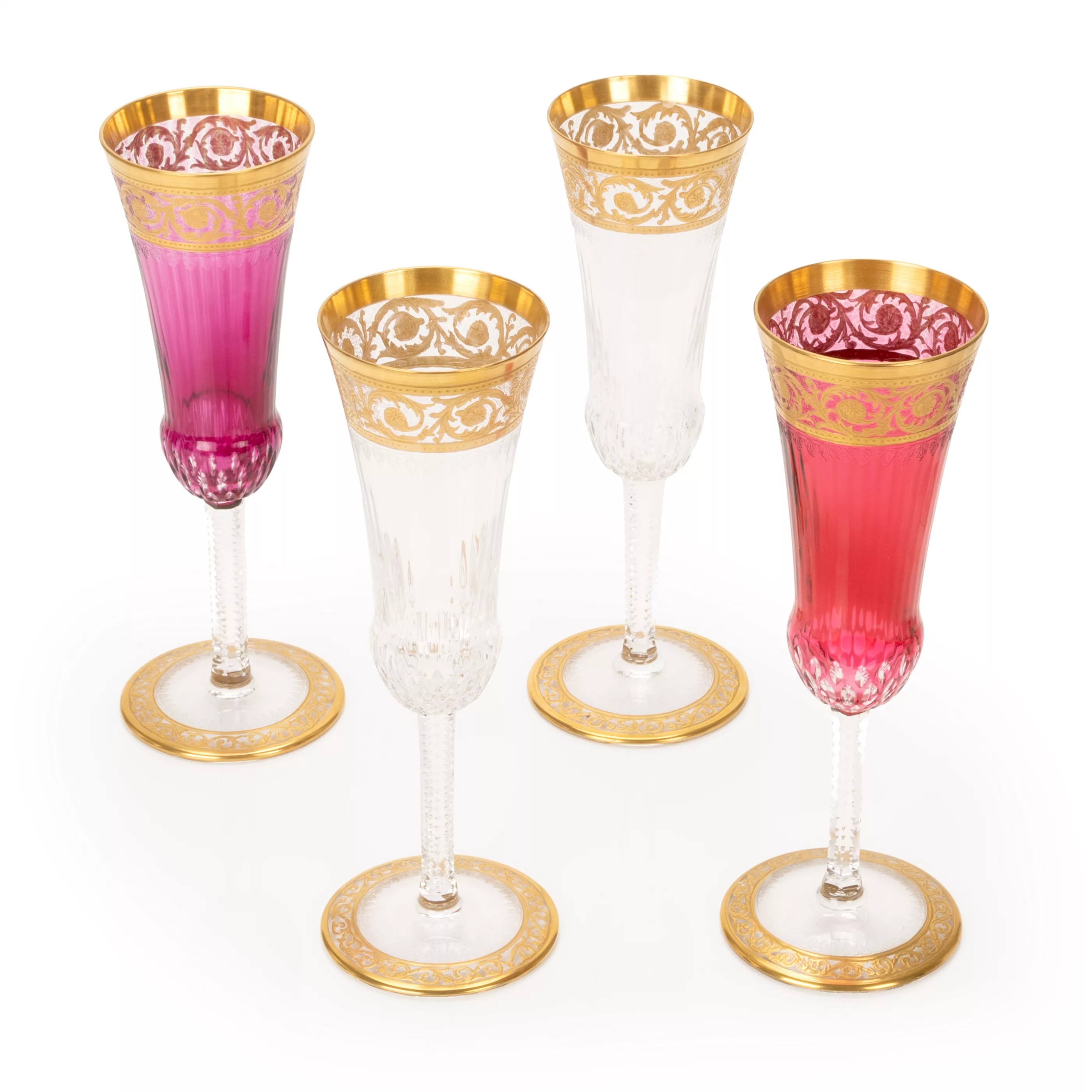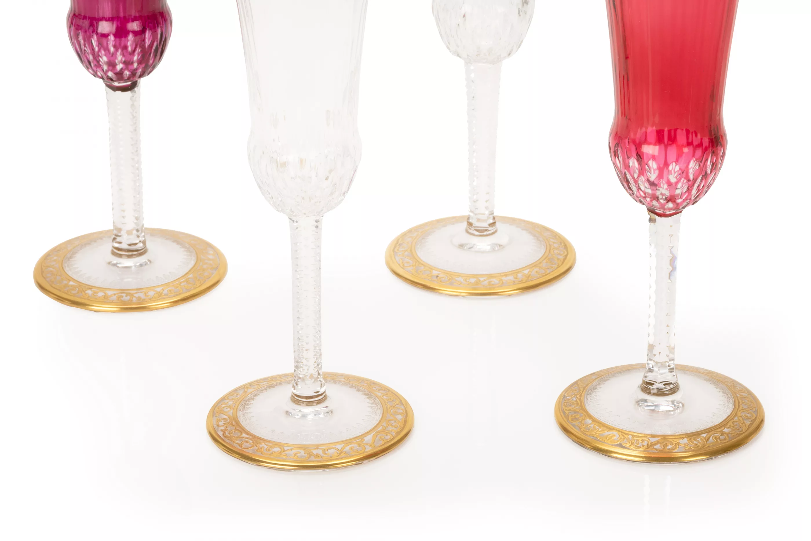 4-tlg., Saint Louis, Frankreich, 2 Gläser farbloses Kristallglas, ein Glas mit violettem und ein Glas mit rotem Überfang, Wandung jeweils dekoriert mit feinem Schliffdekor und Vergoldung, Höhe 19 cm, drei Gläser unterseitig mit Ätzmarke
