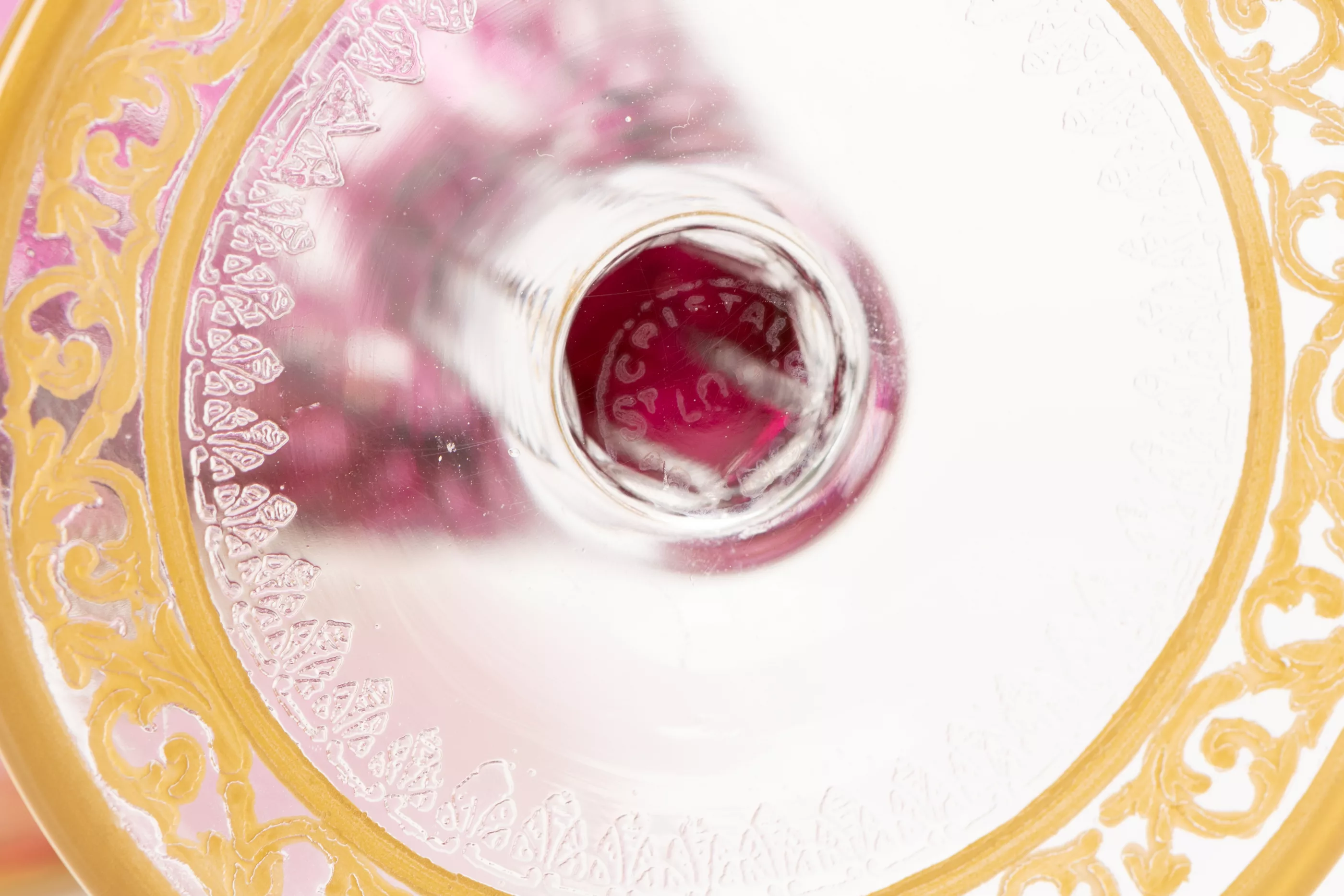 4-piece set, Saint Louis, France, 2 glasses colorless crystal glass, one glass with violet and one glass with red overlay, each wall decorated with fine cut decoration and gilding, height 19 cm, three glasses with etched mark on underside