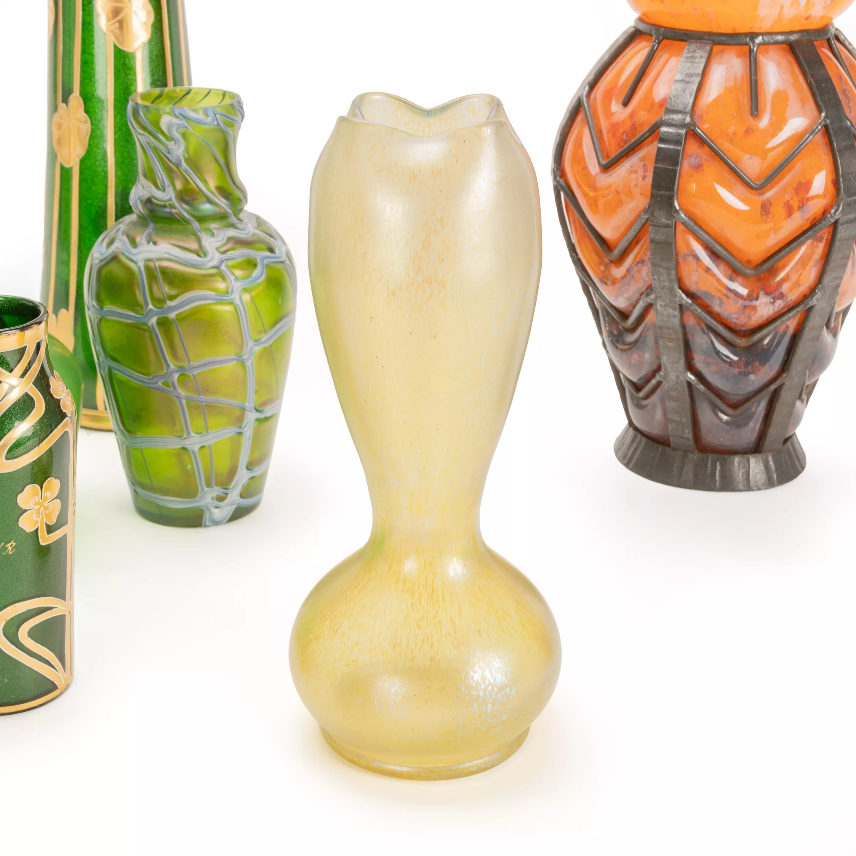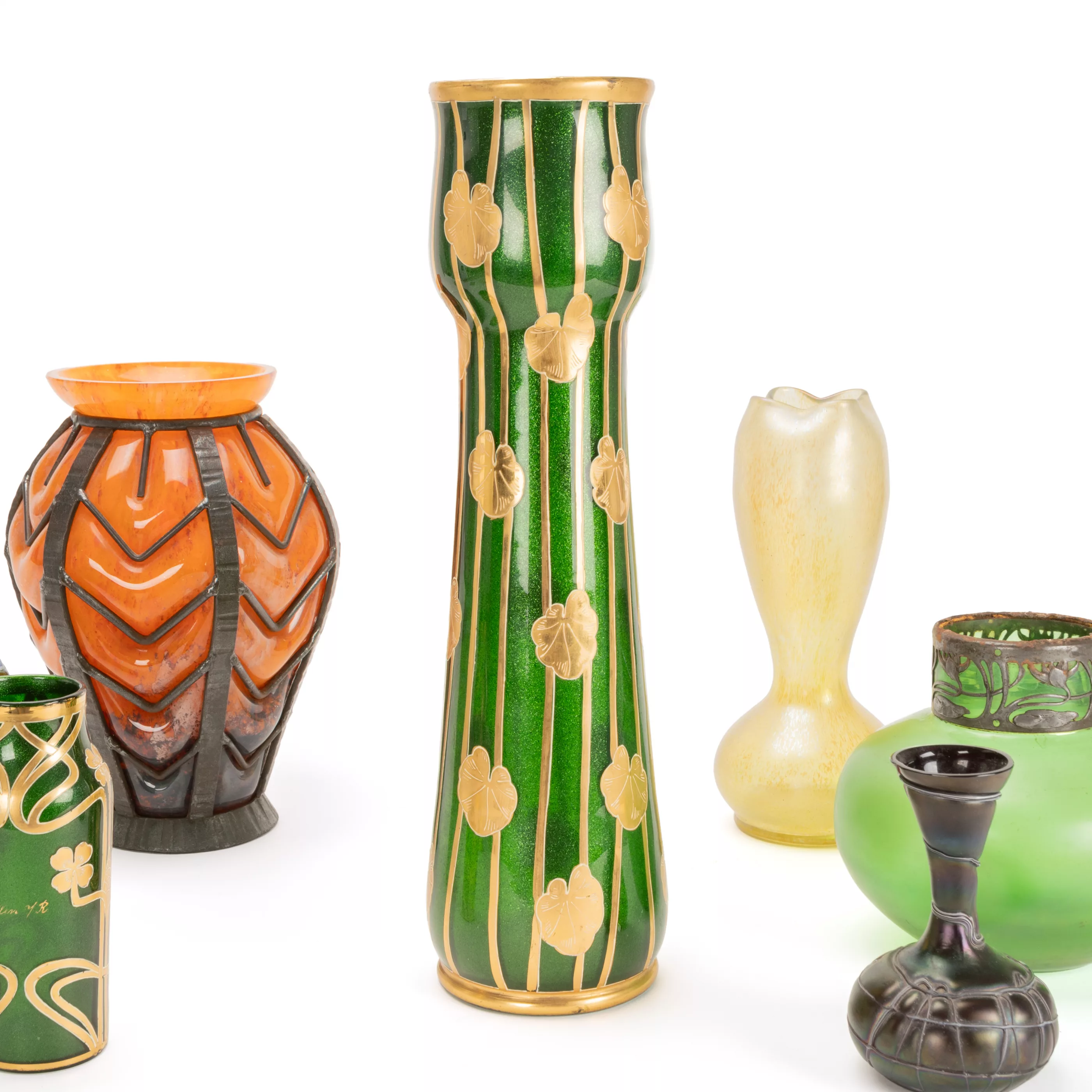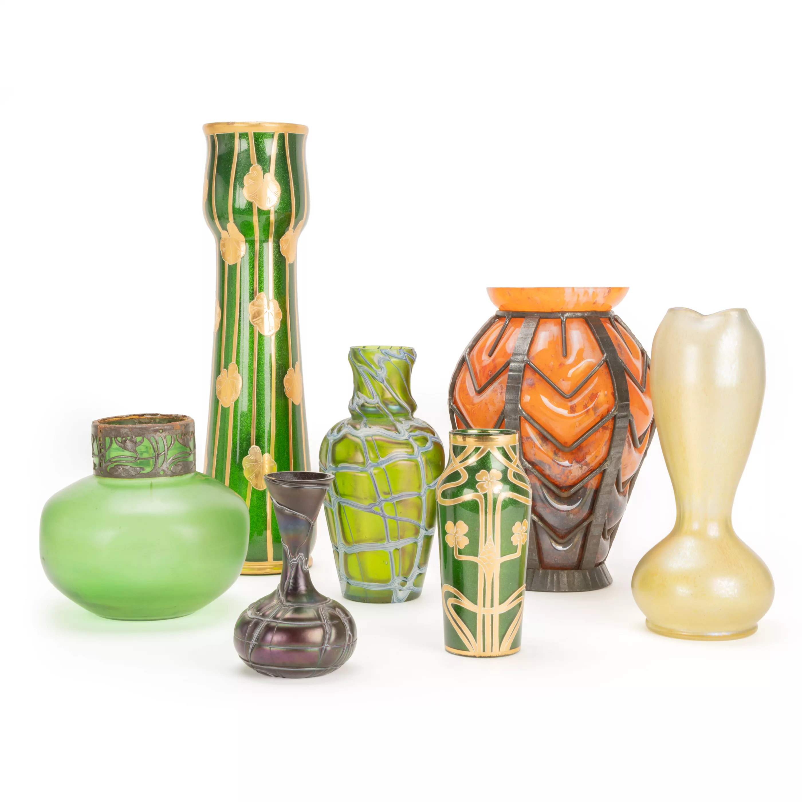 7-piece, c. 1900, colored glass, mouth-blown, metal mounts in places, 2 metallic green vases with gold vine decoration and white staffage, h 16 and 41 cm, one marked Sellin JR, 1 orange-blue vase with iron mount, h 27 cm, 1 green vase with blue and white thread fusions, h 22 cm, 1 black-green-violet iridescent vase with white-black thread fusions, h 13.5, 1 iridescent yellow-green vase, h 25 cm and 1 green vase with floral metal mount on the rim, h 16 cm, metal mounts partially with traces of rust, partial rubbing and slight soiling