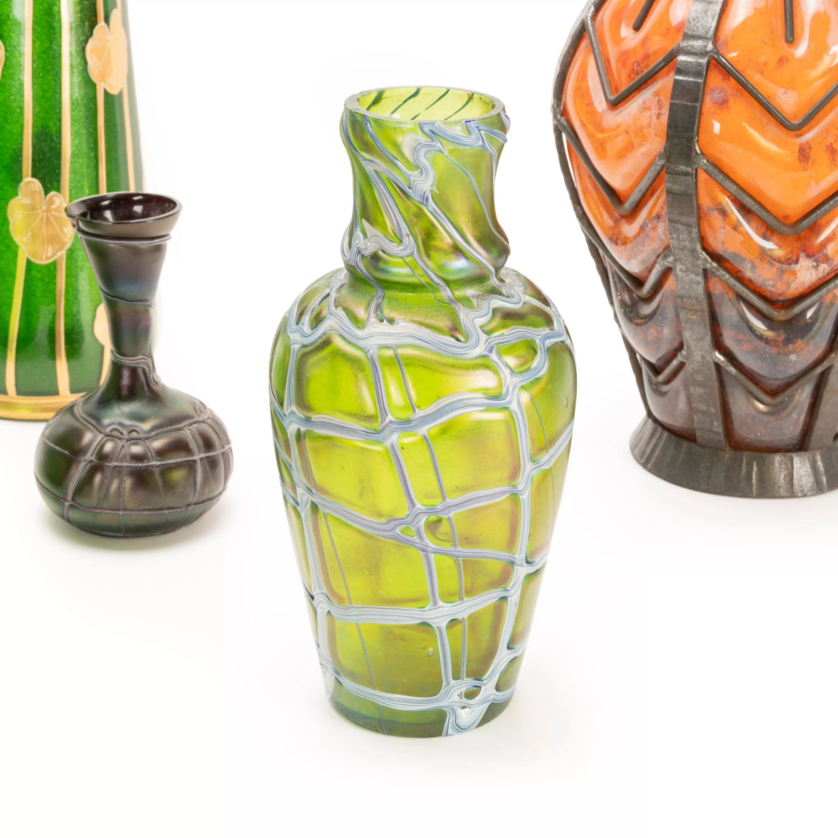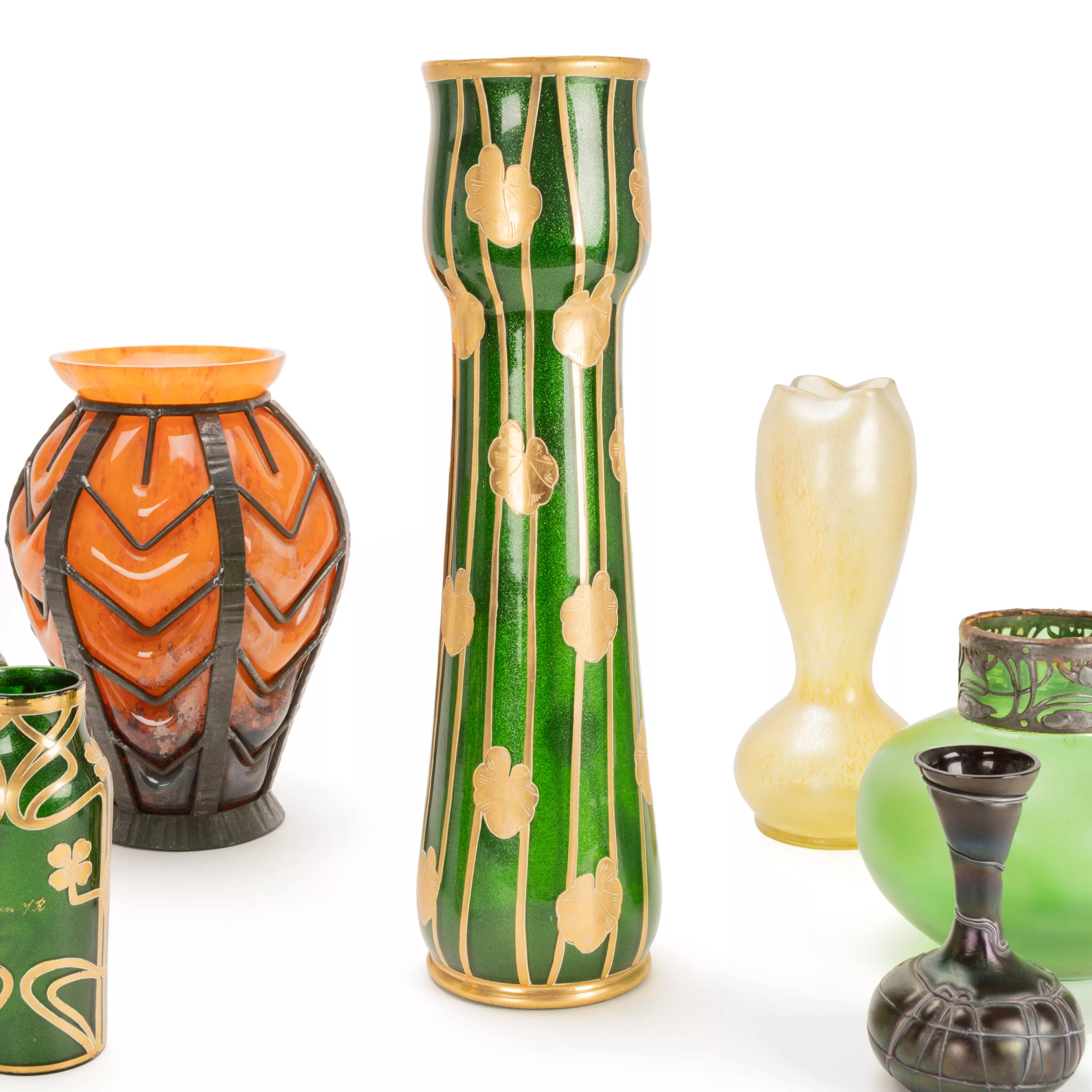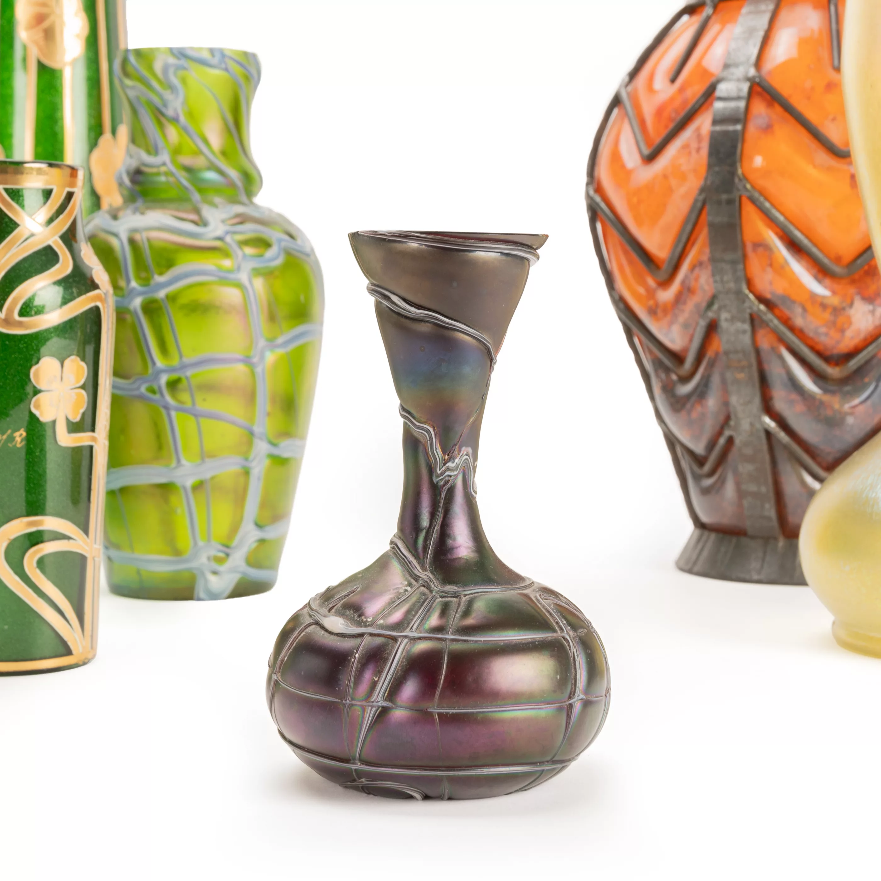 7-piece, c. 1900, colored glass, mouth-blown, metal mounts in places, 2 metallic green vases with gold vine decoration and white staffage, h 16 and 41 cm, one marked Sellin JR, 1 orange-blue vase with iron mount, h 27 cm, 1 green vase with blue and white thread fusions, h 22 cm, 1 black-green-violet iridescent vase with white-black thread fusions, h 13.5, 1 iridescent yellow-green vase, h 25 cm and 1 green vase with floral metal mount on the rim, h 16 cm, metal mounts partially with traces of rust, partial rubbing and slight soiling