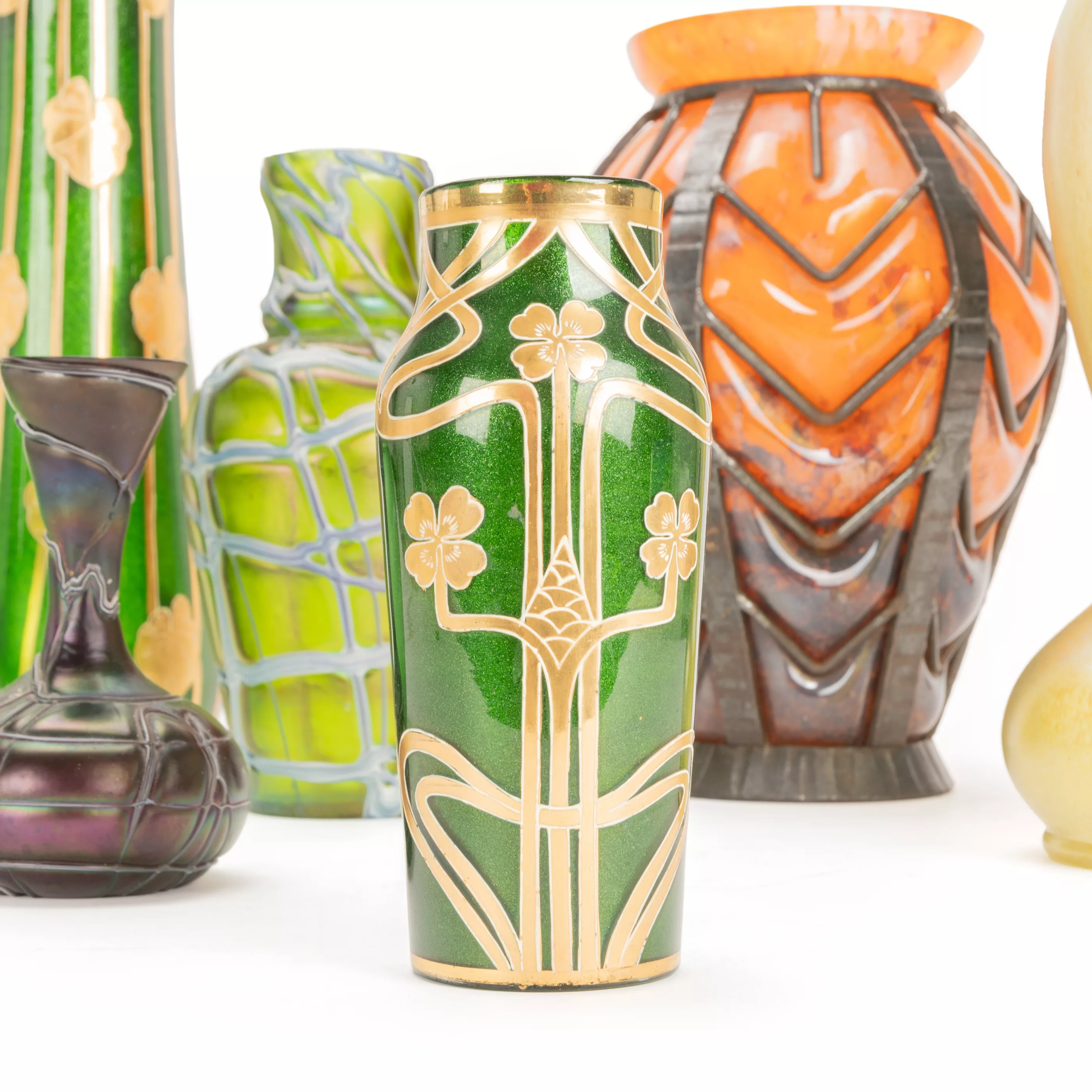 7-tlg., um 1900, farbiges Glas, mundgeblasen, partiell Metallmontierungen, 2 metallic-grüne Vasen mit Goldrankendekor und Weißstaffage, H 16 und 41 cm, eine Sellin JR bezeichnet, 1 orange-blaue Vase mit Eisenmontierung, H 27 cm, 1 grüne Vase mit blau-weißer Fadenaufschmelzungen, H 22 cm, 1 schwarz-grün-violett changierende Vase mit weiß-schwarzen Fadenaufschmelzungen, H 13,5, 1 irrisierend gelb-grüne Vase, H 25 cm und 1 grüne Vase mit floraler Metallmontierung am Rand, H 16 cm, Metallmontierungen partiell mit Rostspuren, partiell Bereibungen und leichte Verschmutzungen