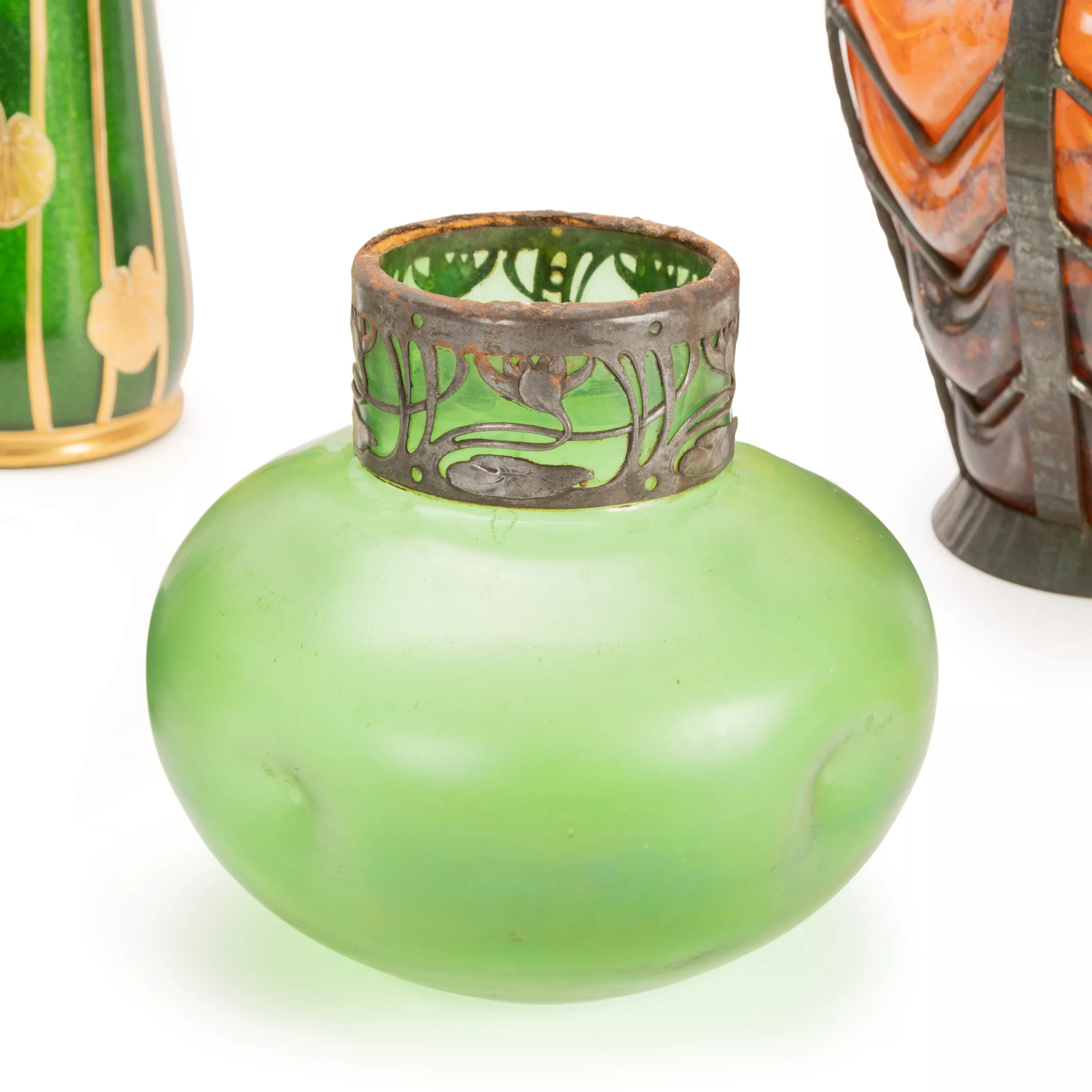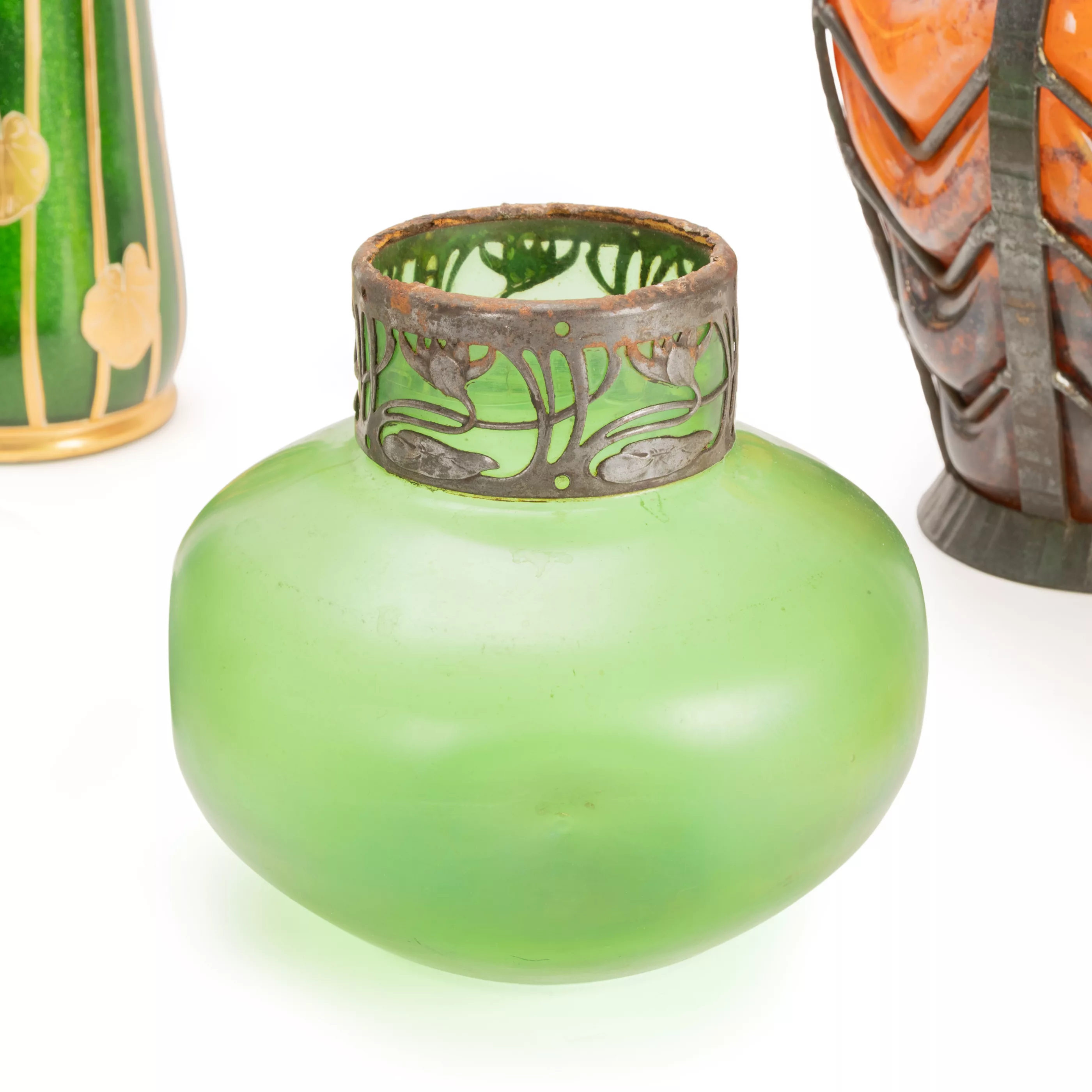 7-tlg., um 1900, farbiges Glas, mundgeblasen, partiell Metallmontierungen, 2 metallic-grüne Vasen mit Goldrankendekor und Weißstaffage, H...