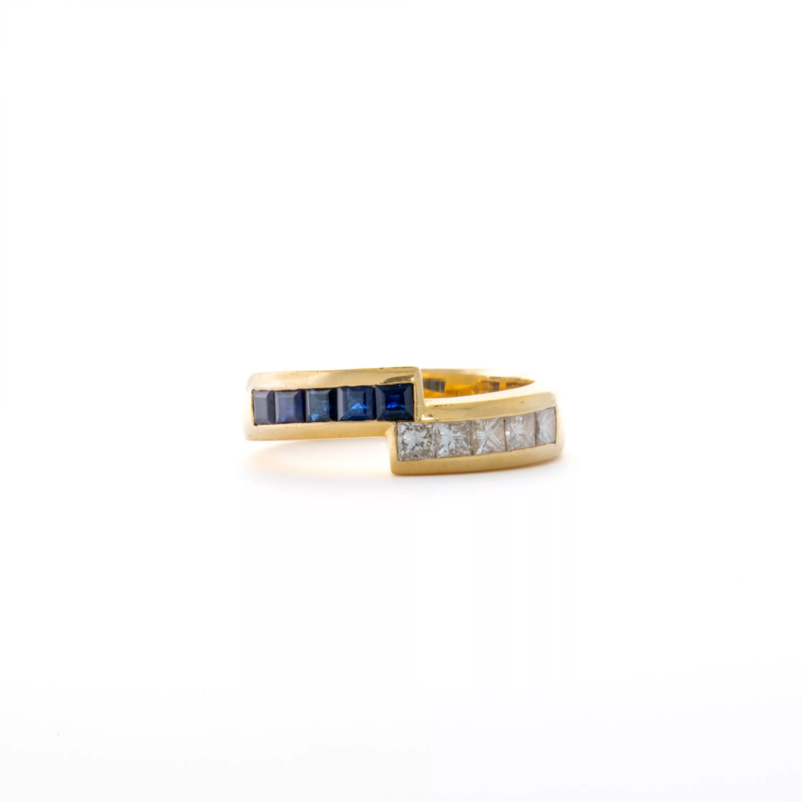 750 yellow gold, hallmarked, set with 5 square-cut diamonds, total approx. 0.4 ct, G, VVS-VSI, and 5 square-cut sapphires, total approx. 0.5 ct, ring size 54, total weight approx. 8 g