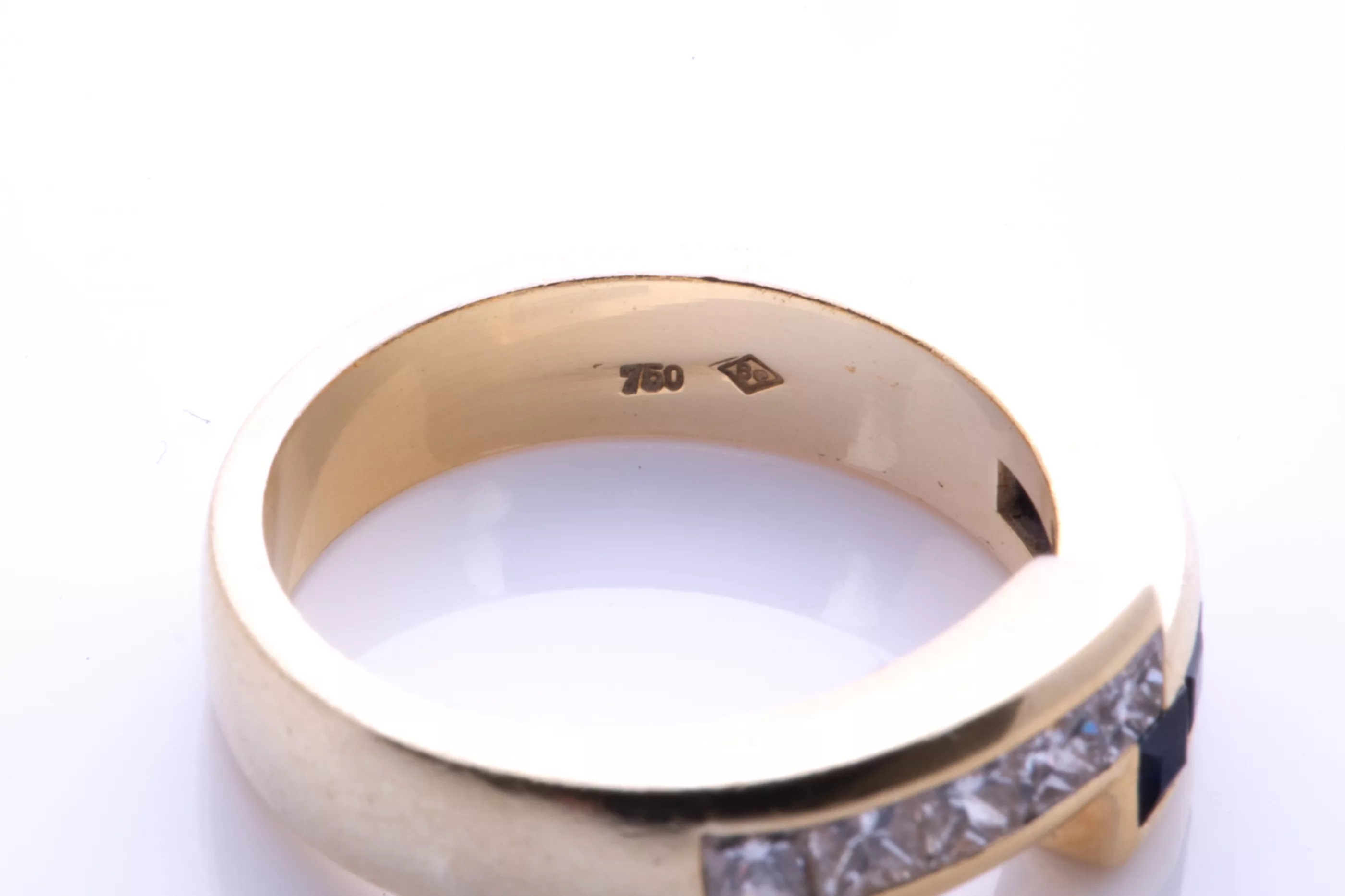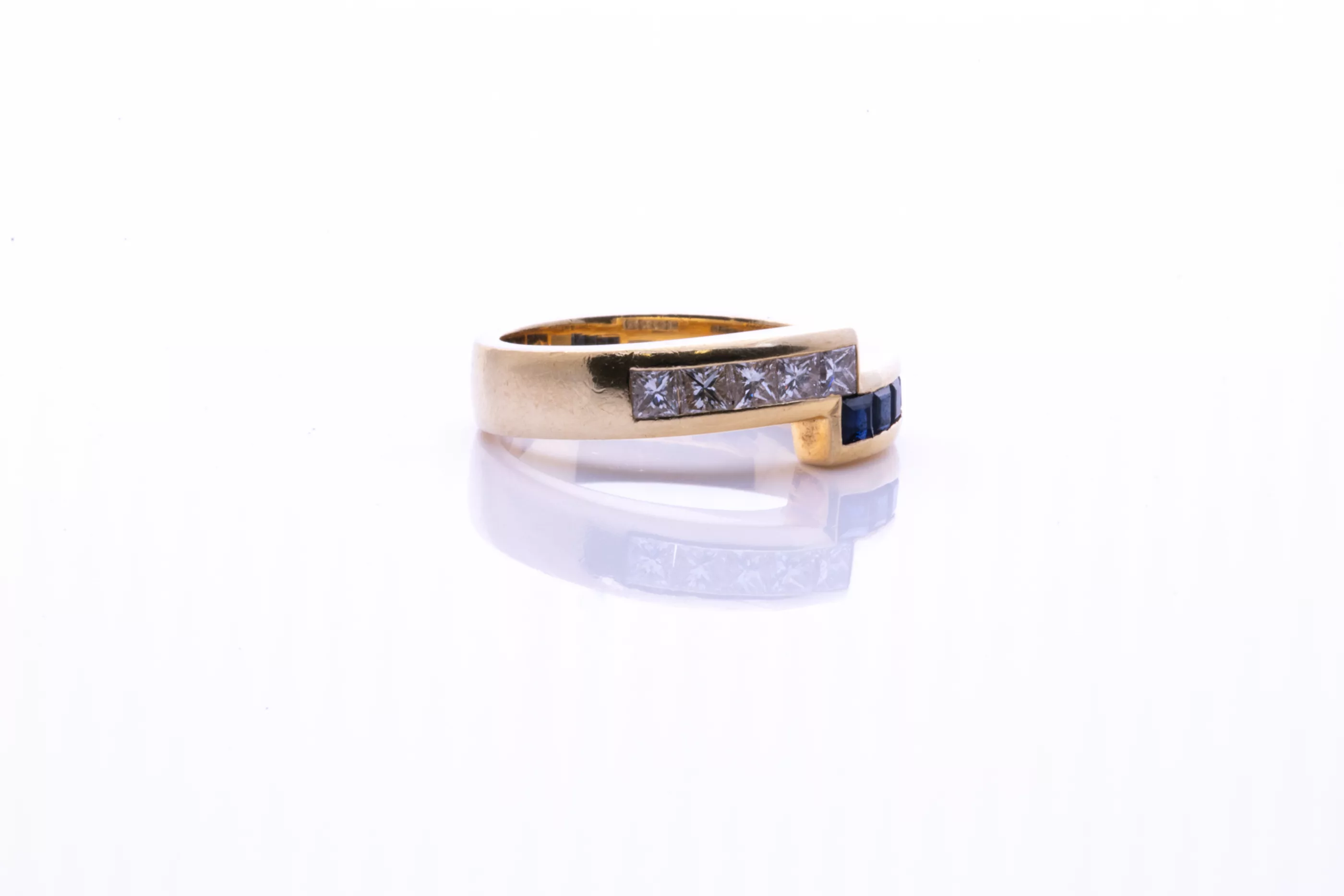 750 Gelbgold, punziert, besetzt mit 5 Diamanten im Carré-Schliff, zus. ca. 0,4 ct, G, VVS-VSI, sowie 5 Saphire im Carré-Schliff, zus. ca. 0,5 ct, Ringgröße 54, Gesamtgewicht ca. 8 g