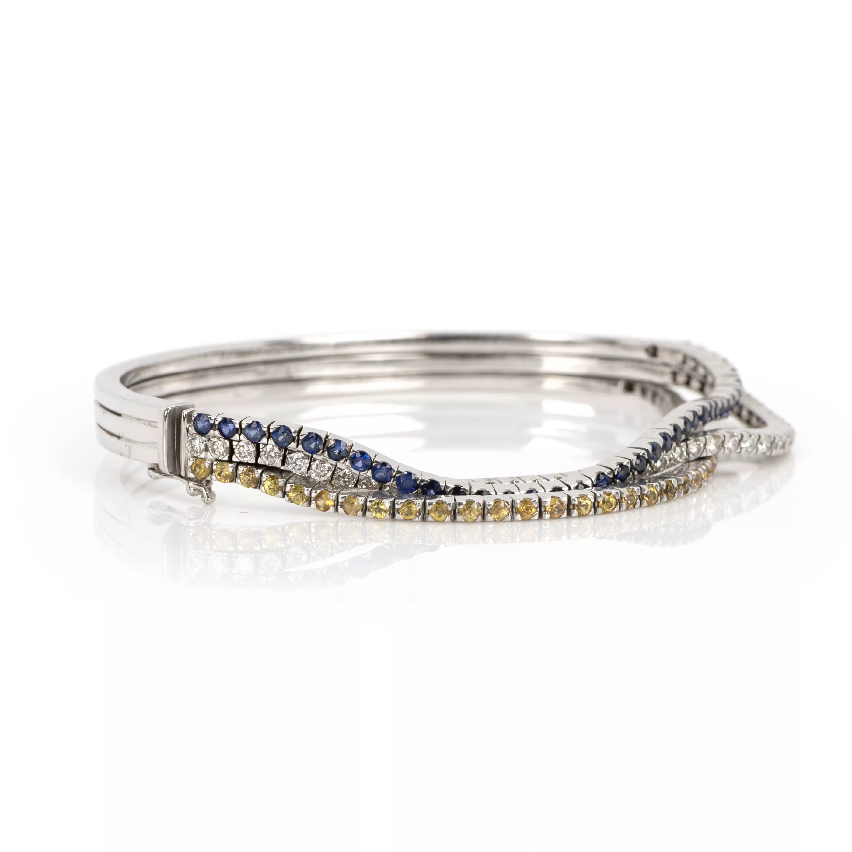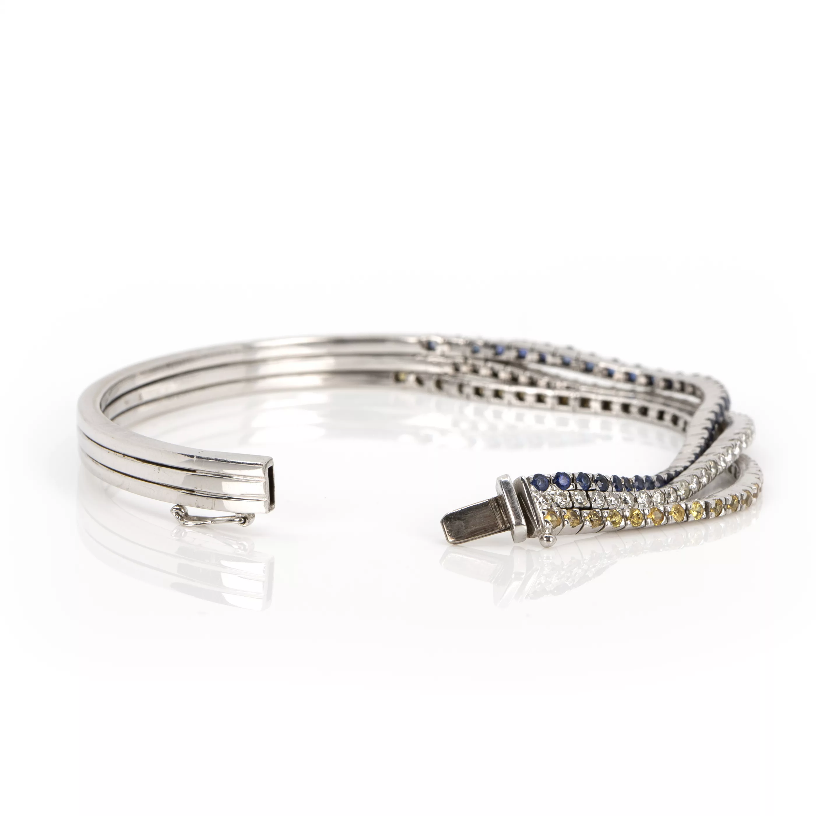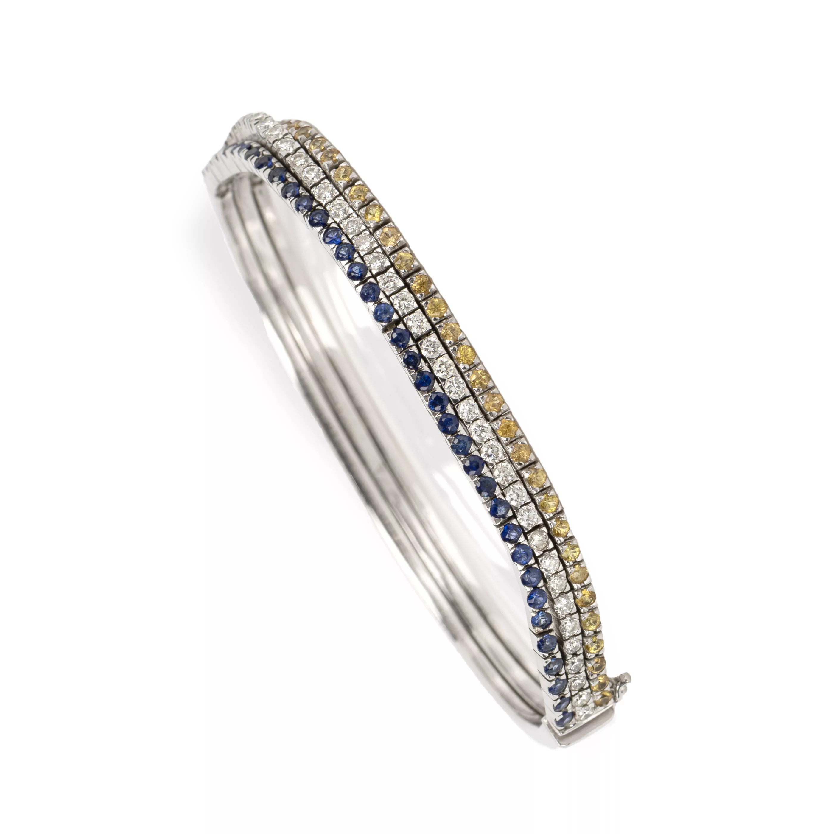 750 Weißgold, punziert, 41 Diamanten im Brillantschliff, gesamt ca. 0,82 ct, H, si-pi, 76 blaue und gelbe Saphire, gesamt ca. 3,00 ct, Länge 17 cm, Gewicht ca. 30,7 g