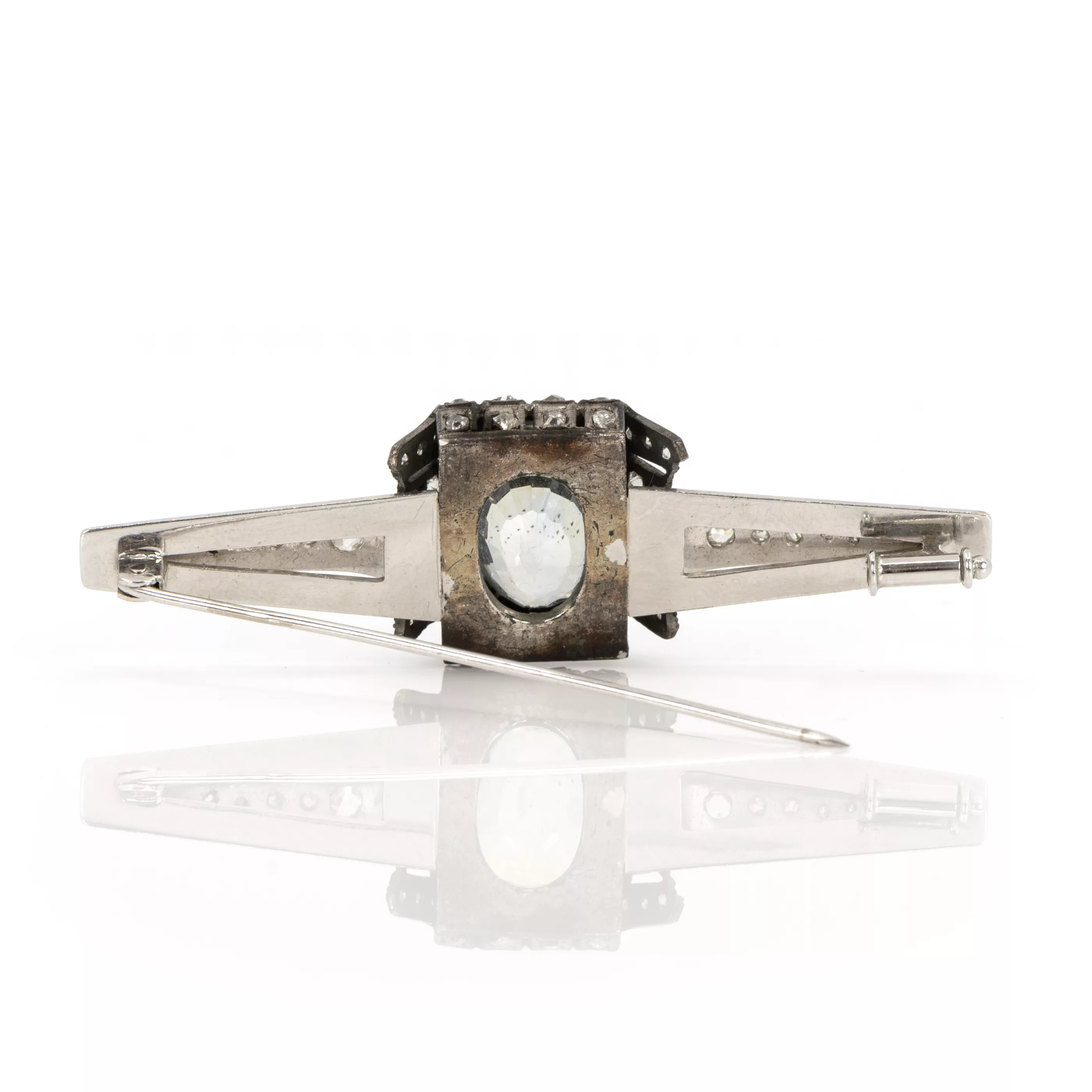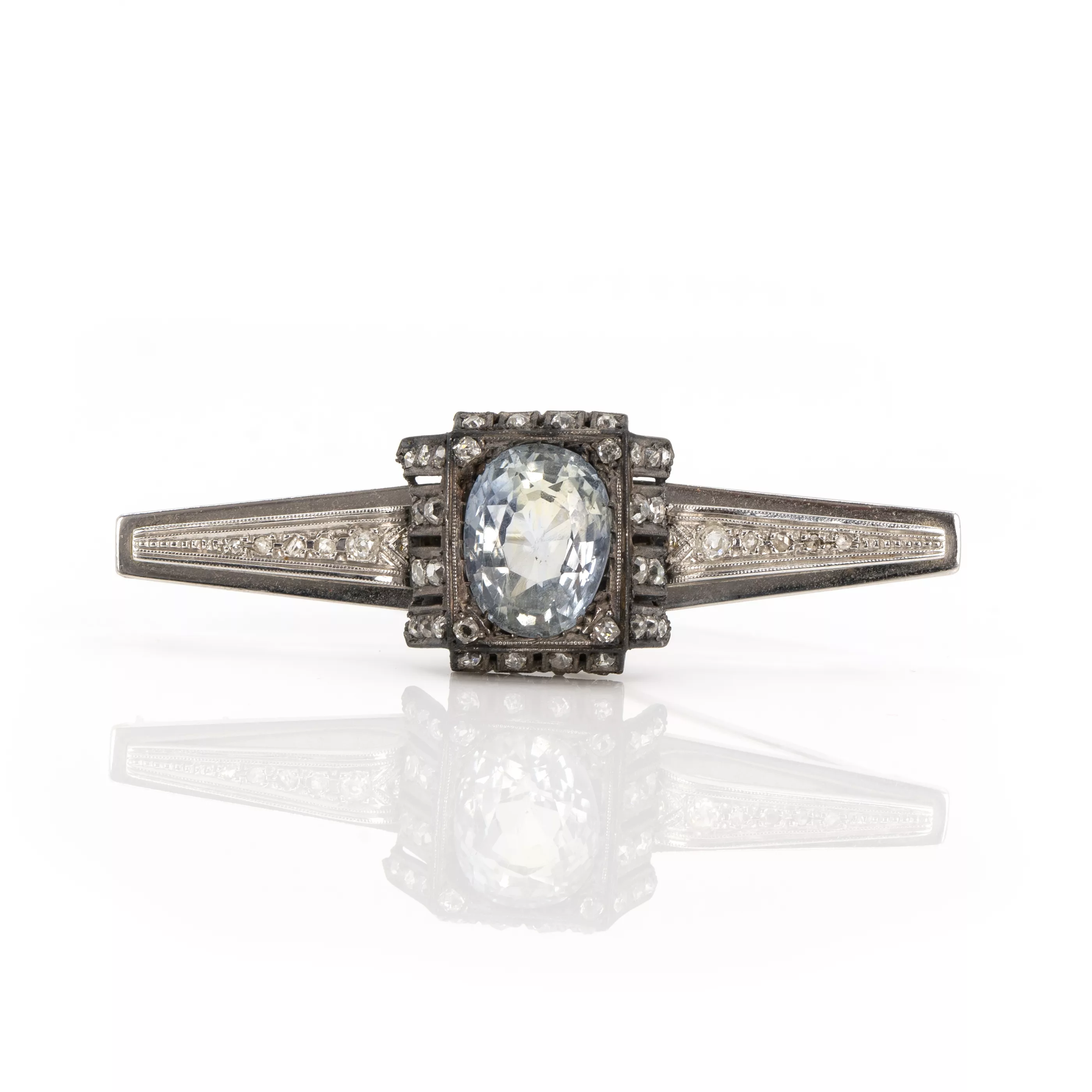 Centerpiece circa 1870, silver, tested, the sides and pin added later, 50 old- and rose-cut diamonds, total approx. 1.50 ct, the centerpiece with a light blue oval-cut sapphire, approx. 10.76 ct, length 6 cm, width 1.9 cm, weight approx. 12.4 g