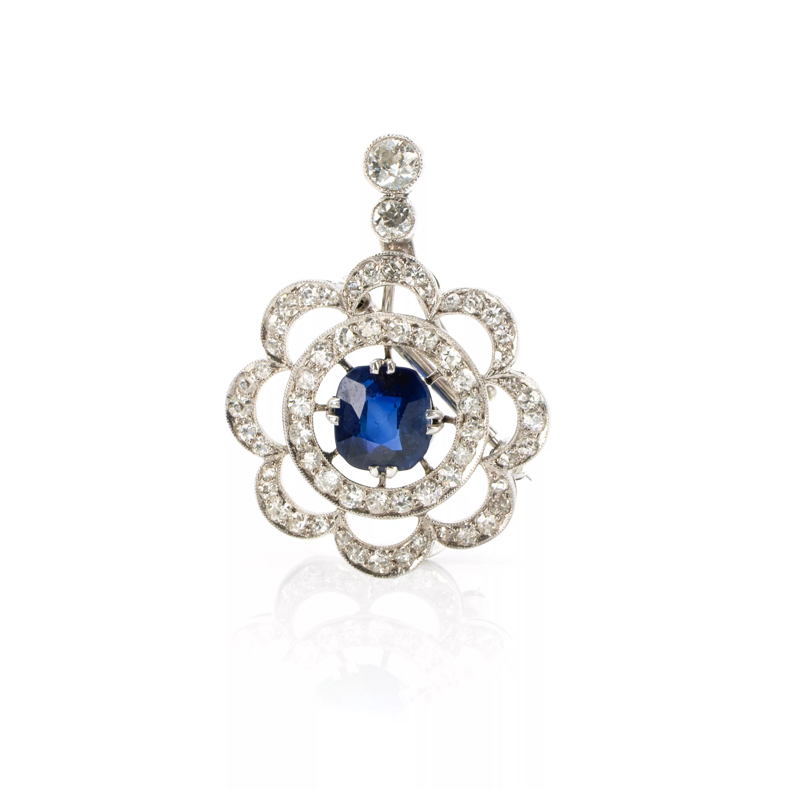 750 Weißgold, geprüft, 62 Diamanten im Alt- und Achtkantschliff, gesamt ca. 1,15 ct, H, vs-pi1, oval facettierter Saphir, ca. 1,82 ct, Länge 3,2 cm, Breite 2,5 cm, Gewicht ca. 6,3 g, Saphir mit minimalen Tragespuren
