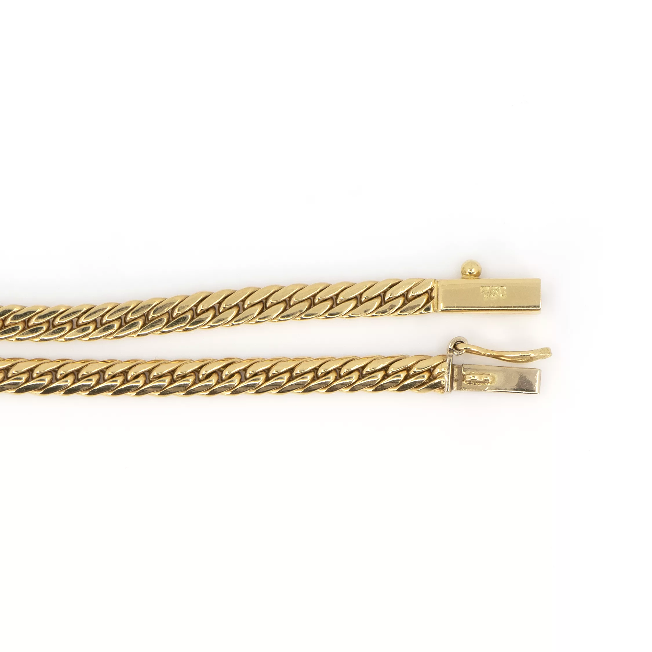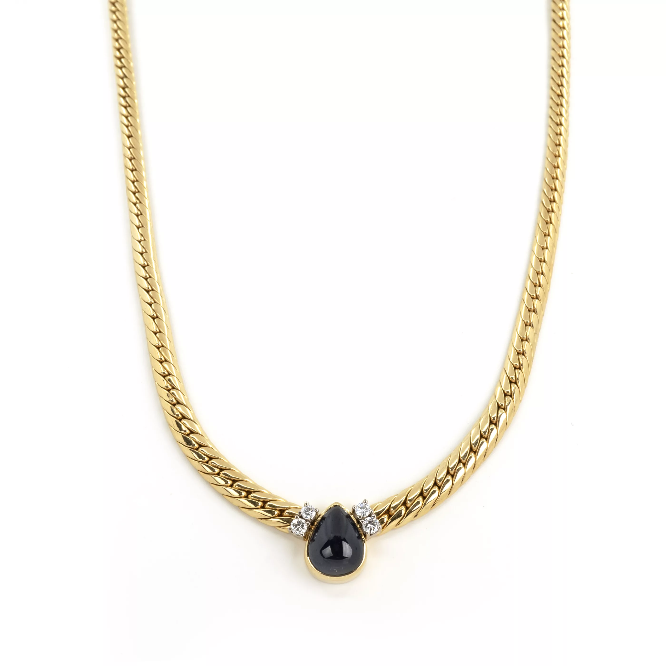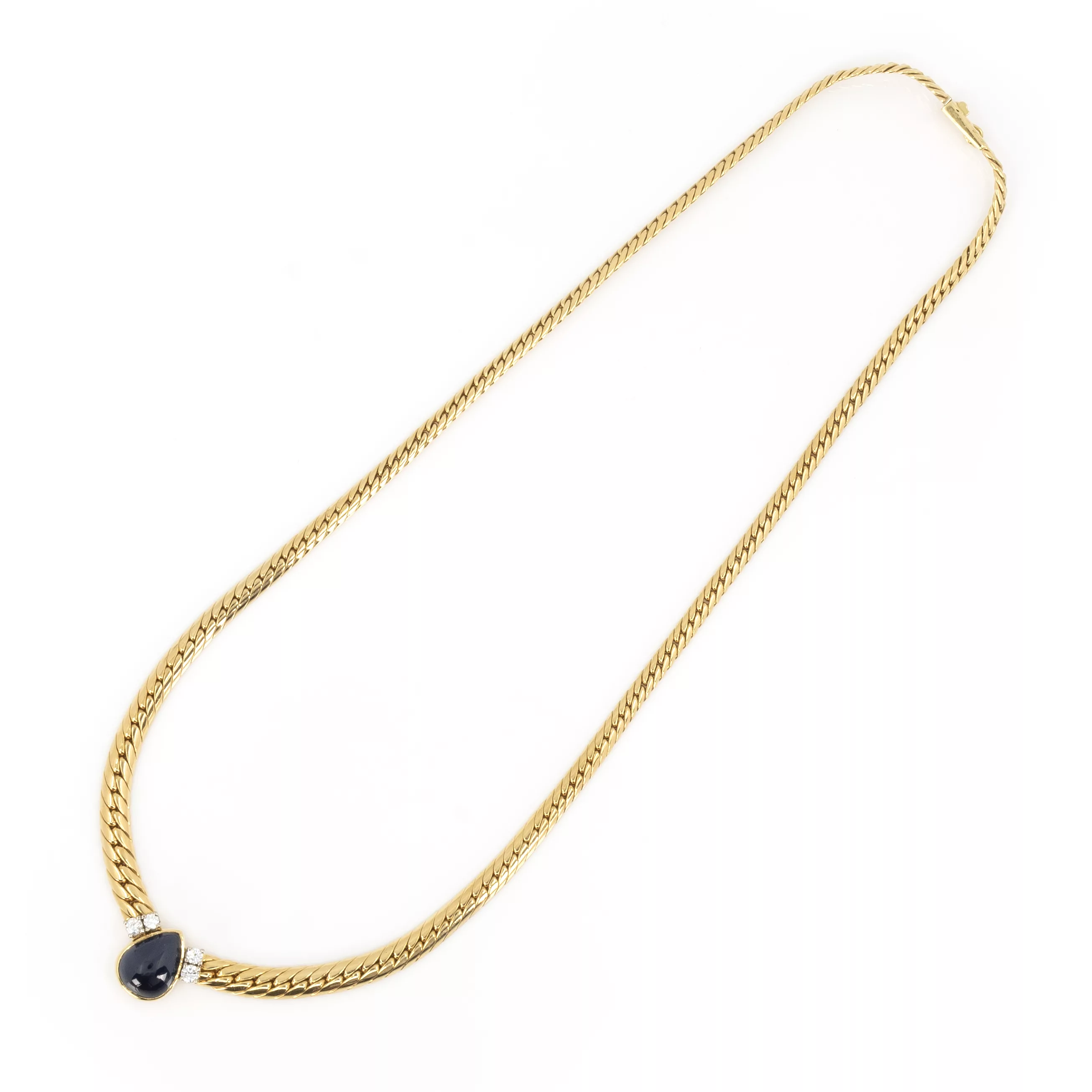 750 yellow gold, hallmarked, 4 brilliant-cut diamonds, total approx. 0.24 ct, H, vs, drop-shaped sapphire cabochon approx. 2.65 ct, chain length 40 cm, weight approx. 27.3 g