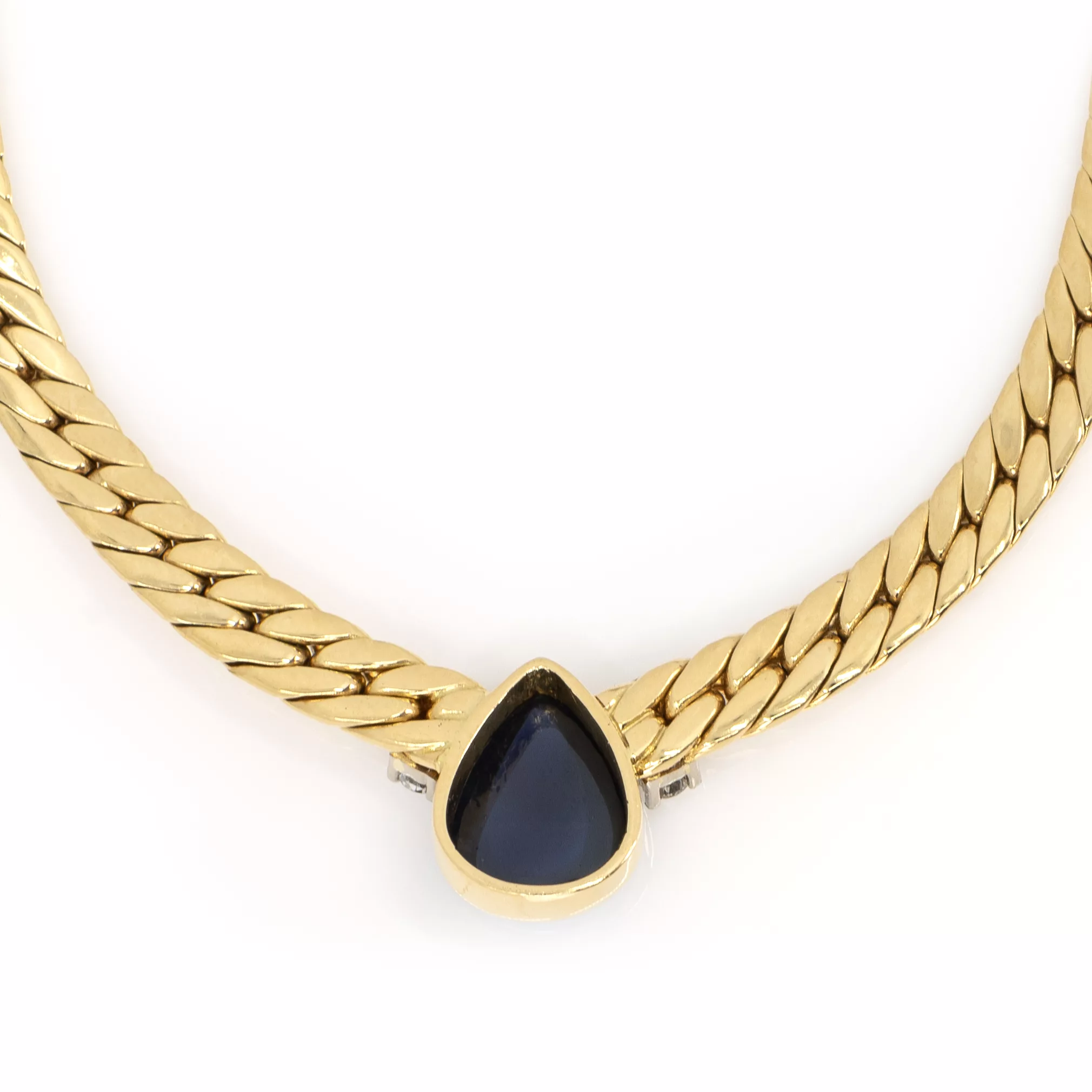 750 Gelbgold, punziert, 4 Diamanten im Brillantschliff, gesamt ca. 0,24 ct, H, vs, tropfenförmiger Saphircabochon ca. 2,65 ct, Länge Kette 40 cm, Gewicht ca. 27,3 g