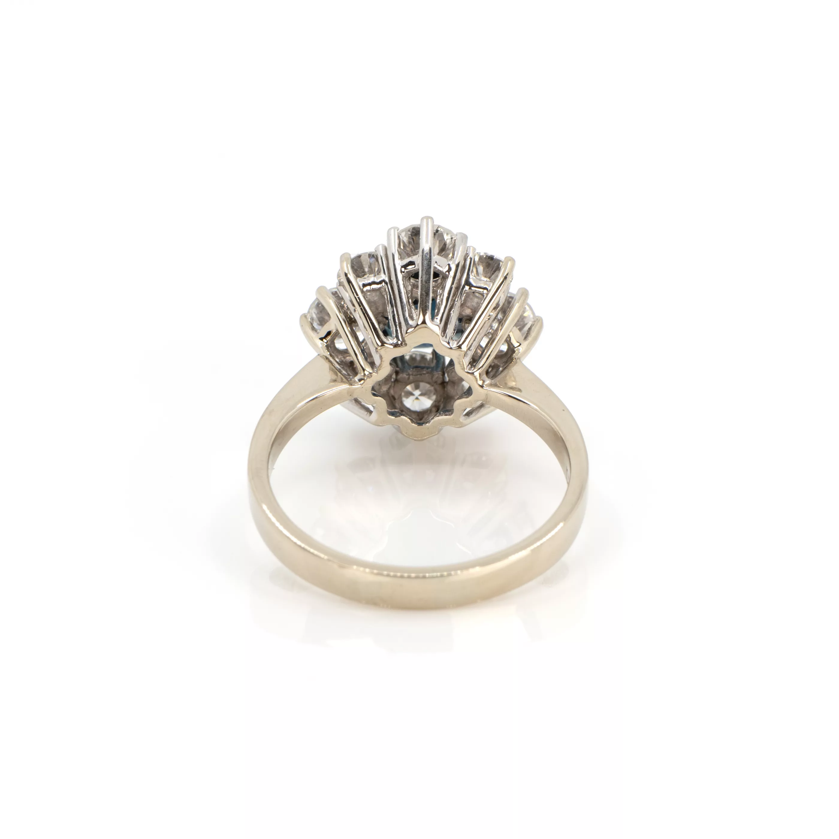 585 white gold, hallmarked, 8 brilliant-cut diamonds, total approx. 1.80 ct, G, vvs, central, faceted oval-cut sapphire, approx. 1.50 ct, RW 56, weight approx. 5.2 g