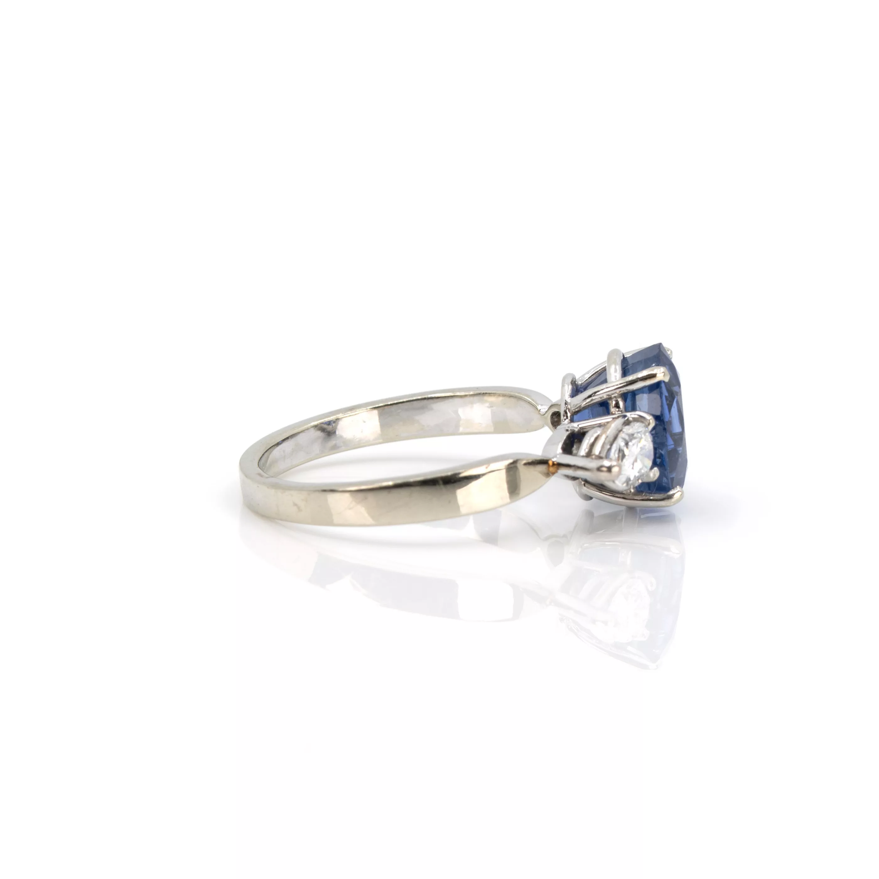 750 Weißgold, punziert, 2 Diamanten im Tropfenschliff, gesamt ca. 0,50 ct, G, vvs, zentraler Saphir im Ovalschliff, ca. 3,55 ct, RW 53, Gewicht ca. 4,1 g, Saphir mit minimalen Tragespuren