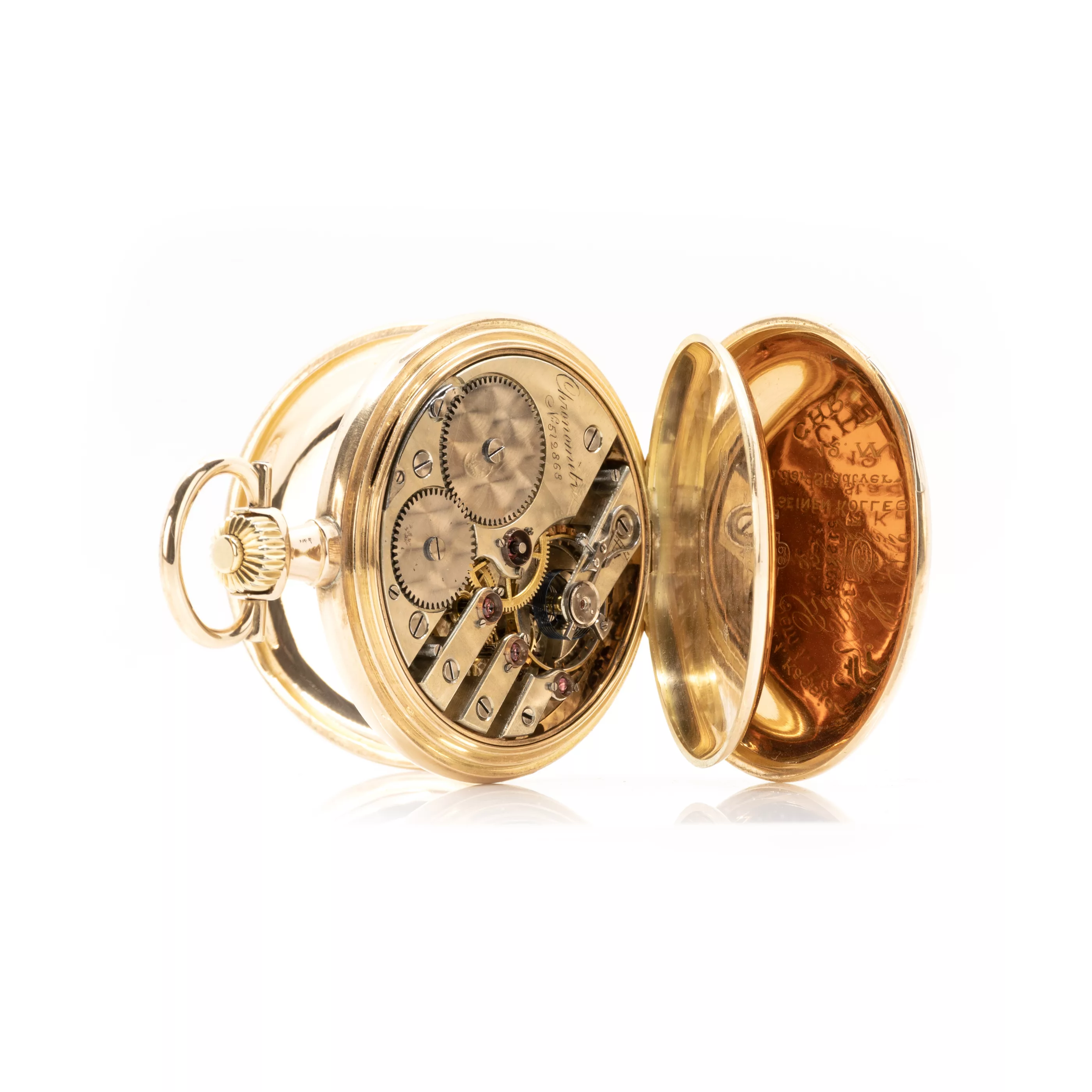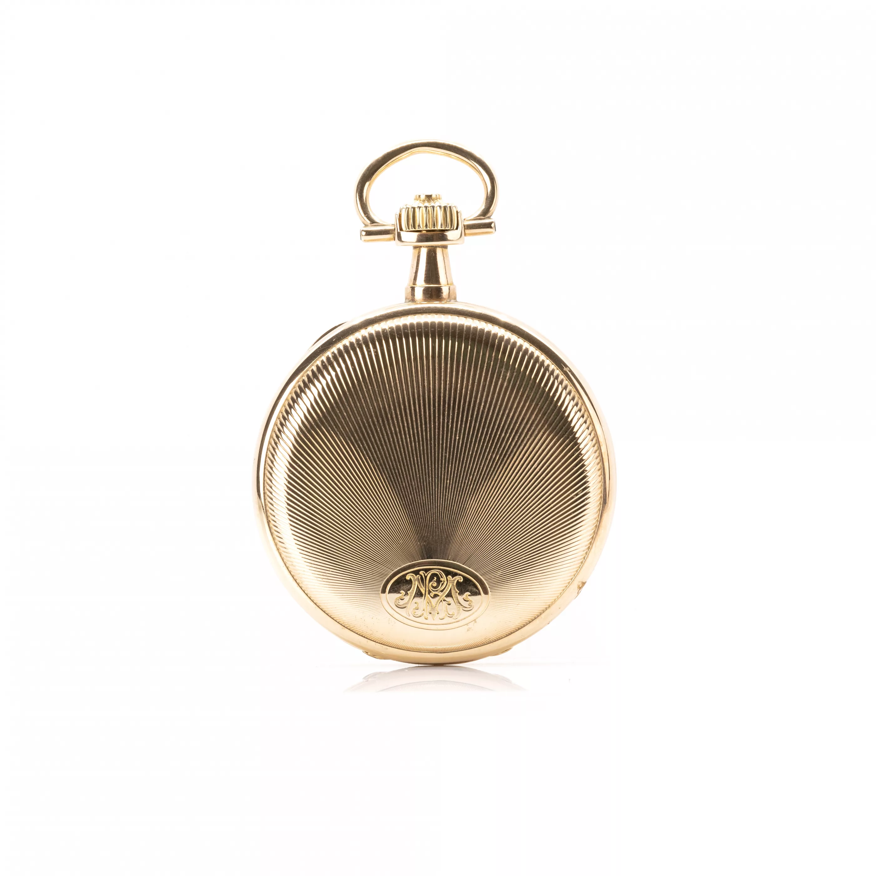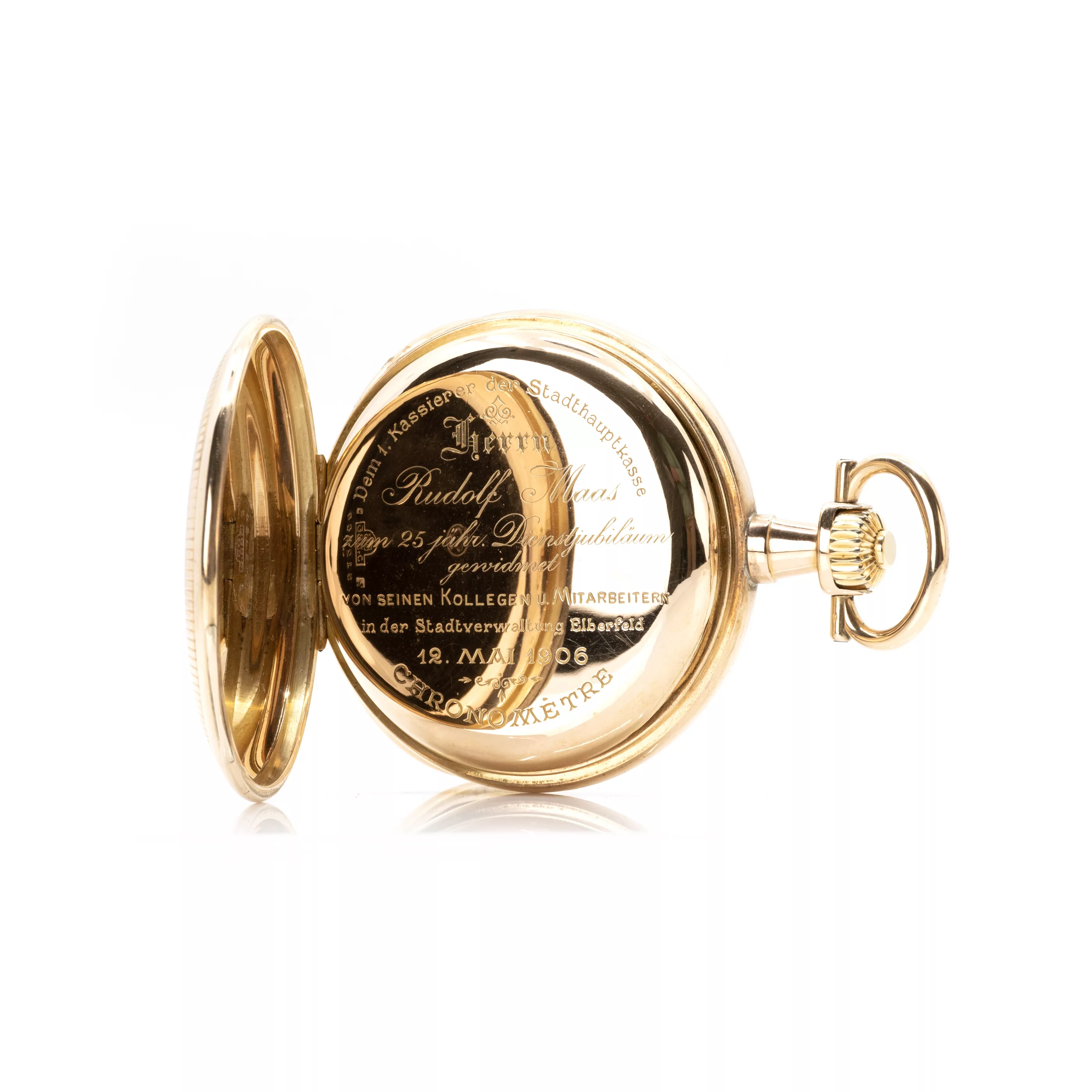 Switzerland, 1906, manual winding, rocking bar chronometer escapement, 4 screwed chatons, cylindrical balance spring, all wheels chatoned, swan neck fine regulation, case 585 red gold, hallmarked, intermediate cover 585 red gold, hallmarked, white enamel dial with black Arabic numerals, small second, steel hands, case engine-turned and with monogram RM, dust cover engraved 'Dem 1. Dedicated to the first cashier of the city treasury Mr. Rudolf Maas, for his 25th anniversary of service by his colleagues and employees in the city administration of Elberfeld May 12, 1906 Chronometre', case, dust cover and movement no. 512868, diameter 52 mm, weight approx. 117.2 g, function tested, starts, stops, in need of repair, satisfactory condition, glass replaced, plastic