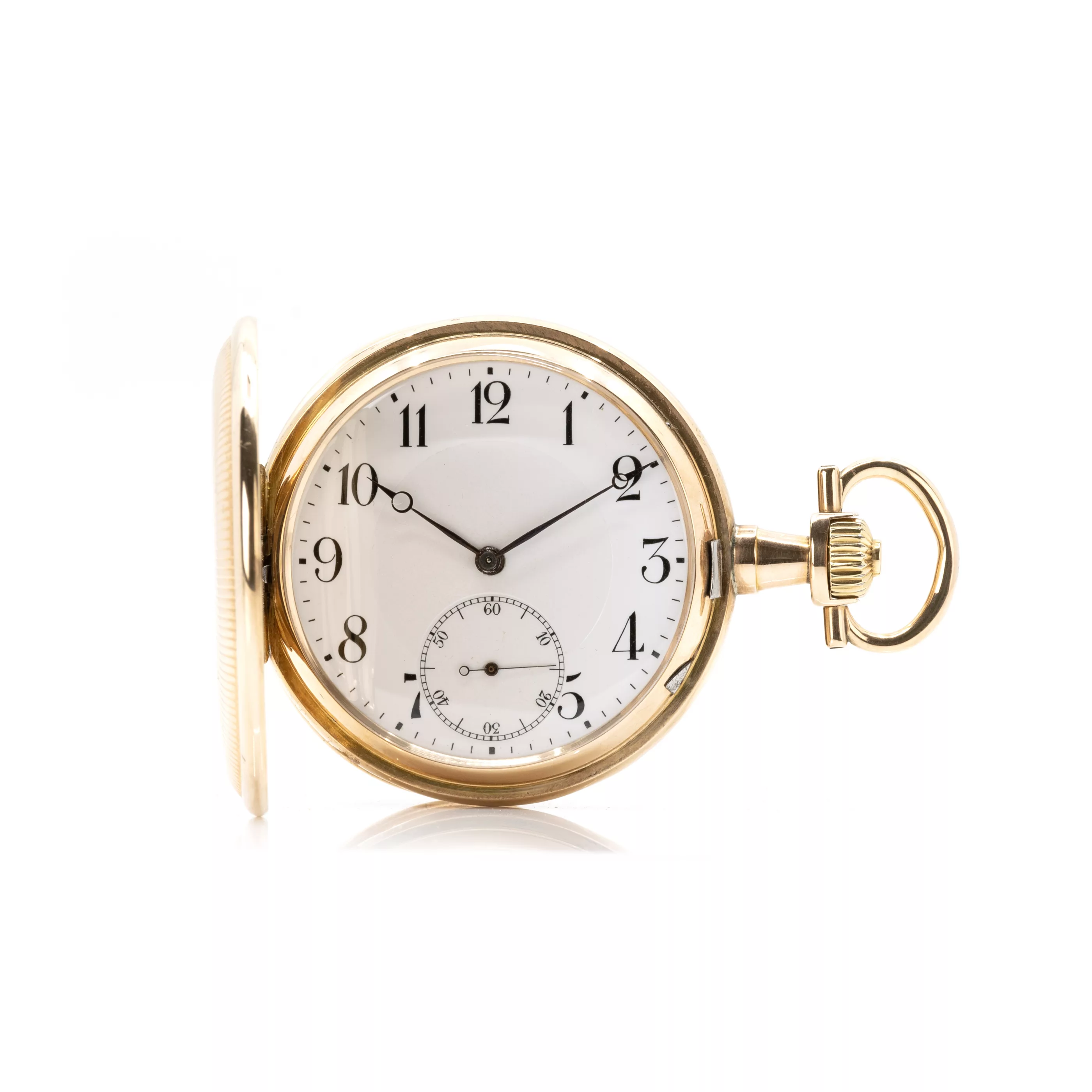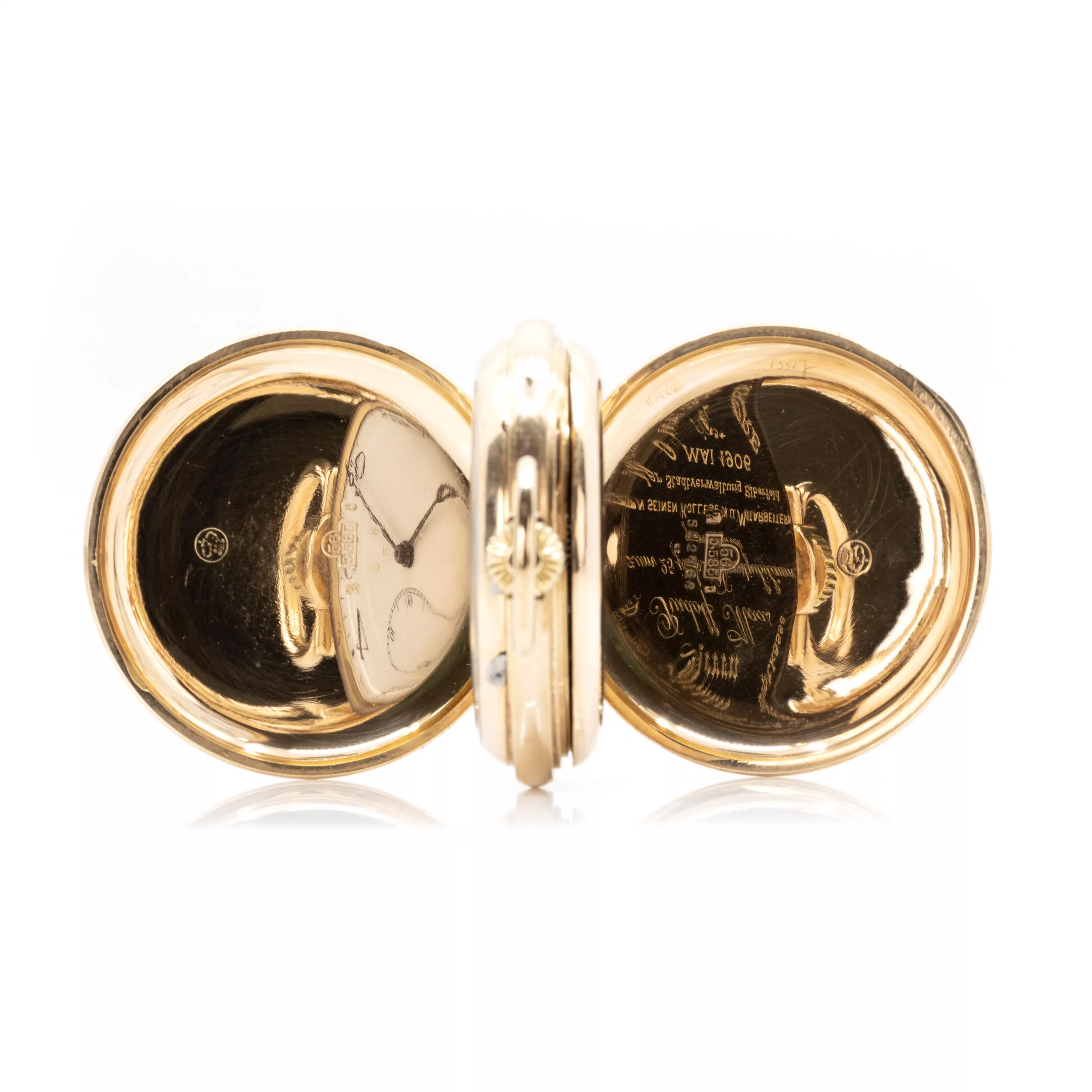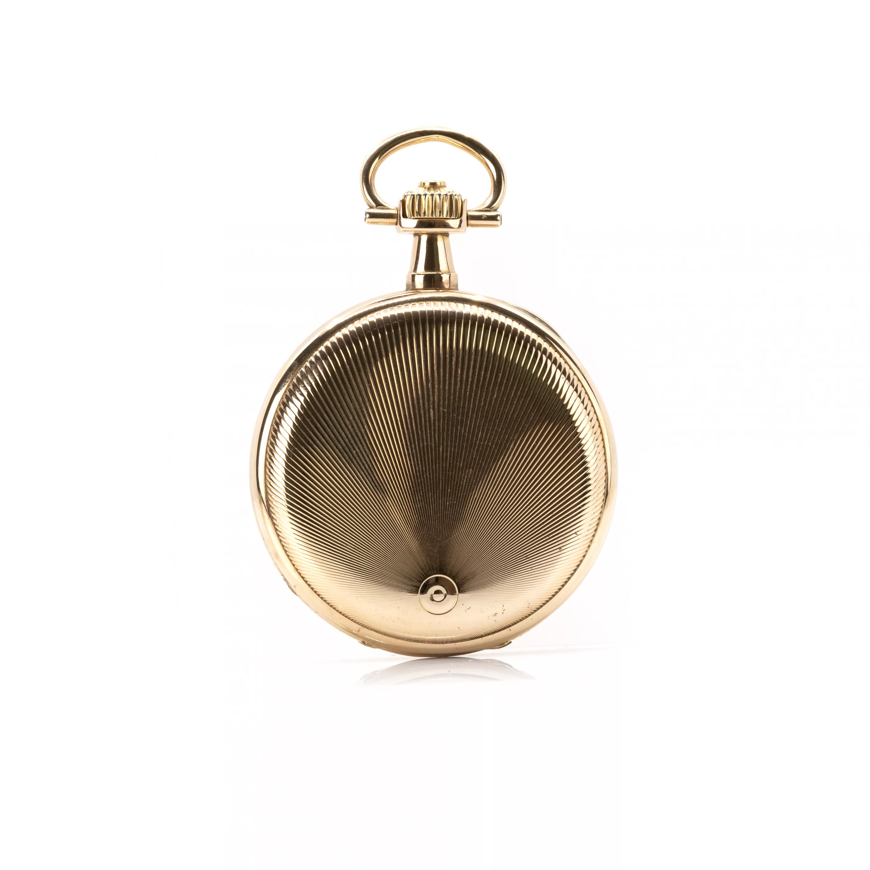 Switzerland, 1906, manual winding, rocking bar chronometer escapement, 4 screwed chatons, cylindrical balance spring, all wheels chatoned, swan neck fine regulation, case 585 red gold, hallmarked, intermediate cover 585 red gold, hallmarked, white enamel dial with black Arabic numerals, small second, steel hands, case engine-turned and with monogram RM, dust cover engraved 'Dem 1. Dedicated to the first cashier of the city treasury Mr. Rudolf Maas, for his 25th anniversary of service by his colleagues and employees in the city administration of Elberfeld May 12, 1906 Chronometre', case, dust cover and movement no. 512868, diameter 52 mm, weight approx. 117.2 g, function tested, starts, stops, in need of repair, satisfactory condition, glass replaced, plastic