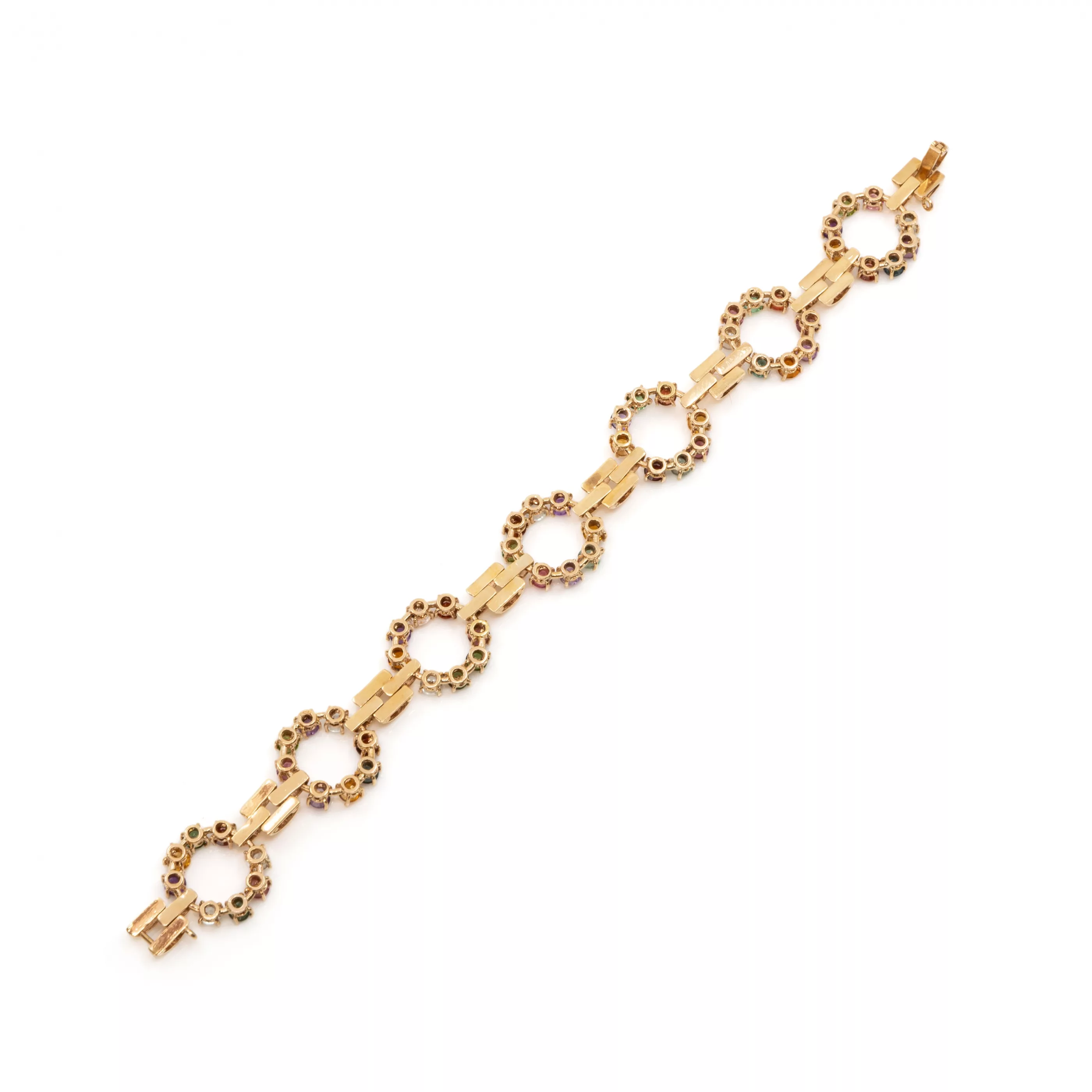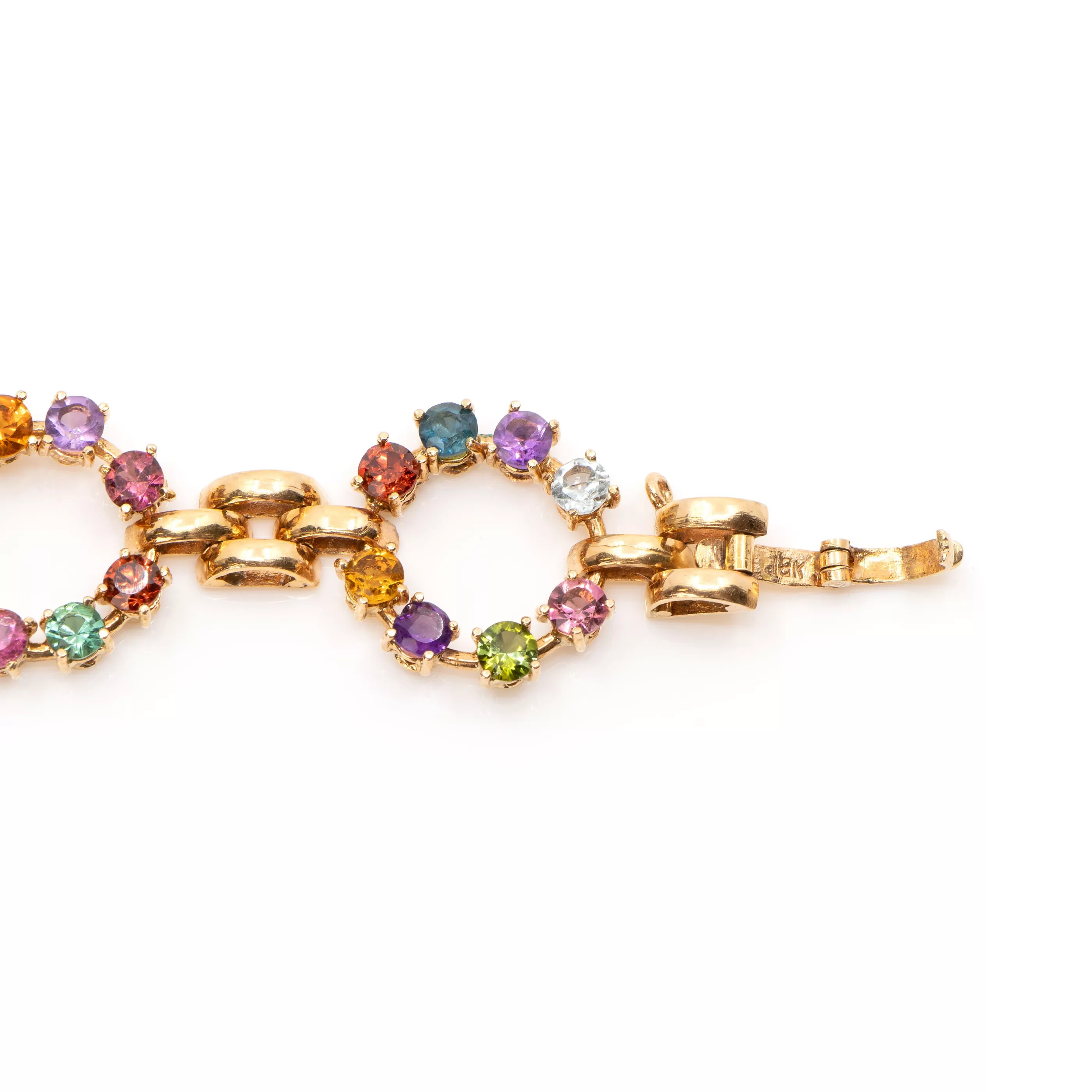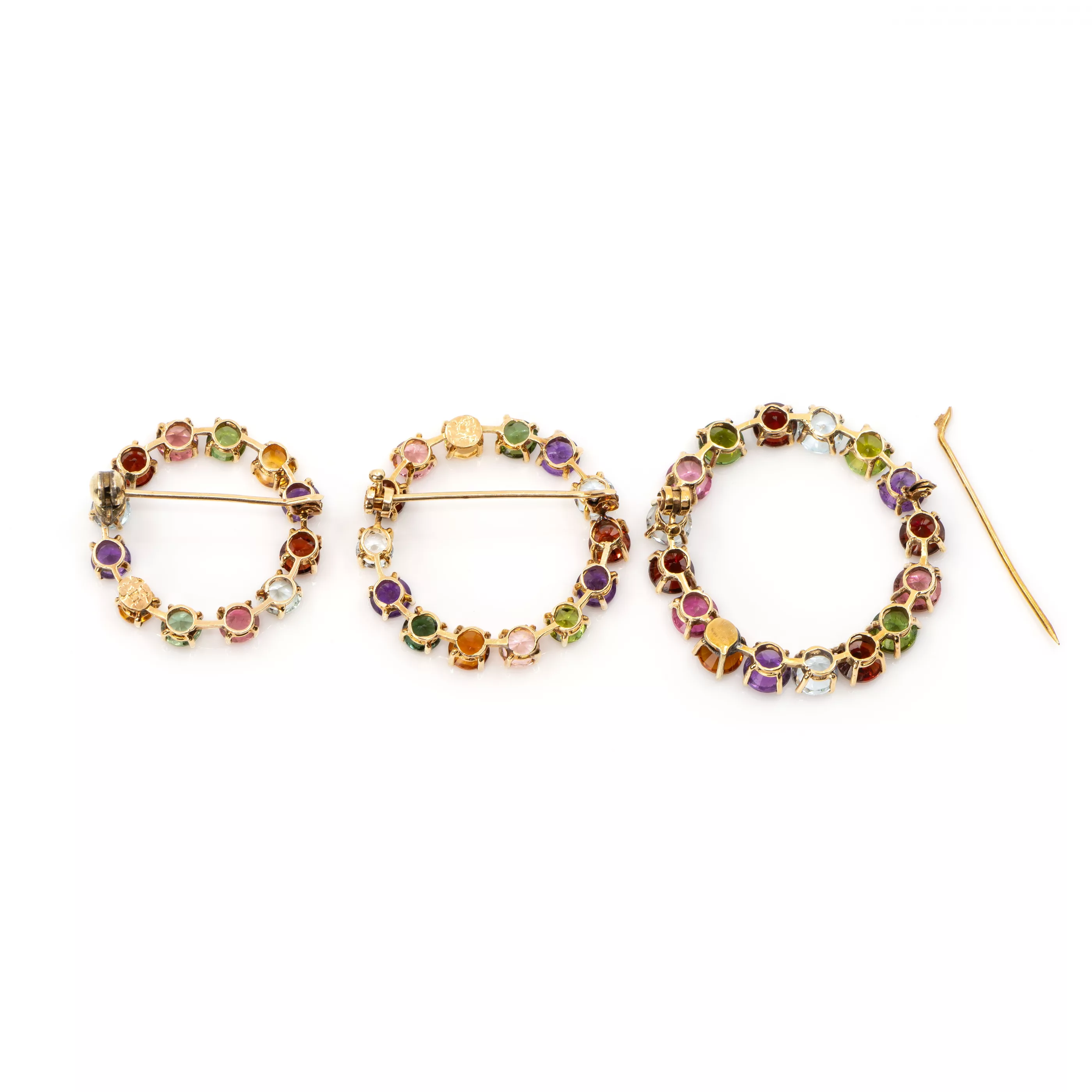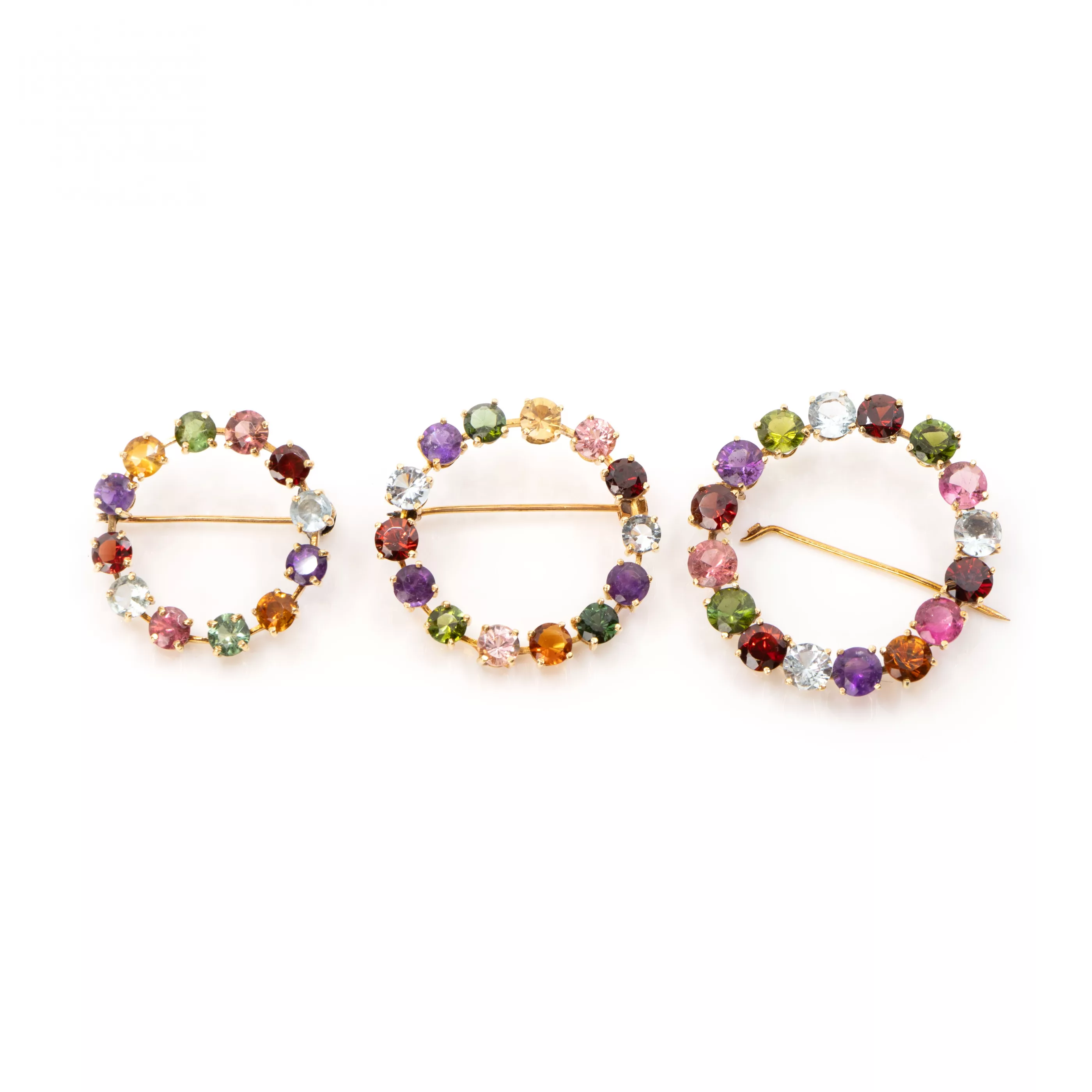 5-pcs., Maximino, Brazil, 750 rose and yellow gold, hallmarked, round faceted amethysts, citrines, tanzanites, kunsites, garnets, topazes and tourmalines, total approx. 19,5 ct, length bracelet 17,5 cm, length pendant 3 cm, Ø brooches 2,5 cm - 3 cm, total weight approx. 32 g, one brooch damaged, pin attached