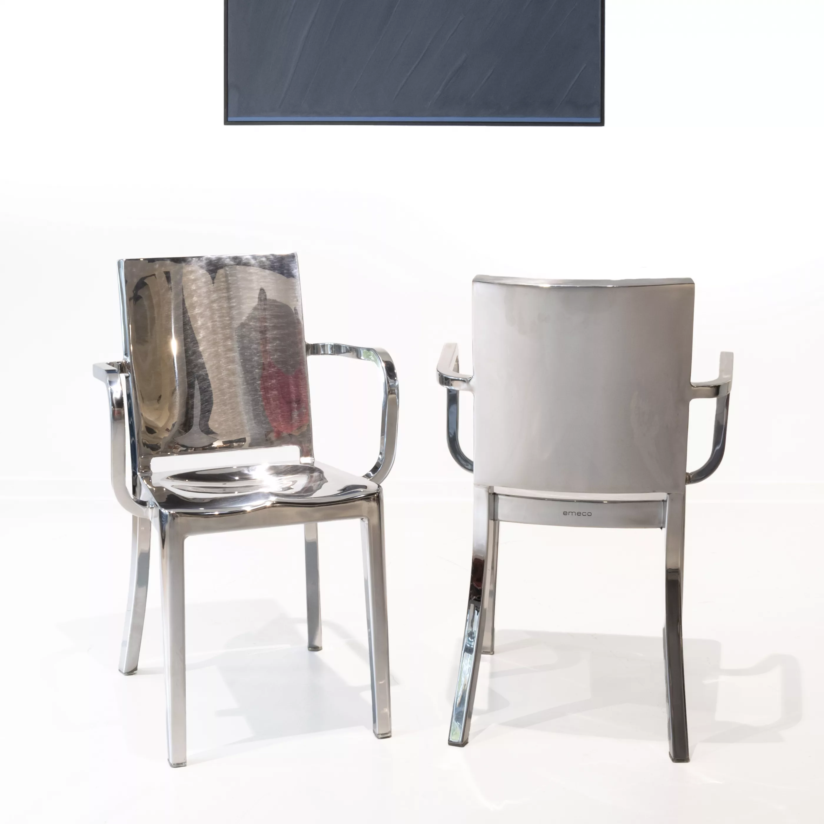 2-tlg., Emeco, USA, Entwurf von Philippe Starck (1949) aus dem Jahr 2000, handpoliertes 80 % recyceltes Aluminium, unterseitig jeweils mit Hersteller-, Nummerierungs- und Patentpunze, rückseitig jeweils mit Herstellerpunze, 83 x 52 x 39 cm, Zustand A