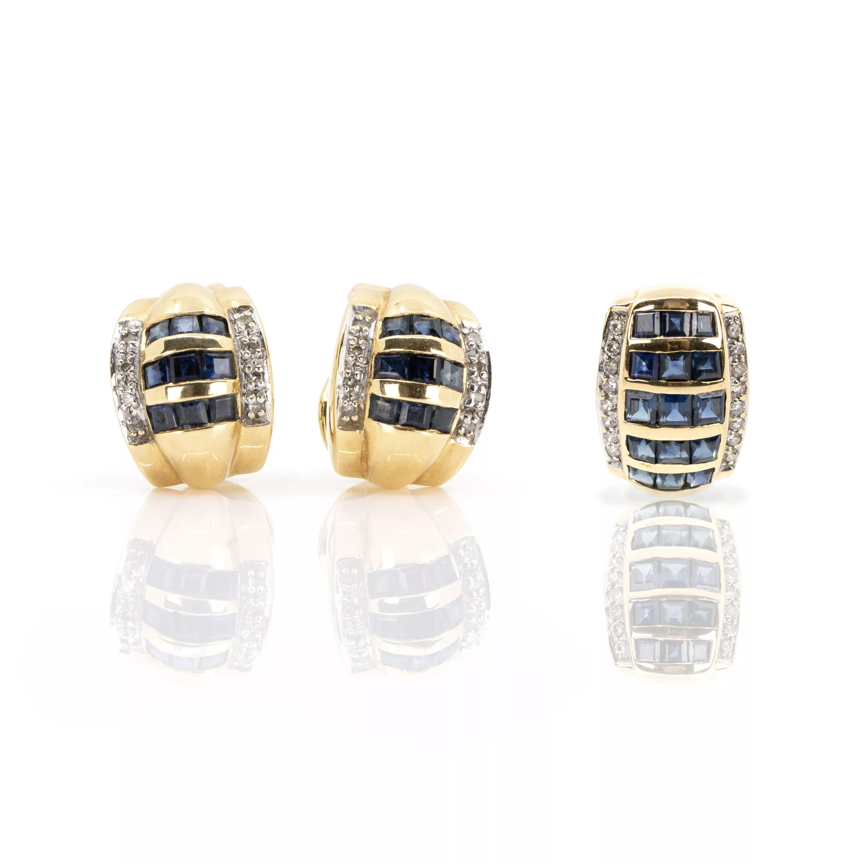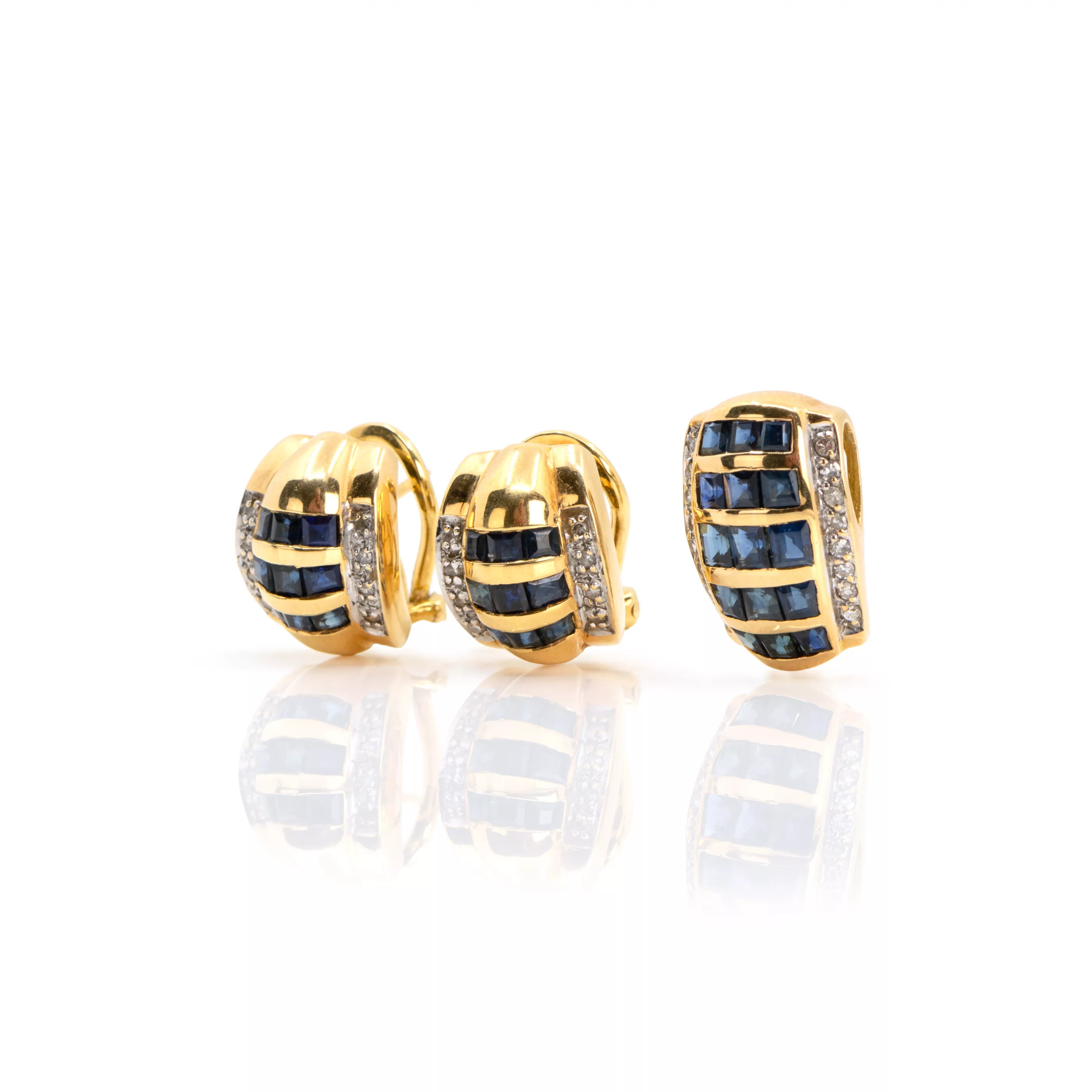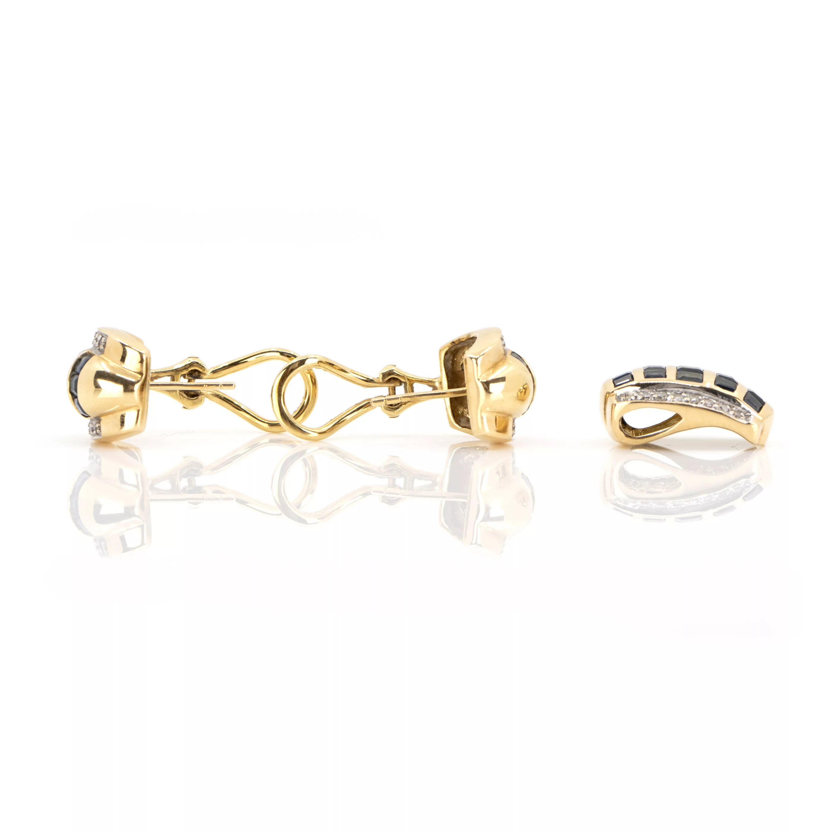 750 yellow gold, hallmarked, pair of ear clips with 16 brilliant-cut diamonds and 18 caree-cut sapphires, sapphires total approx. 2.00 ct, pendant with 16 brilliant-cut diamonds and 15 caree-cut sapphires, 1.80 ct, length of ear clips 1.3 cm, length of pendant 1.6 cm, total weight approx. 11.4 g