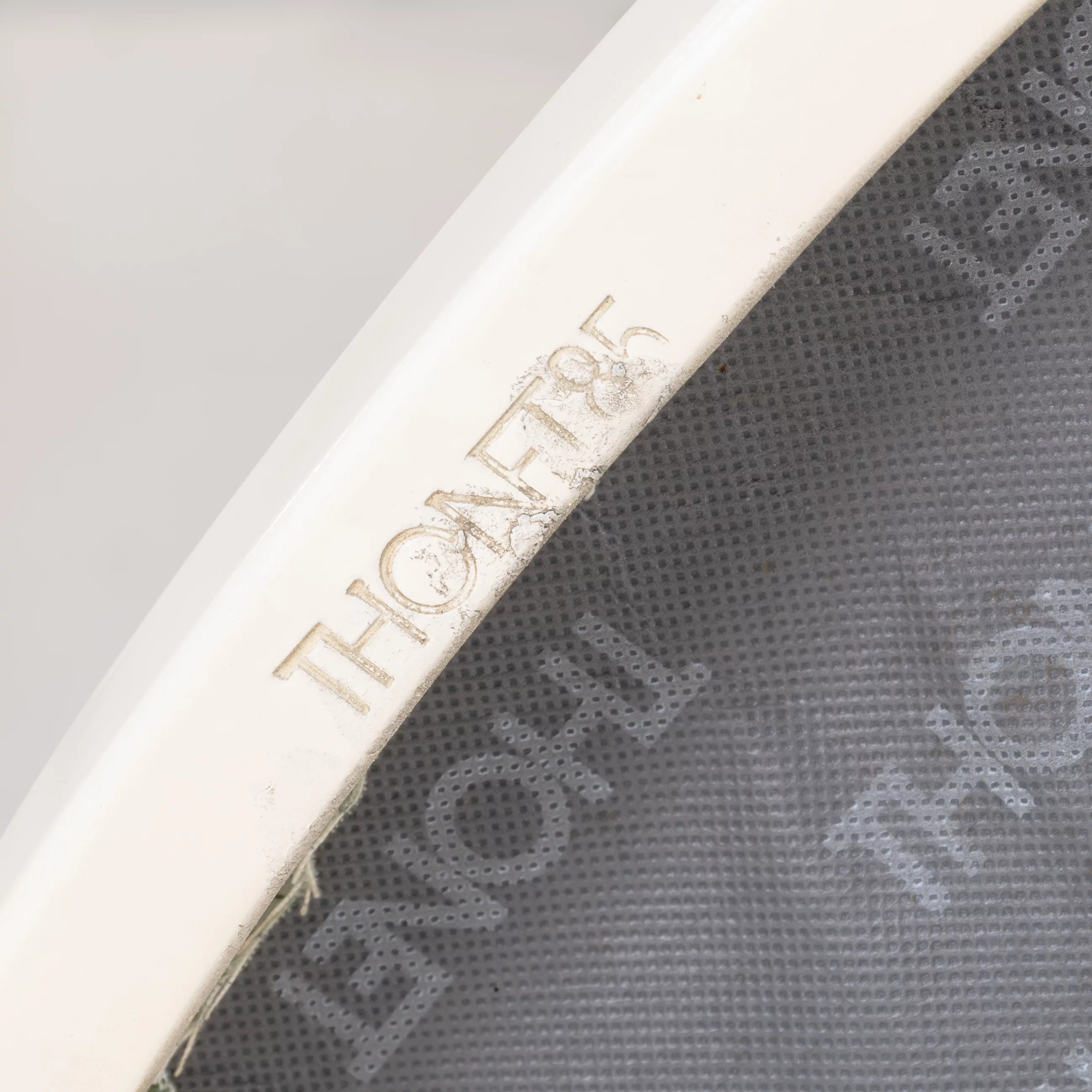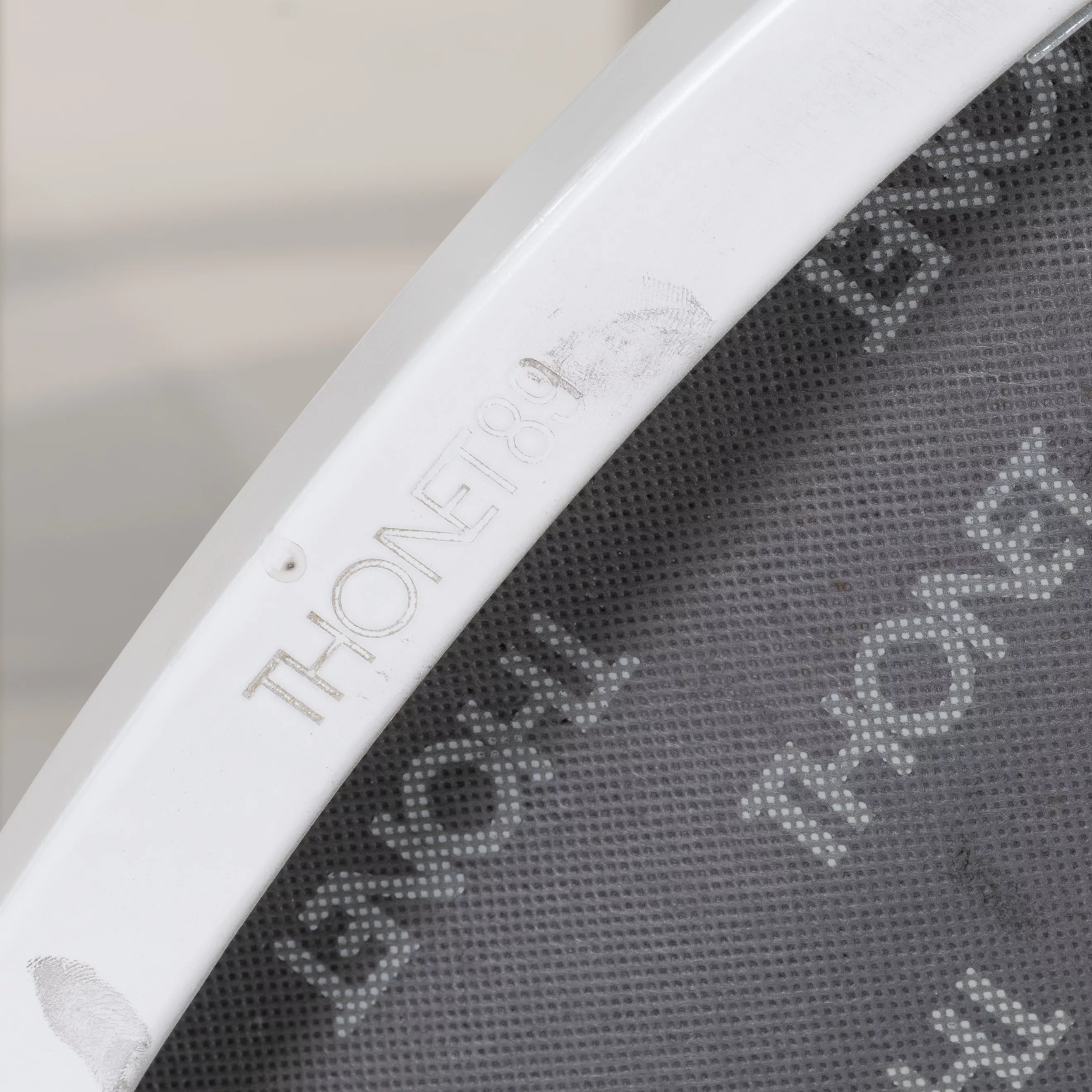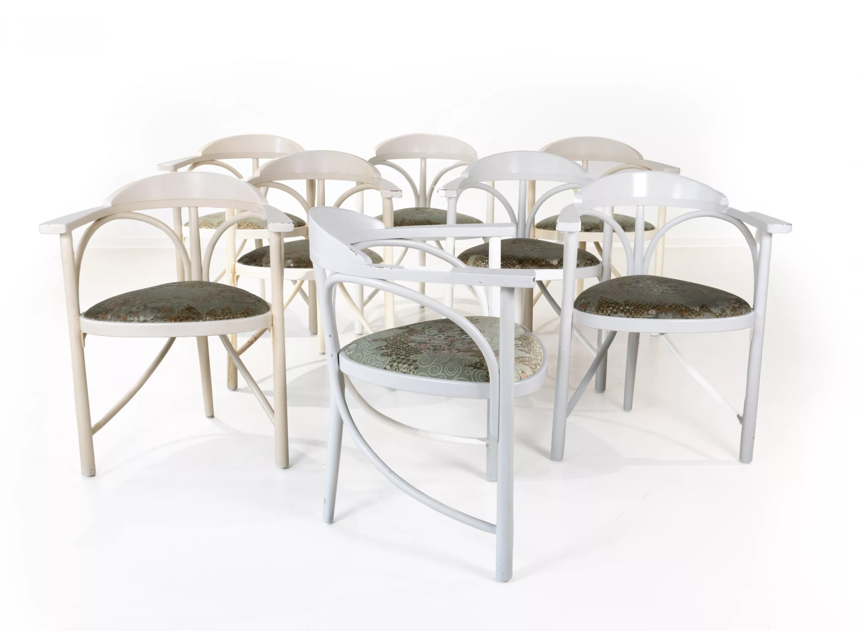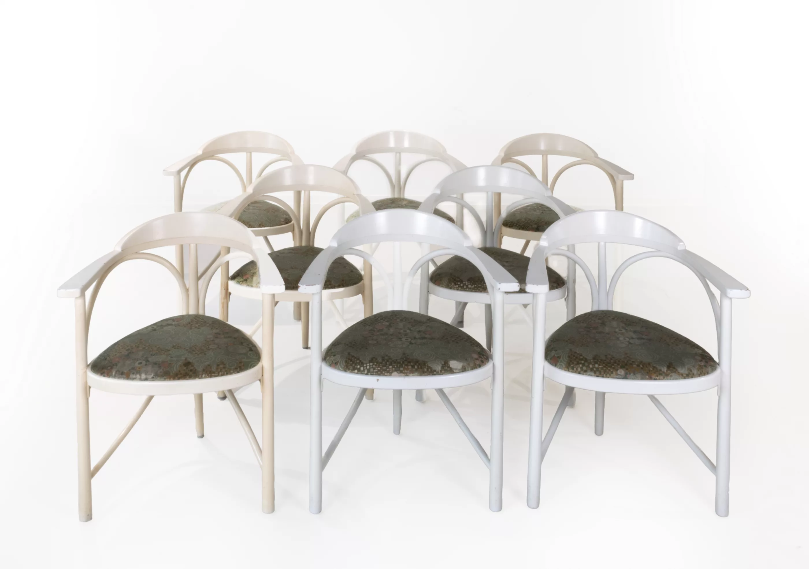 8 pcs, Thonet, Frankenberg, 20th century, designed by the Thonet brothers in the 1880s, wood, fabric, each covered with Thonet emblem fabric on the underside, three chairs marked Thonet 85, two marked Thonet 89, two marked Thonet 90 on the underside, height 79 cm, seat height 48 cm, condition C, signs of age and wear, chipped paint and traces of handles, white lacquer slightly yellowed in places