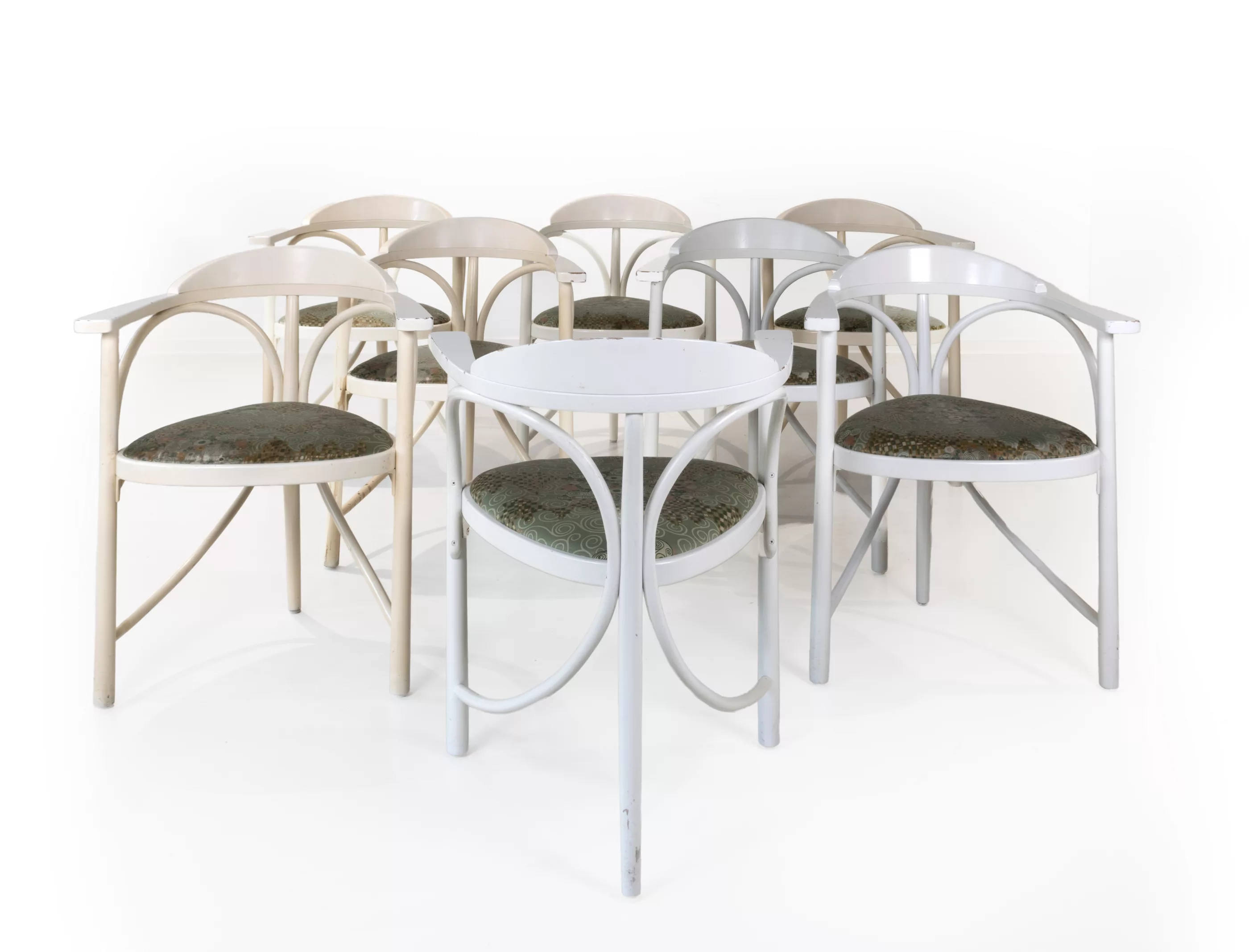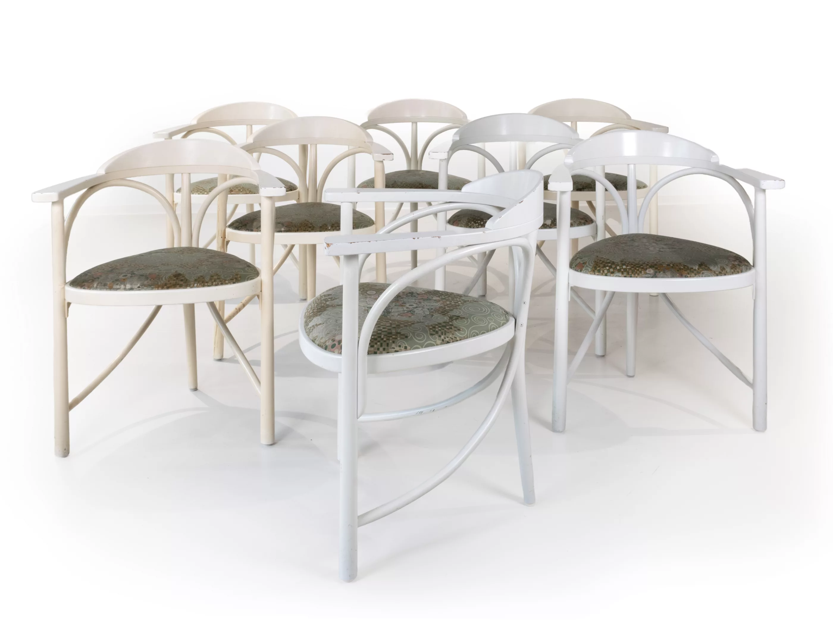 8-tlg., Thonet, Frankenberg, 20. Jh., Entwurf von den Gebrüdern Thonet aus den 1880er Jahren, Holz, Stoff, unterseitig jeweils mit Thonet-Emblem-Stoff bezogen, drei Stühle mit Thonet 85, zwei mit Thonet 89, zwei mit Thonet 90 unterseitig gekennzeichnet, Höhe 79 cm, Sitzhöhe 48 cm, Zustand C, Alters- und Gebrauchsspuren, Farbabplatzer und Griffspuren, weißer Lack teils leicht vergilbt
