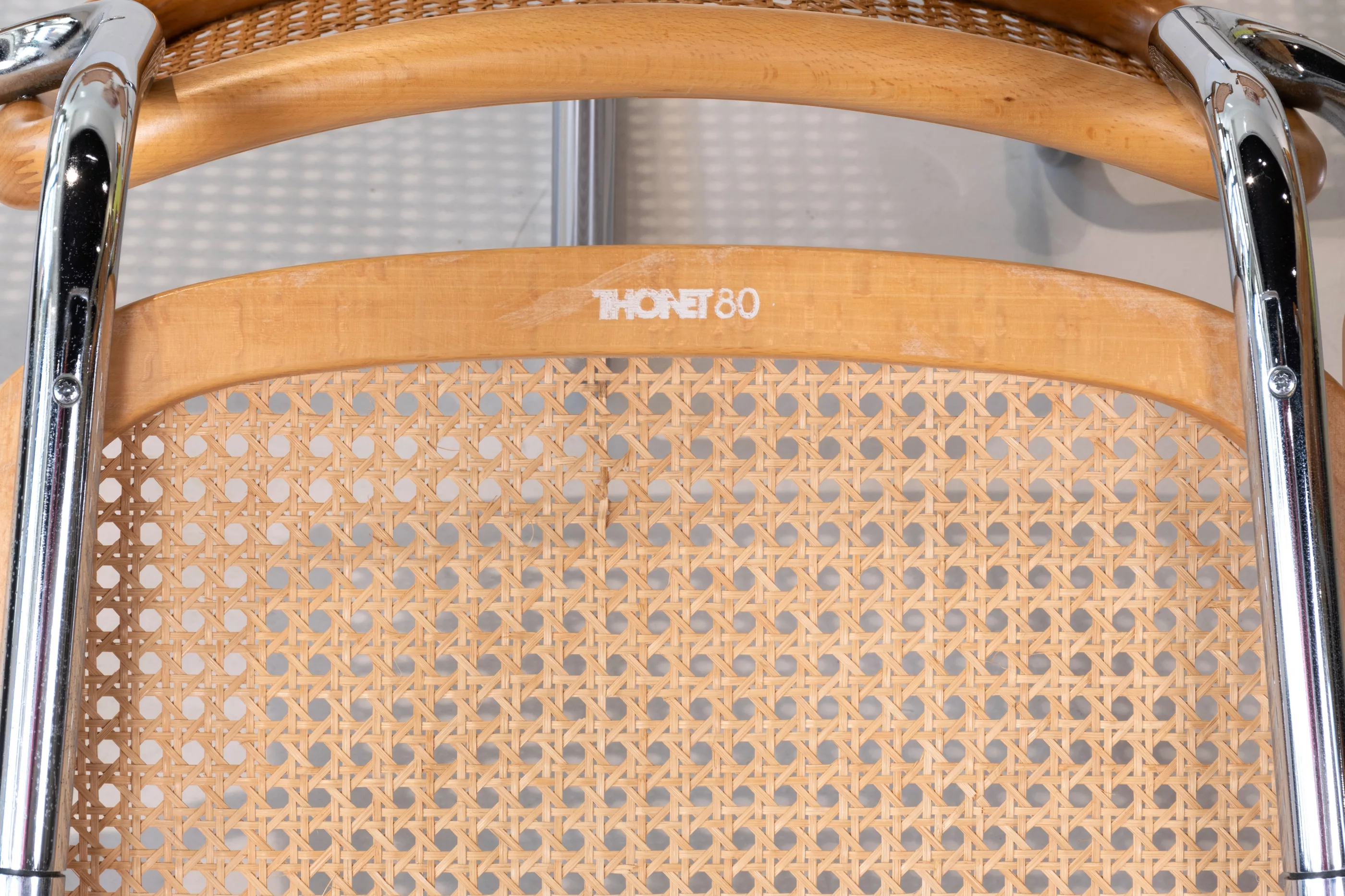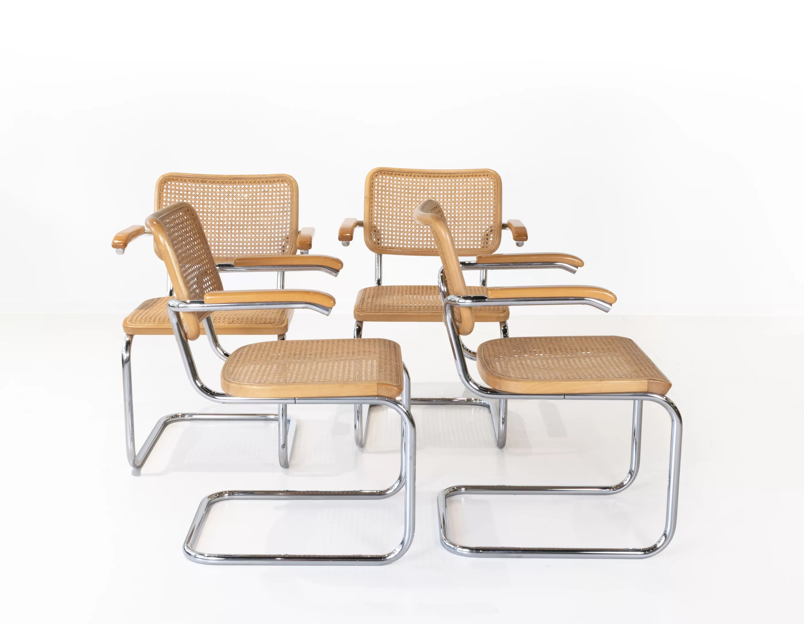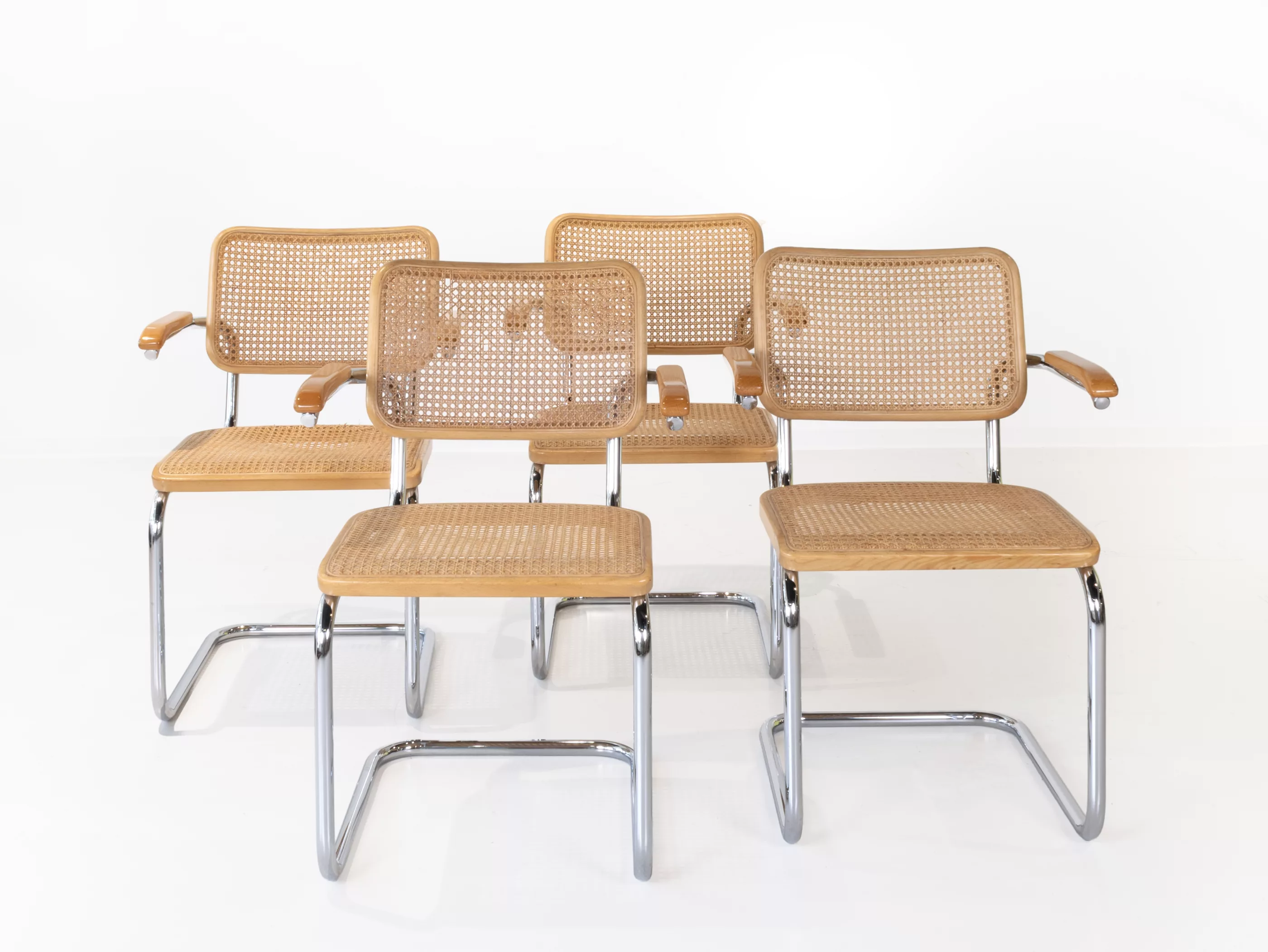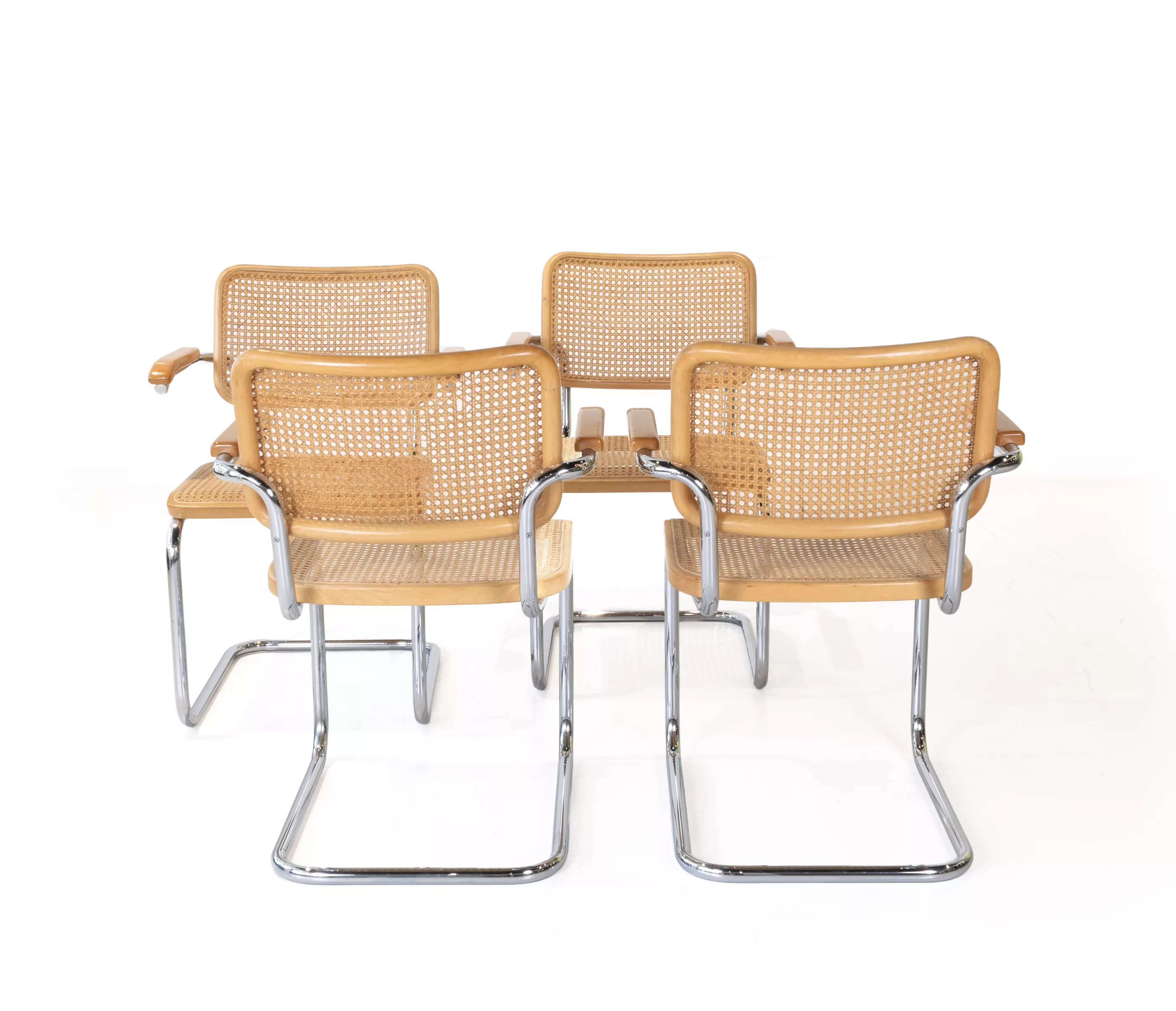 4-tlg., Thonet, Frankenberg, Entwurf von Marcel Breuer (1902-1981), jeweils Buche, klar lackiert, Wiener Geflecht, Stahlrohr, verchromt, jeweils unterseitig mit Prägestempel Thonet80, bei drei Stühlen Aufkleber des Händlers 'pesch wohnen', 79,5 x 57 x 54 cm, Sitzhöhe 44 cm, Zustand B, leichte Gebrauchsspuren, Geflecht partiell gebrochen
