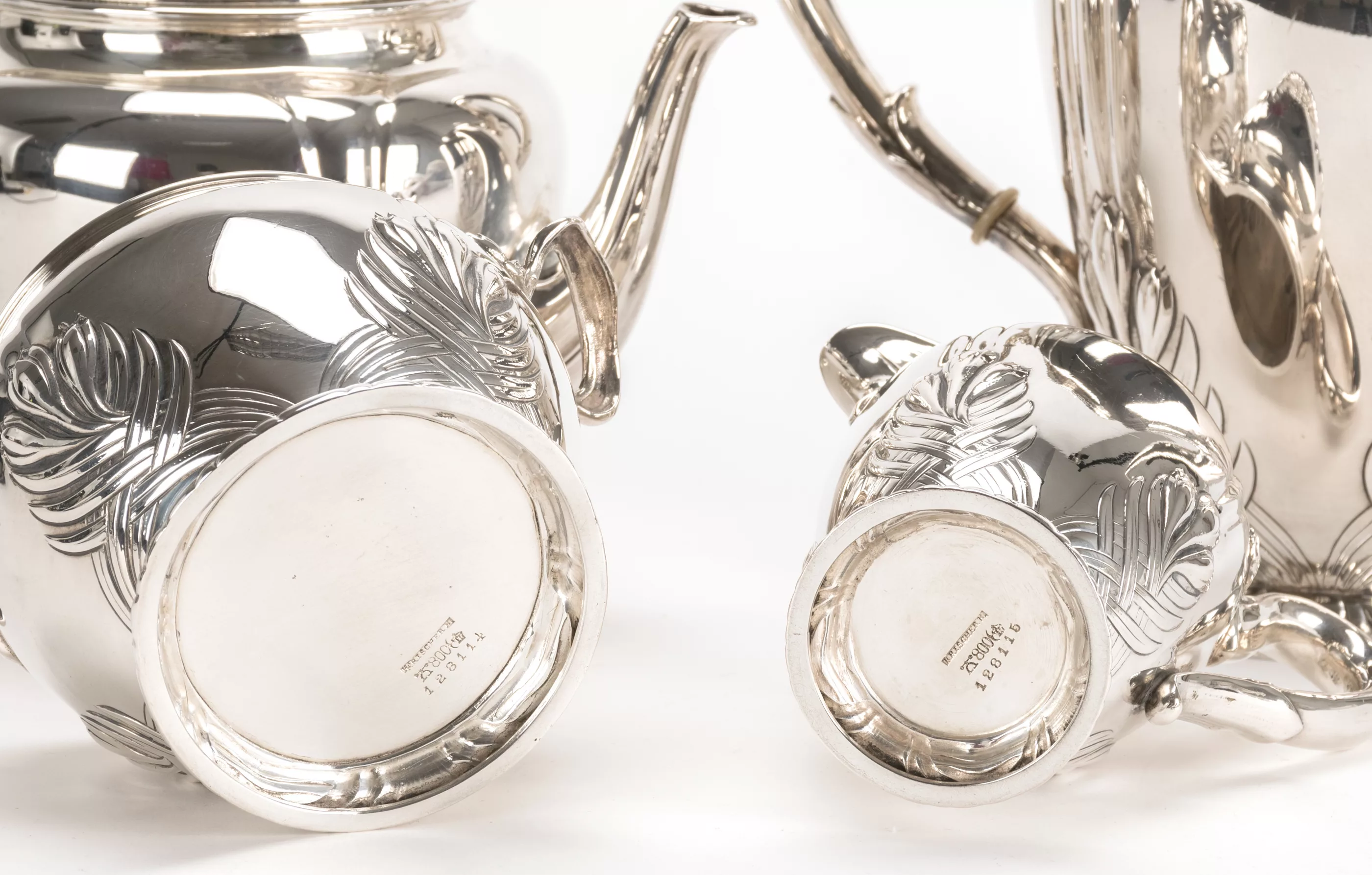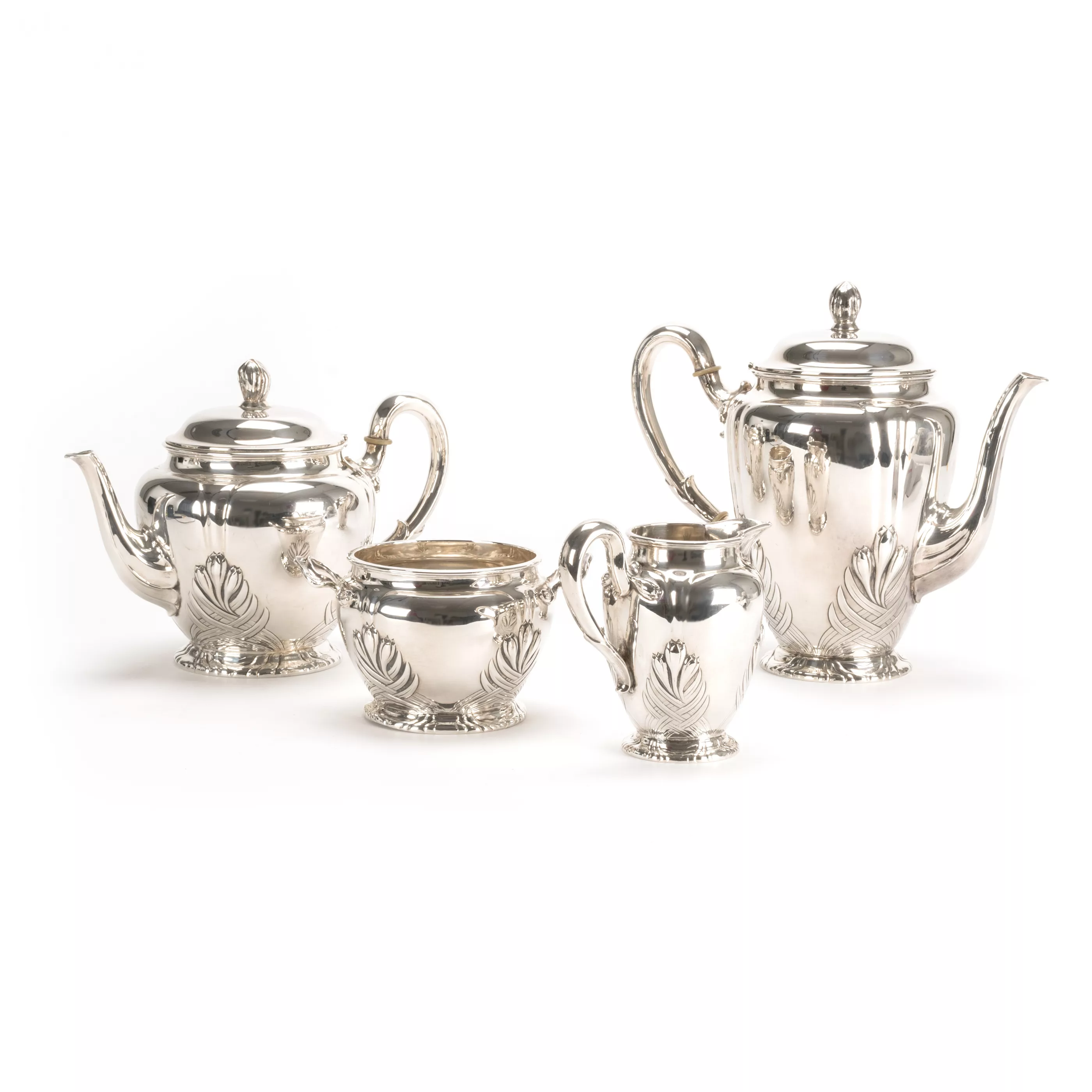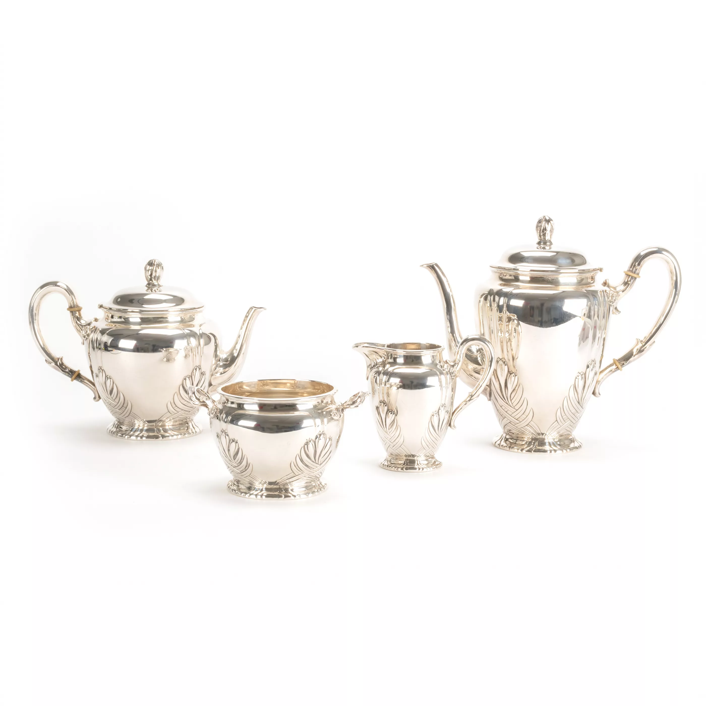 4-tlg., Wilkens, Anfang 20. Jh., 800 Silber, punziert, Manufakturmarke, Feingehalt, Halbmond und Krone, Modellnummern, Juweliersmarke Fa. Krischer Nachfahren, 1 Kaffeekanne, Höhe 21 cm, 1 Teekanne, Höhe 17 cm, 1 Milchgießer, Höhe 11,5 cm und 1 Zuckerschale, die godronierten Wandungen mit Blumendekor, Henkel der Kannen jeweils mit 2 Perlmuttscheiben, H 8,5 cm, Gesamtgewicht ca. 1.664,4 g